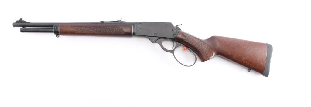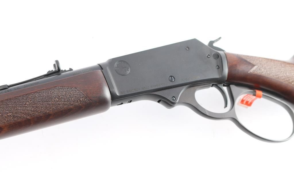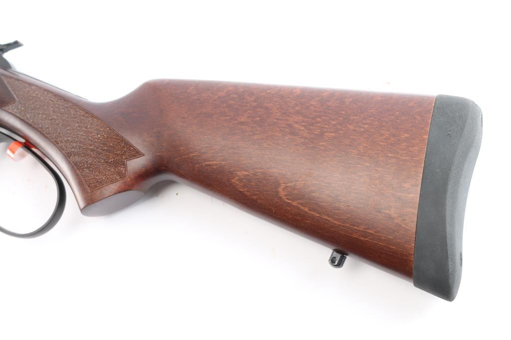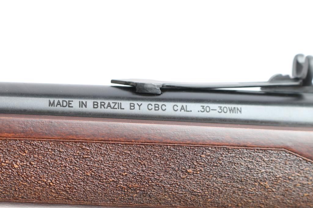 Brazillian made copy of the Marlin 1895, a centerfire lever action carbine chambered for .30-30 Winchester, and introduced in 2023. Imported by Braztech International L.C. out of Bainbridge, GA. Rifle features a blued finish, a 16-1/2" round hammer forged barrel, dovetailed raised blade front sight, elevation adjustable buckhorn rear sight, smooth curved trigger, external hammer with serrated spur, annular cut push-button safety, large lever loop, grip safety, side eject, and flat top receiver that is drilled and tapped for optic mounting. The walnut furniture consists of a semi-pistol grip shoulder stock wth stippling at the wrist, sling stud on the buttstock, solid rubber recoil pad, stippled forend, and sling eye on forend endcap. The original blued finish retained is approximately 99% with nothing remarkable. Metal displays no rust or deformation. The action is smooth and crisp, and the bore is bright with strong rifling. The walnut furniture is also in excellent condition. This rifle includes the original factory cardboard box with end label, owner's manual, and a lock.