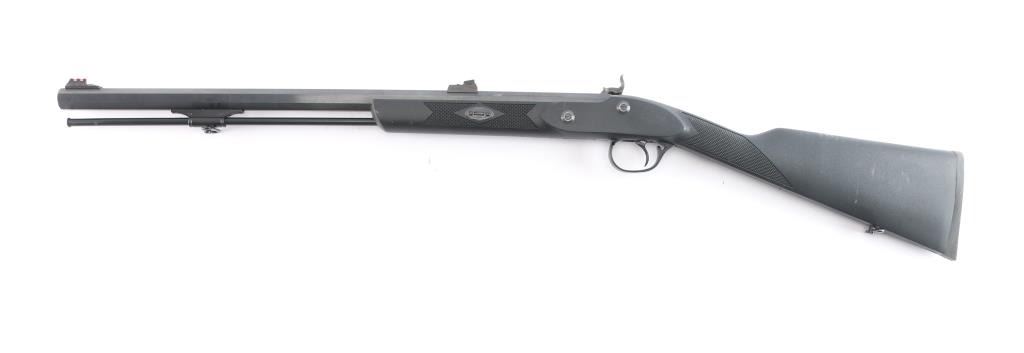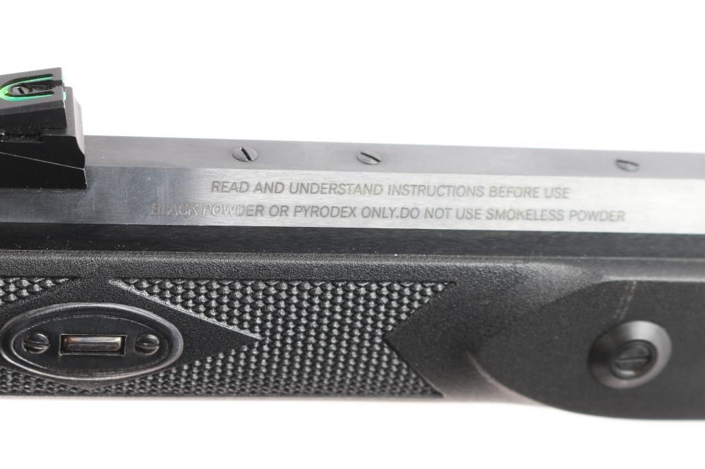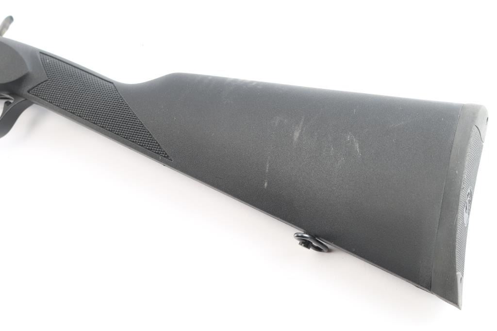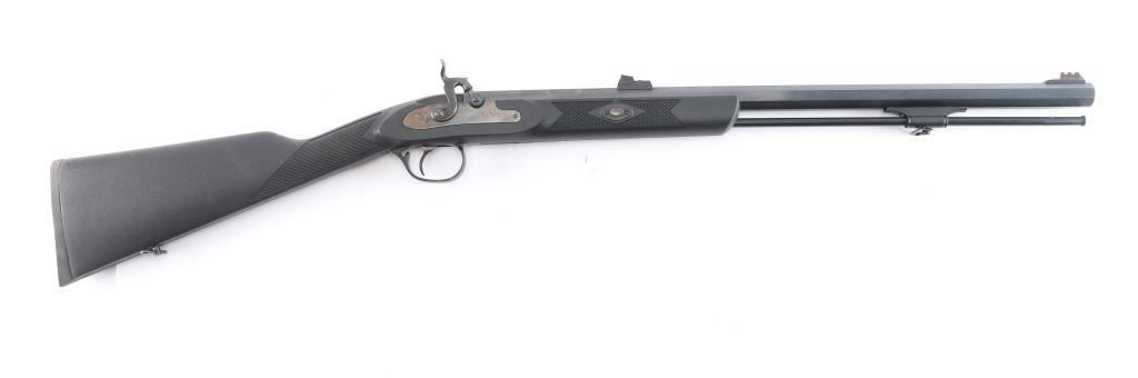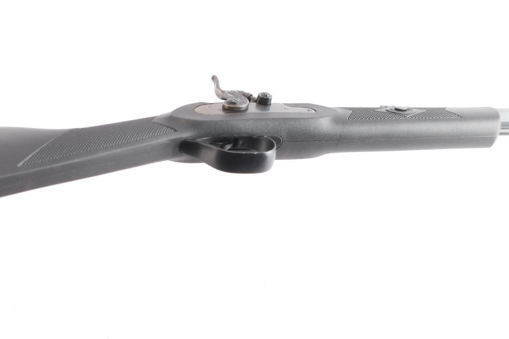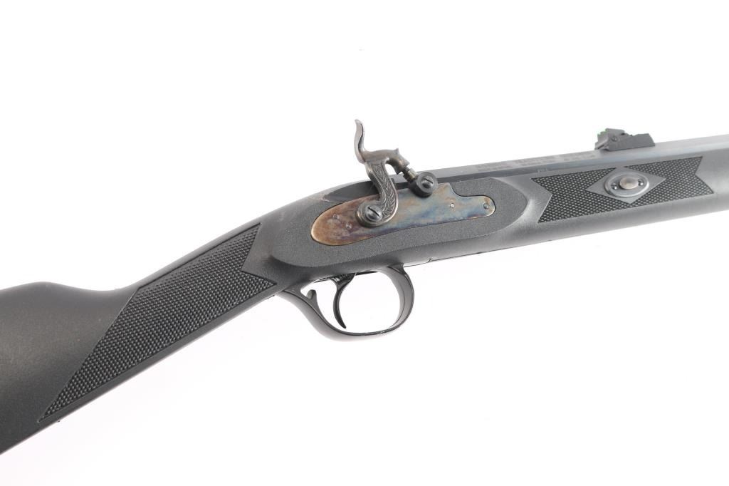 Spanish made percussion black powder muzzleloading rifle with a .50 Caliber bore. Imported by Traditions out of Old Saybrook, CT. Rifle features a blued finish, a 24" octagonal barrel, fully adjustable green fiber optic rear sight, red fiber optic front sight, smooth curved trigger, serrated hammer spur, plastic ramrod under barrel, barrel drilled and tapped for optics, sling swivel in the bottom of the shoulder stock, aluminum thimble with sling swivel, aluminum trigger guard, case-colored hammer, case-colored wedge and lock plate, black synthetic furniture with a checkered straight gripped stock, checkered forend, and checkered black rubber recoil pad. The original blued finish retained is approximately 99% with superficial scratches, and a rub mark on the bottom of the barrel from the ram rod. There is minimal edge wear on the aluminum trigger guard. Metal displays no rust or deformation. Bore is bright with strong rifling, and the action works well. The black polymer furniture is excellent with very minor handling marks.