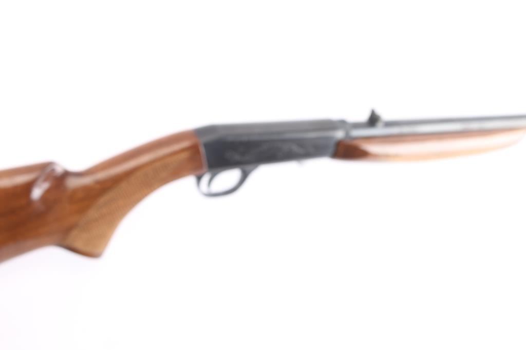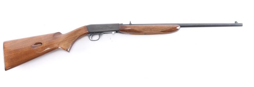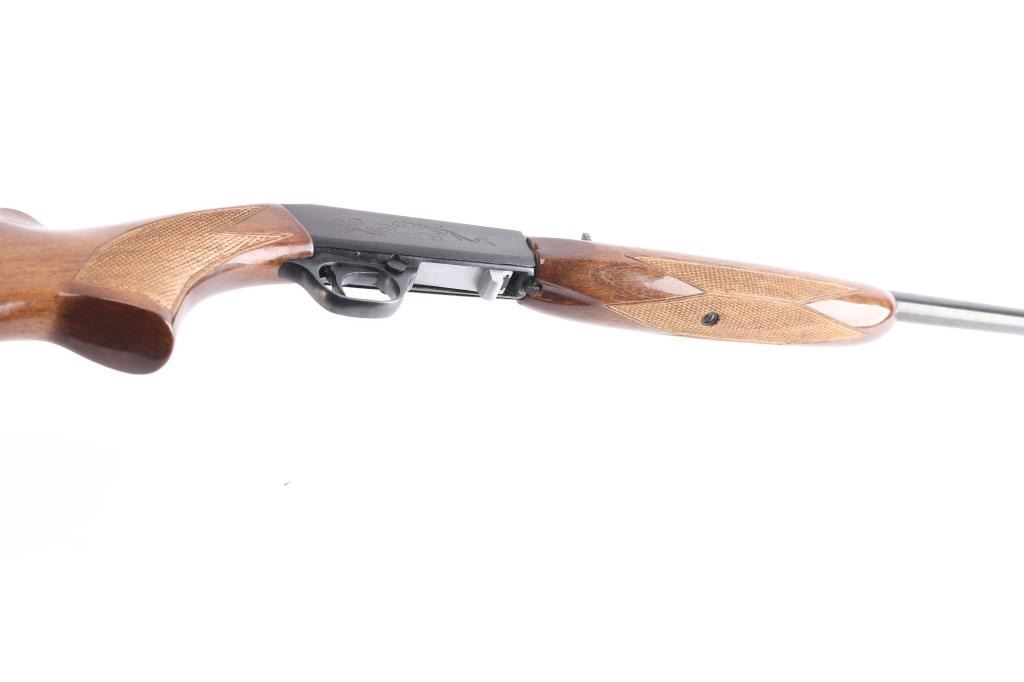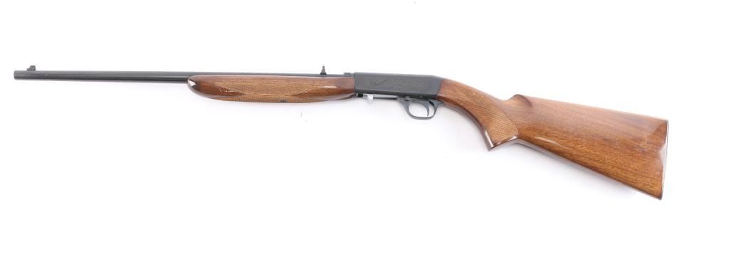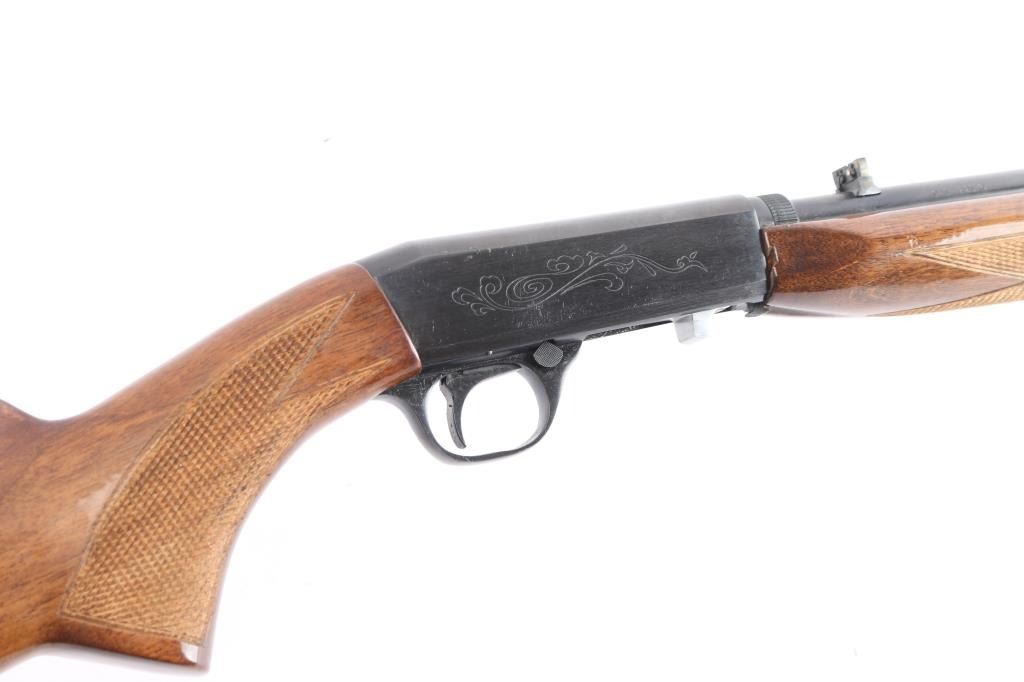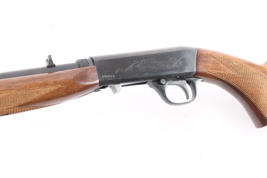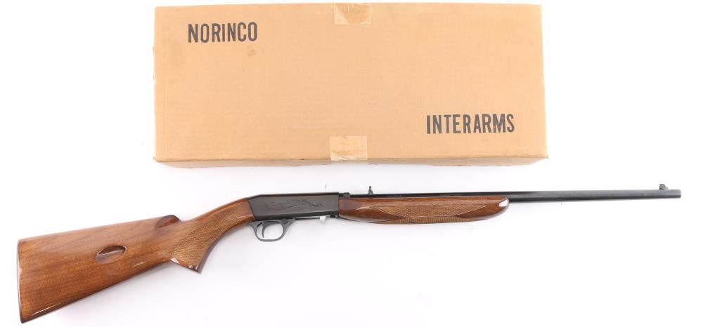 Chinese made semi-automatic rimfire take-down rifle chambered for .22 Long Rifle. Manufactured from 1987 until 1999, and imported by Interarms, Alexandria, VA (Marked on the left side of the barrel). This rifle is based on the Browning SA-22 design. Rifle features a blued finish, a 19" barrel, barrel drilled and tapped for optic mounting, dovetailed blade front sight with a brass bead, elevation adjustable 'U' notched rear sight, smooth curved trigger, eleven-round magazine capacity in stock, right-side loading in stock, bottom ejection, and checkered cross-bolt manual safety. Receiver presents a limited coverage of floral scrolls on both sides of the receiver. The high gloss hardwood furniture consists of a semi-pistol grip shoulder stock with checkering at the wrist, checkered forend, and serrated blue-steel butt plate with a magazine tube hole. Rifle retains approximately 98% of its blued finish with small handling blemishes, a scratch between the rear sight and the receiver, and some nicks by the front sight. Metal displays no rust, or deformation. The bore is bright with strong rifling. The hardwood furniture is in excellent condition with superficial scratches, and a small chip by the loading port. Rifle includes the original cardboard factory box with end label, and owner's manual.