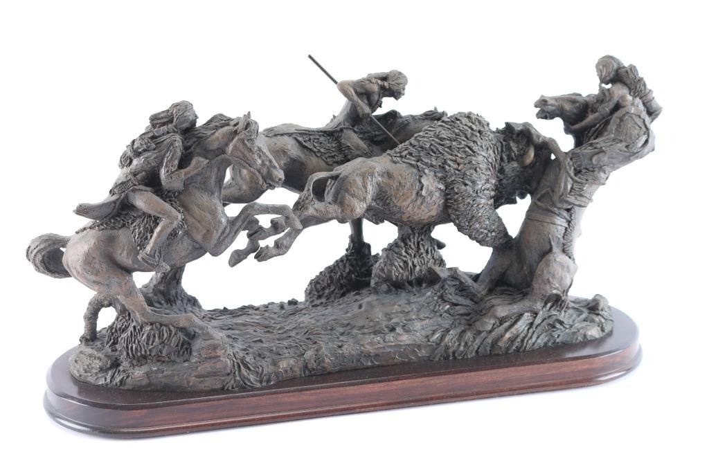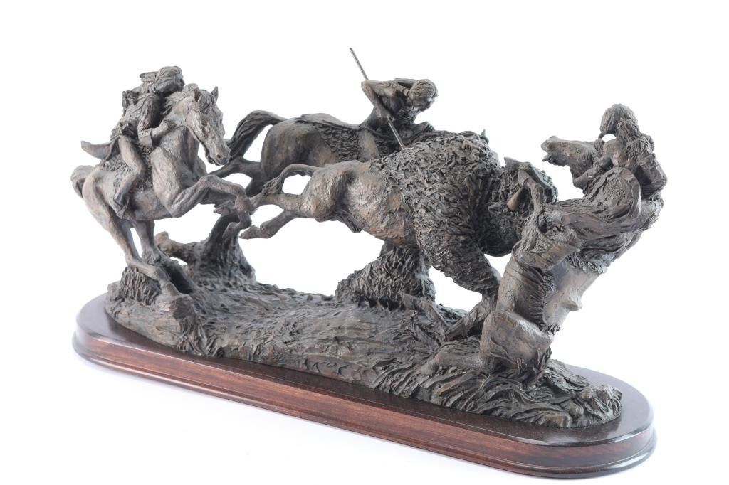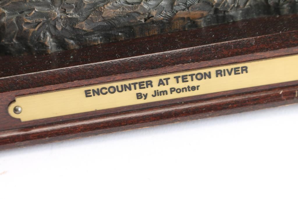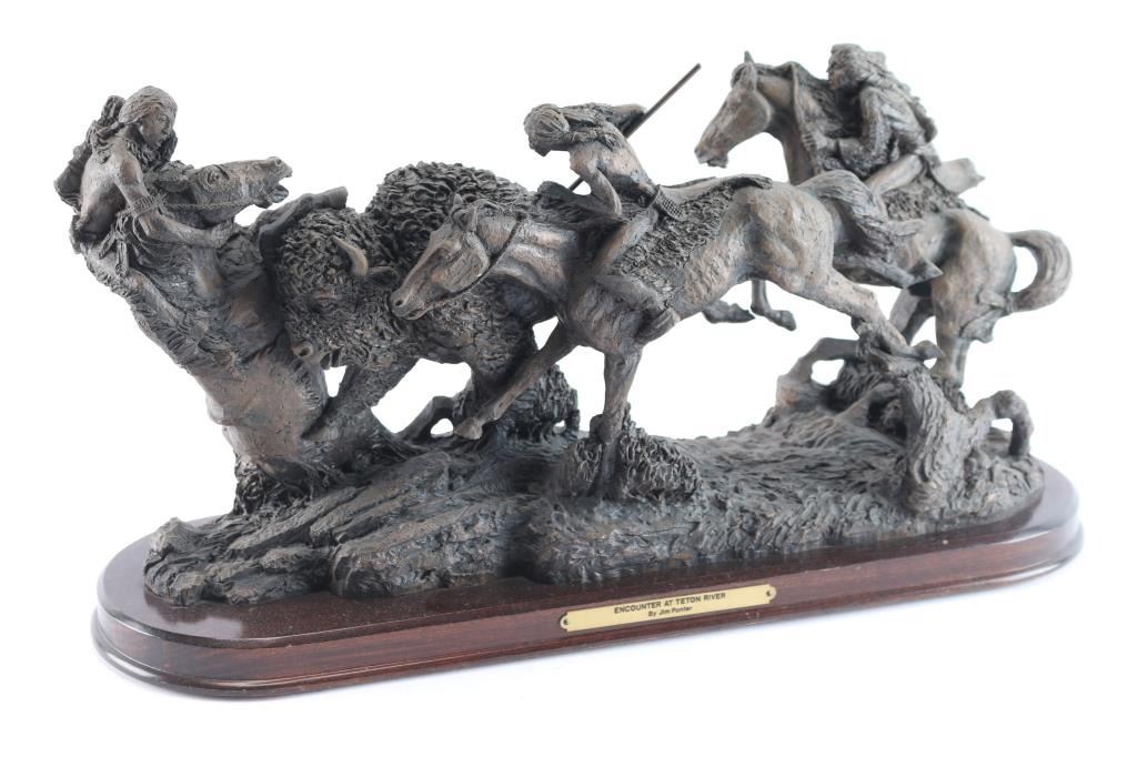 Titled "Encounter at Teton River", depicting a buffalo and Native Americans on horseback, signed Jim Ponter(1924-2007) at base, wood stand bearing plaque with title. 10" H x 19" W x 6" D.