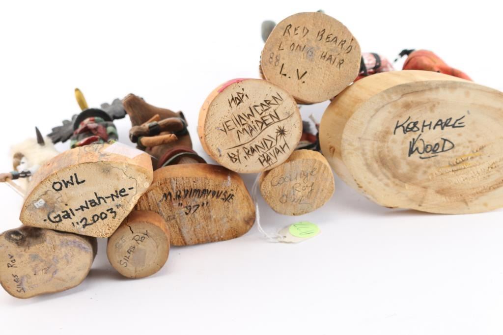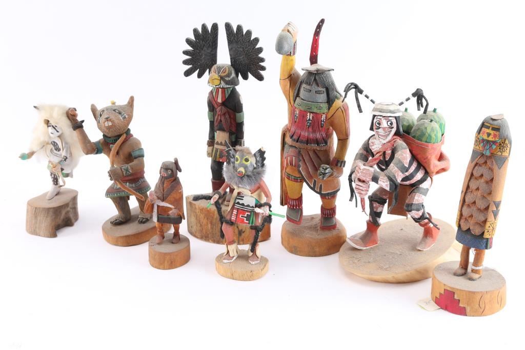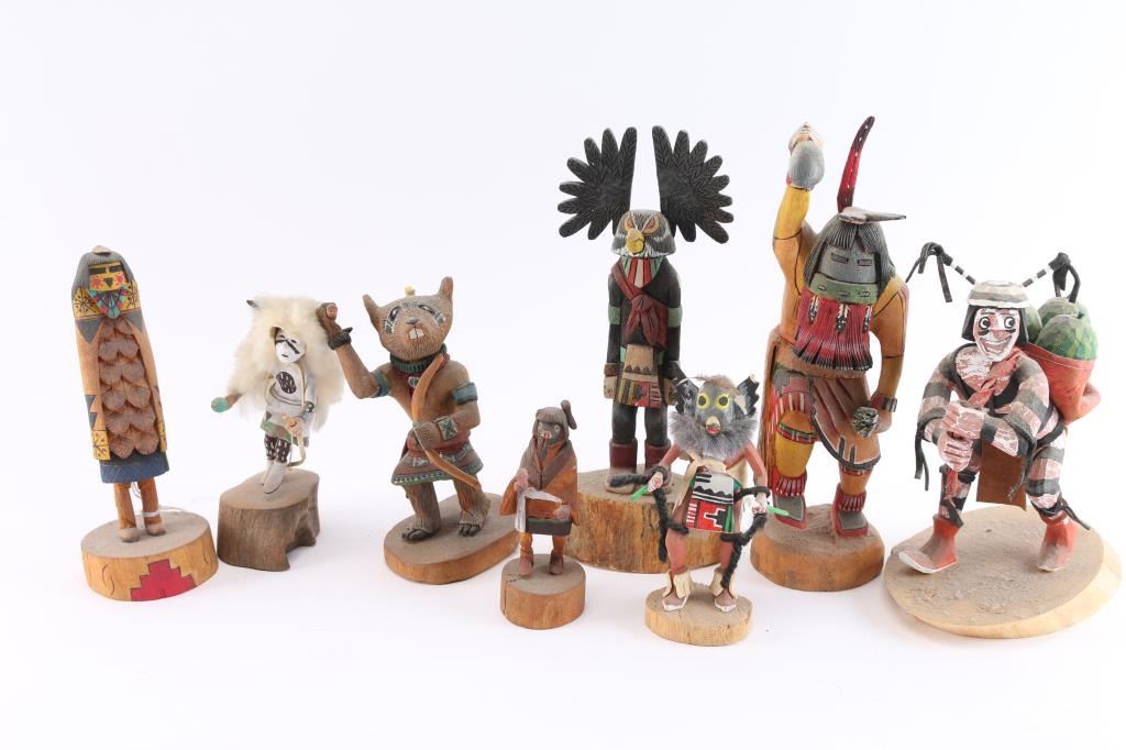 Includes: a) a Koshare kachina (sacred clown of the Hopi) carrying 3 watermelon on back, measures 6 1/2" tall; b) Owl kachina, signed by Ray Jose (also known as Gai-nah-ne), dated 2003, measures 8" tall, w/broken stick to be glued; c) Red Beard Long Hair kachina, signed L.V. '88; d) Hopi Yellowhair Maiden kachina by Randy Havah, signed on bottom, measures 6 1/2"; e) White Buffalo kachina signed by Silas Roy, measures 5"; f) Mouse kachina, signed and dated '97, has broken something from top, measures 5 1/2" tall; g) small Owl kachina signed by Coolidge Roy, measures 4 1/2", one carved ear has tiny broken piece; h) small kachina signed by Silas Roy, measures 4" tall on wood base.