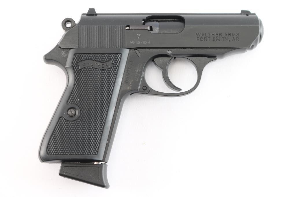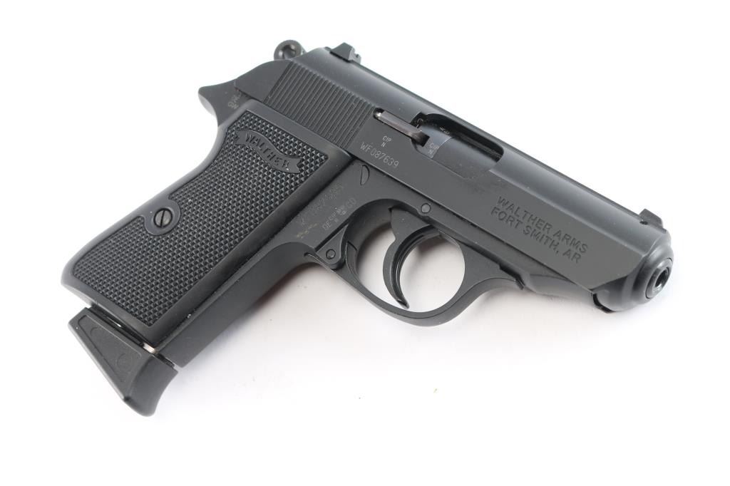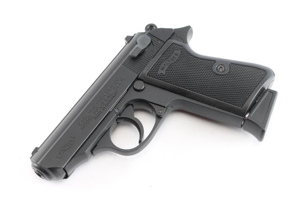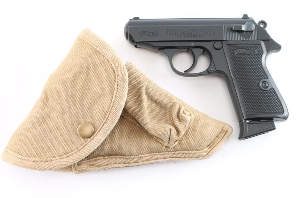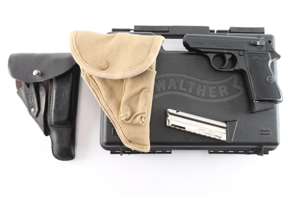 German made double action semi-automatic compact pistol chambered in .22 Long Rifle. Imported by Walther Arms of Fort Smith, A.R. with import marks on the right side of the slide. Features a matte blue finish, 3.25" barrel, blade front sight, dovetailed notch rear sight, serrated round hammer spur, thumb safety/decocker, push button magazine release, factory 10 round magazine with finger rest floorplate, serrated trigger and two-piece checkered black plastic grips with Walther banners. Includes the original factory hard case with matching label, documents, manual, lock, tools spare factory 10-rd magazine and two military/police style holsters, one black leather and one tan canvas. Pistol exhibits little to no visible wear. Action is smooth, bore is pristine and plastic grips are fine.