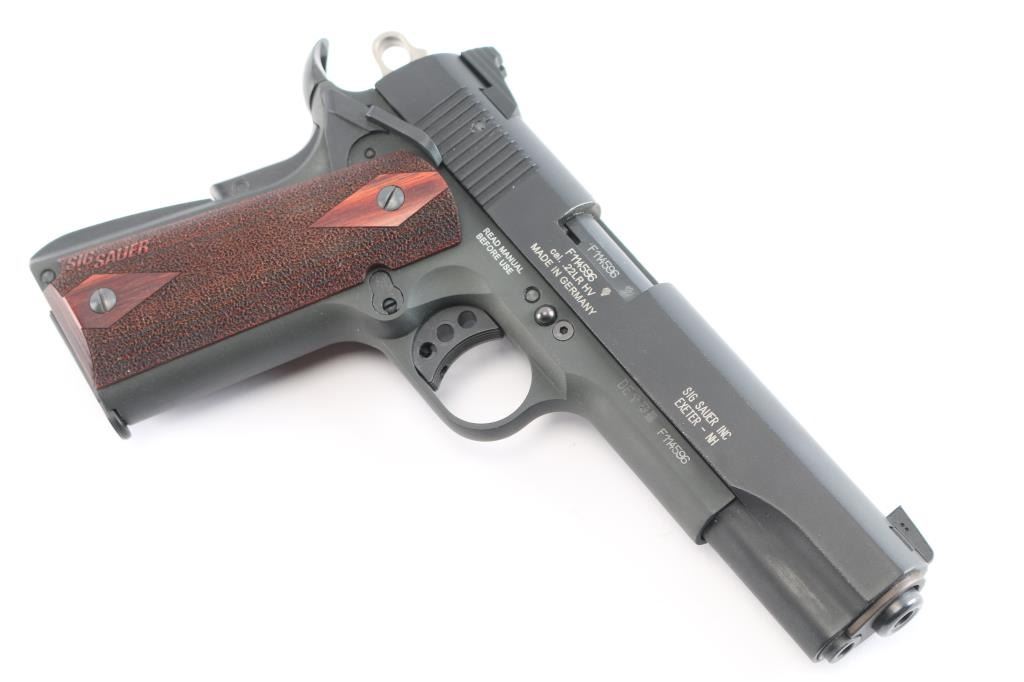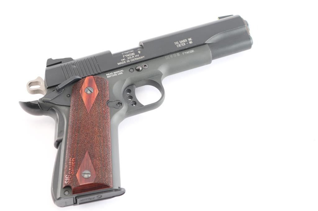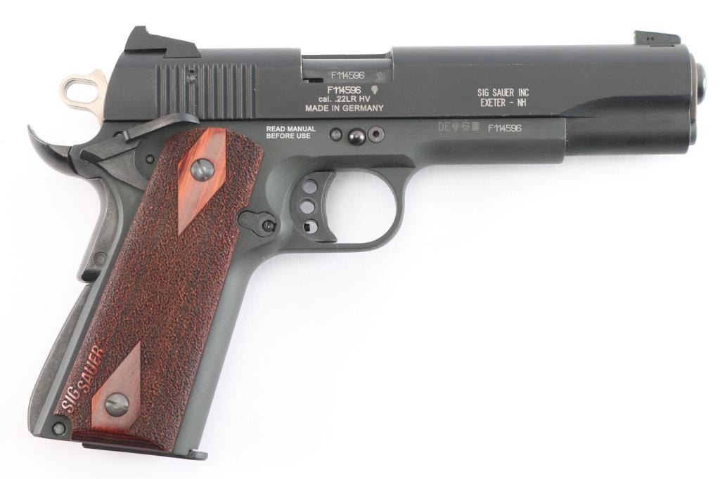 German 1911 styled semiautomatic rimfire pistol imported by Sig Sauer, Exeter NH. Features matte black finish, stippled rosewood grips, 5" barrel, dovetail mounted 3 dot sights,adjustable trigger, upswept beavertail grip safety, ambidextrous manual safety. Bore is excellent. Overall external condition is like new, with few signs of handling and use. Includes one magazine, manual, hard plastic factory case, tools/cleaning gear..