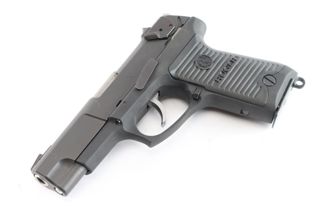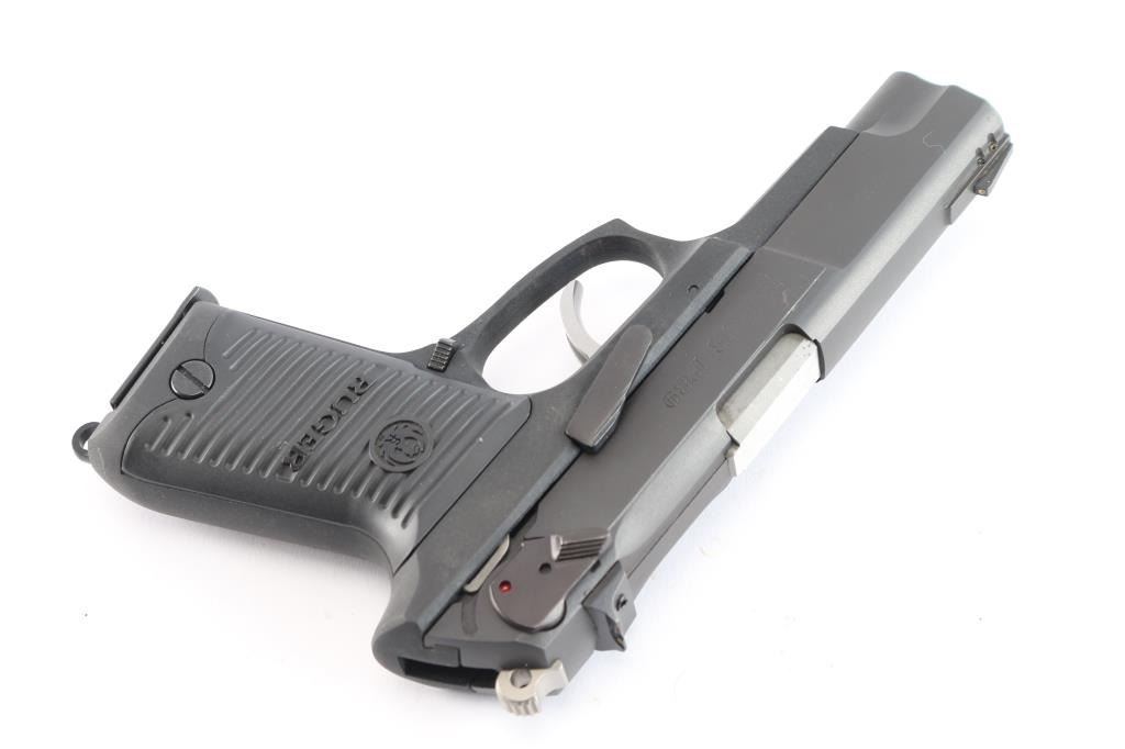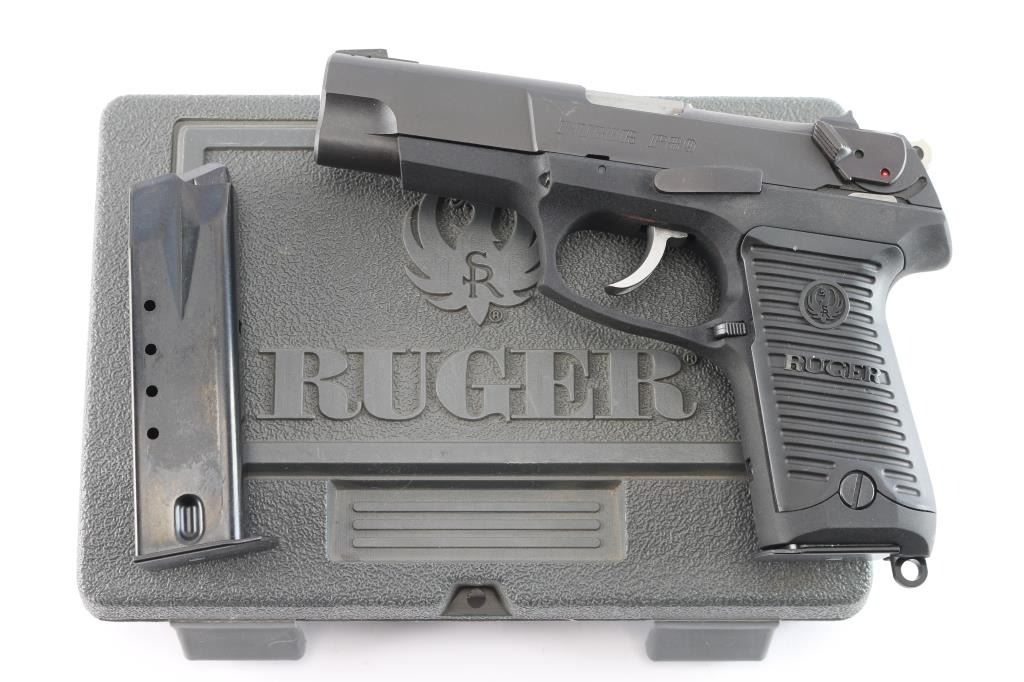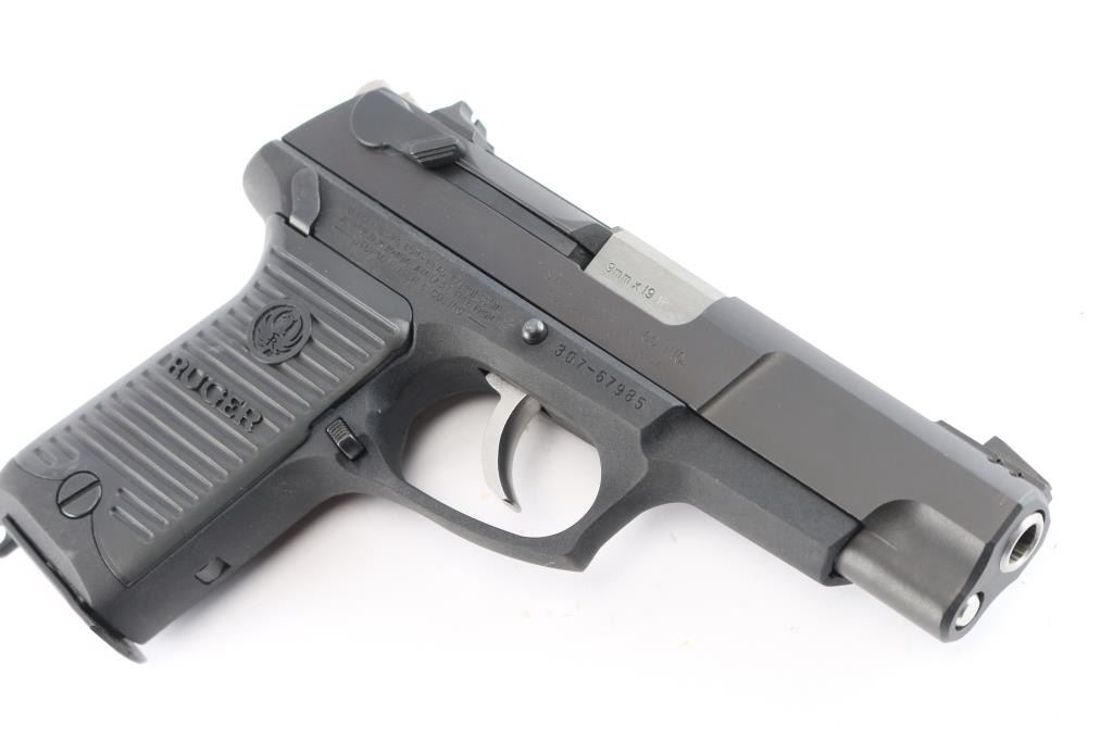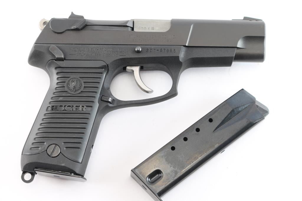 American made DA/SA hammer fired semi-automatic centerfire pistol chambered for 9x19mm, and manufactured circa 1994 in Southport, CT. Pistol features a blued finish on a stainless slide, matte black aluminum frame, 4.5" barrel, pinned blade front sight with white dot, dovetailed square notched rear sight with two white dots, full-length metal guide rod, black grooved Ruger grip panels with Ruger insignia and logo, serrated slide mounted ambidextrous safety/decocker, smooth curved trigger, smooth grip straps, serrated ambidextrous magazine release, lanyard loop on grip heel, skeletonized ring hammer, and serrated hammer spur. The original matte black finish retained is approximately 99% showing a few small blemishes. Metal displays no rust, or deformation. The action is smooth and crisp, and the bore is bright with strong rifling. The polymer grip panels are in excellent condition with one small nick on the left grip panel. Pistol includes a factory grey plastic hard case, two magazines total, and a magazine speed loader.
