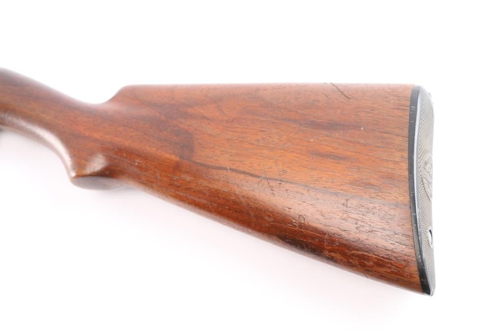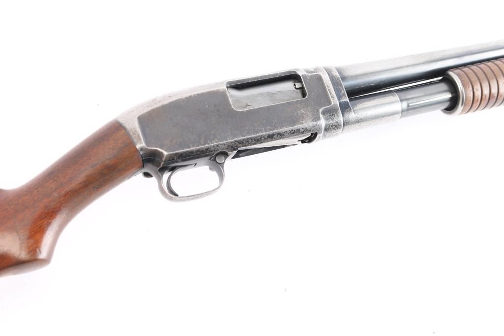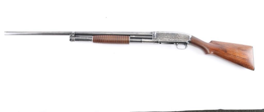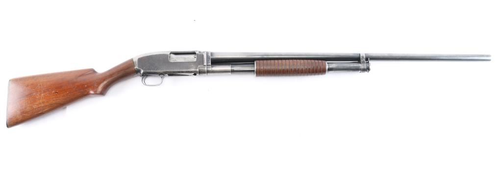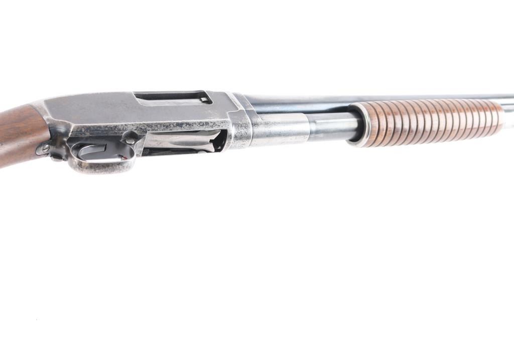 Vintage take down pump action shotgun manufactured circa 1929. Features 30" plain barrel, barrel marked "FULL" choke, brass front bead, blued finish, wood stock & pump handle, factory plastic buttplate, push button safety. Bore is very good/bright. Retains about 40% finish with edge wear, handling loss, mostly on the receiver, some darker bluing on barrel & magazine, receiver has scattered patina, pin-prick pitting. Wood is very good with minor scratches, some finish loss on the underside of the buttstock & pump handle. Numbers match on receiver & extension. (Barrel number is feint)