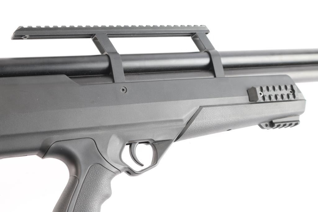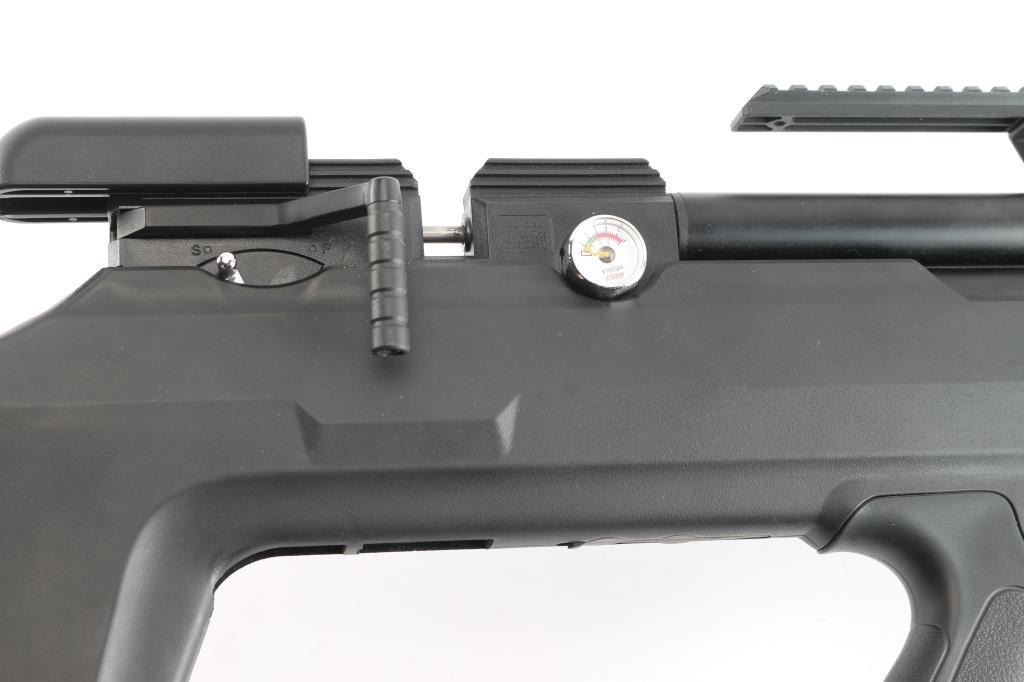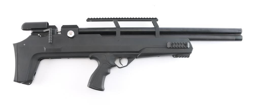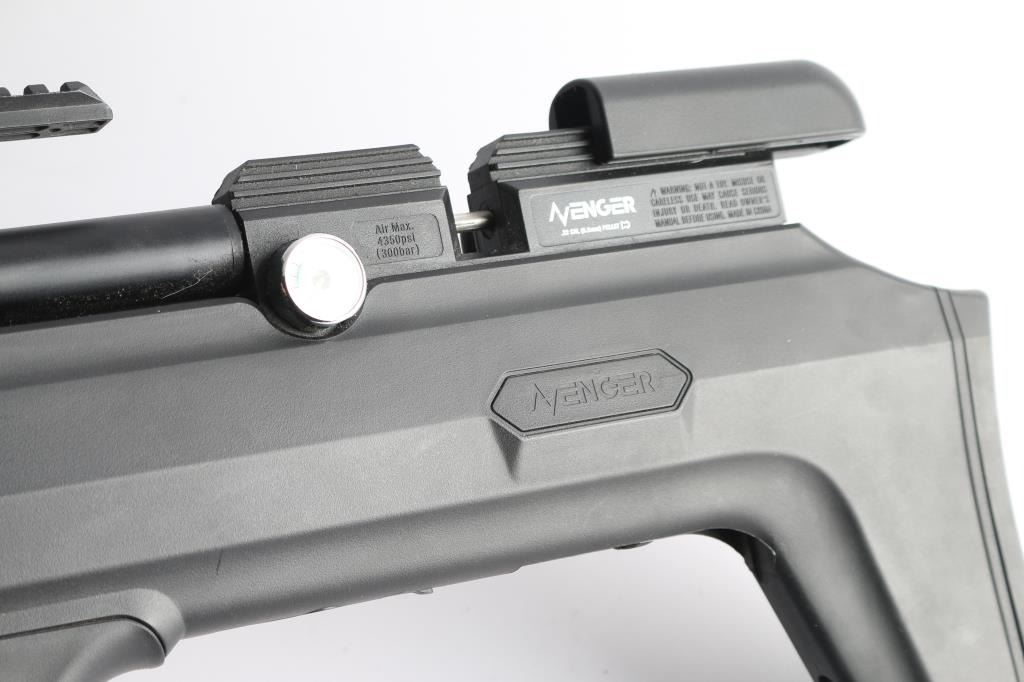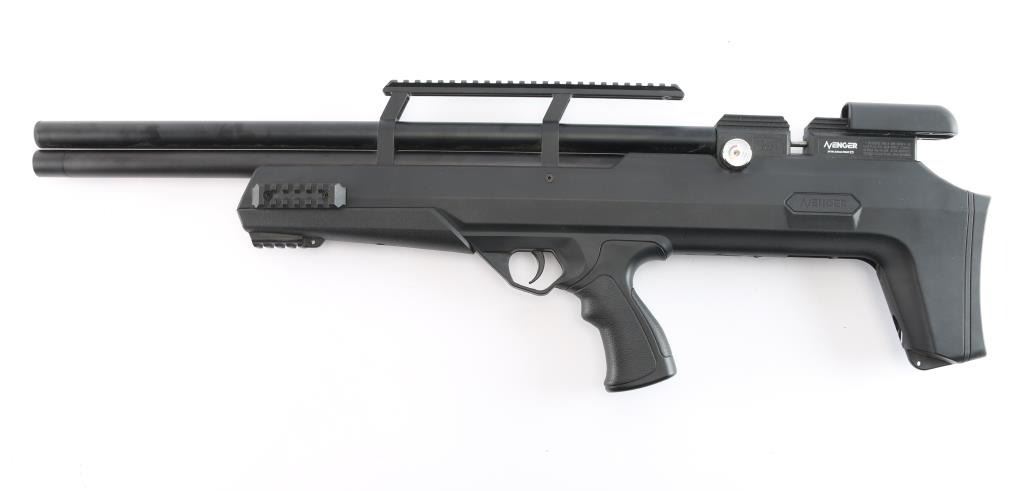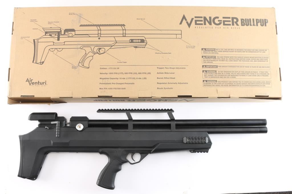 SN: 05212299501209114I. Air Venturi Avenger Bullpup II PCP Air Rifle. Precharged pneumatic, forward mounted sidelever, synthetic bullpup stock, built-in magazine storage compartments in stock, externally-adjustable regulator (up to 3,000 PSI/210 BAR), two-stage adjustable trigger, 180cc air cylinder, Max. fill pressure: 4,351 PSI (300 BAR), Max. velocity (.22), 900 FPS, fully shrouded barrel. Three Picatinny rail sections on fore-end of stock holes for sling swivel studs, vertically adjustable rubber buttpad. Dual gauges – reg. pressure (RH Side) and fill pressure (LH Side), manual safety, picatinny optics rail. Barrel length: 22.75". Overall length: 33". Magazine capacity: 10 rds. Excellent, like new condition. Comes in factory box with matching label, manual, two magazines and threaded screw-in muzzle break.
