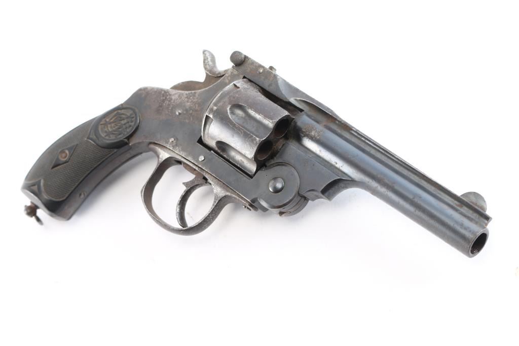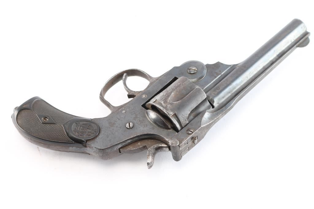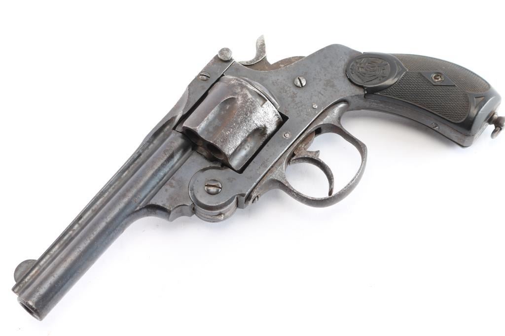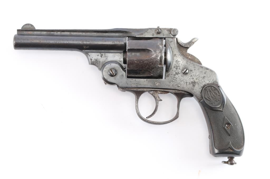 #52638 A Spanish counterfeit of a top-break double action Smith & Wesson revolver chambered for .44 Smith & Wesson, and likely manufactured in the Eibar region of Spain. It is believed that Aranzabal y Cia is the manufacturer, because they made Smith & Wesson top-break copies from the 1890's to before the start of WWII for South America. Revolver features a blued finish, a 4-1/2" ribbed barrel, fixed blade front sight, notched barrel latch rear sight, fluted six-round cylinder, smooth curved trigger, external hammer with checkered spur, firing pin on hammer nose, smooth grip straps, lanyard ring on the heel of the grip, and black checkered hard rubber grips with a logo embossed on both sides. The original blued finish retained is approximately 80% showing general thinning, edge wear, scratches, and patina. Metal displays spots of rust throughout, and pitting. There is some deformation observed in some of the screw slots. The action works, but the cylinder rotates both directions, and the hammer does not stay cocked in any position. The cylinder does seem to index correctly when the trigger is pulled. The bore is dark with rifling, and rust was observed in the barrel. The cylinder chambers are good with rust. The plastic grips are in fair condition with a crack at the top of the right grip panel, a chip at the top of the left panel, and normal handling wear.