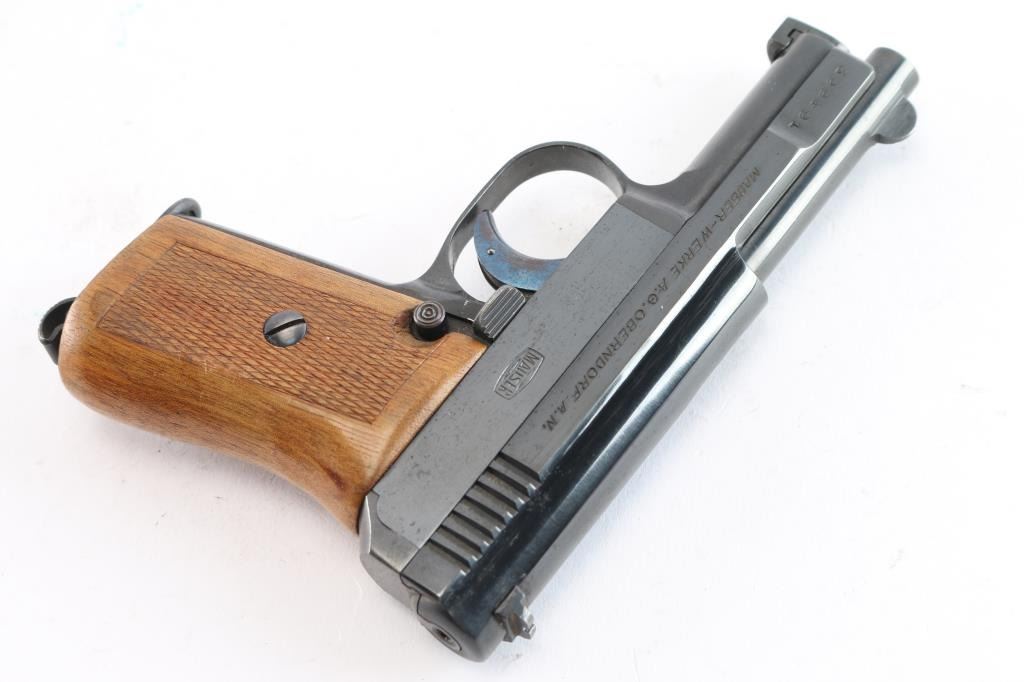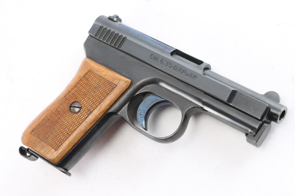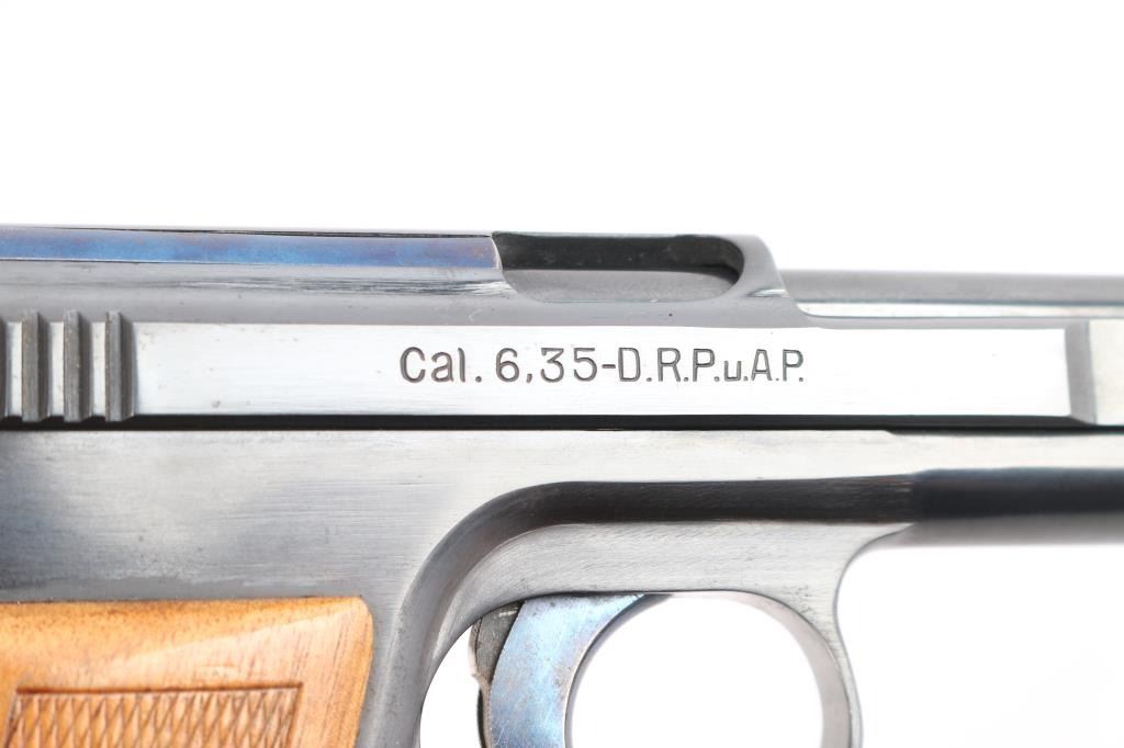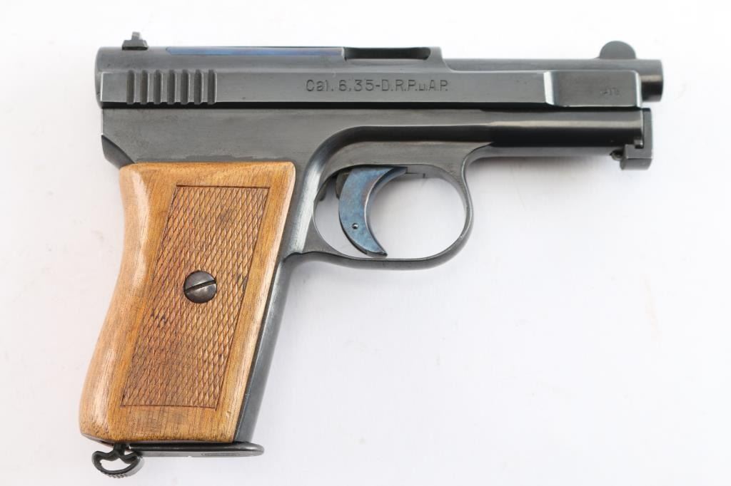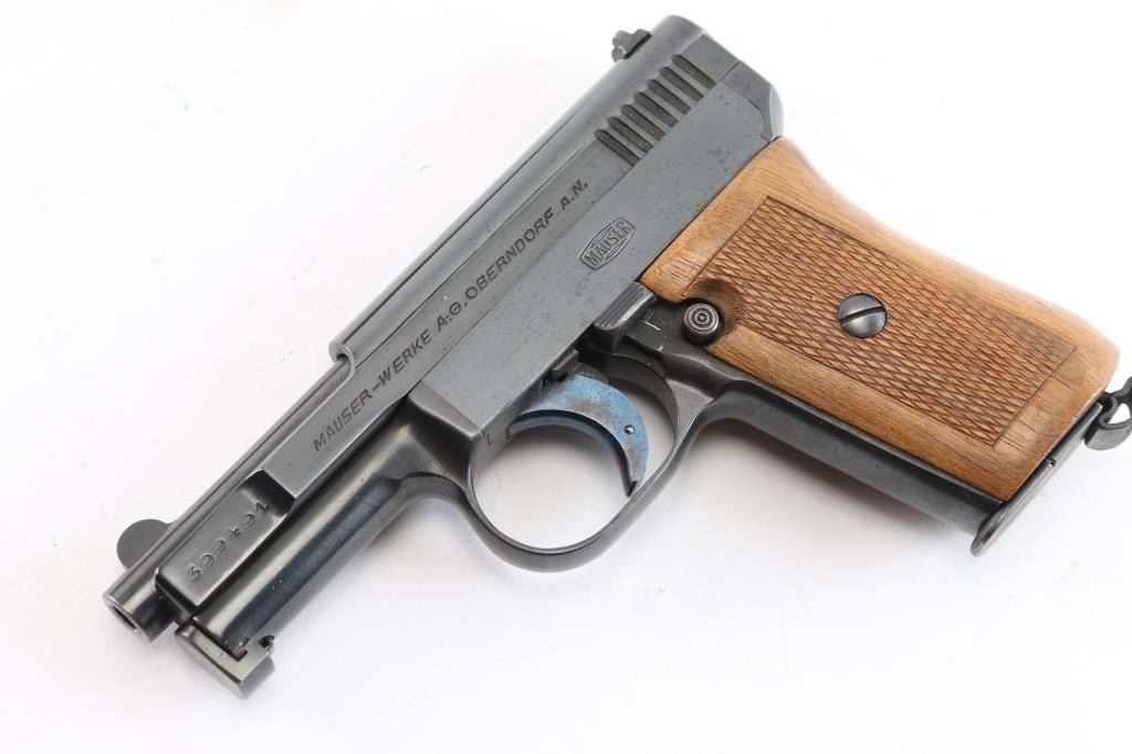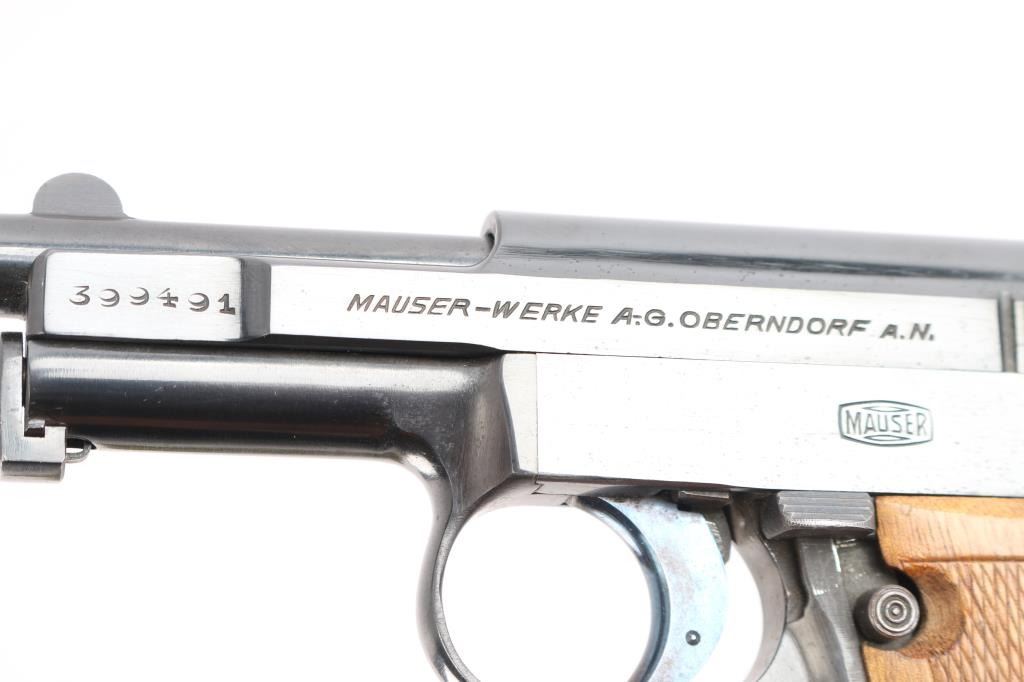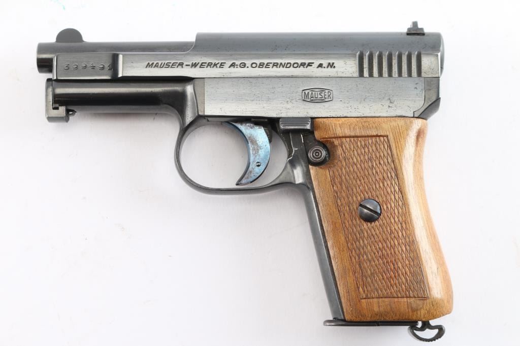 Very nice example. Vintage German pistol chambered for the 6.35mm / 25acp cartridge. Features blued finish, walnut one piece grip with checkered panels, 3" barrel, fixed sights, manual safety, heel magazine catch. Slide is marked on right side: 'Mauser-6,35', 'Crown over U' inspection stamp on right slide and barrel lug . left side of slide is marked 'WAFFENFABRIK MAUSER A -G OBERNDORF A. N.' "Mauser" Banner on left frame. Matched serial number on left slide and barrel lug. Manufactured 1919–1939: Production resumed after WWI with serial numbers starting around 200,000. Bore is very good/bright, strong rifling. Retains about 95% original blue finish with minor scratches/edge wear, the trigger retains most of it's bright nitre blue finish. Grips are excellent, action is smooth. Includes one "Mauser" marked 9 round magazine.