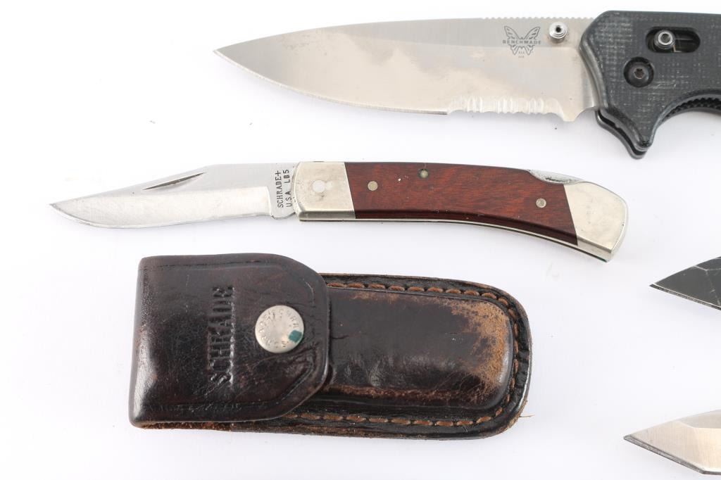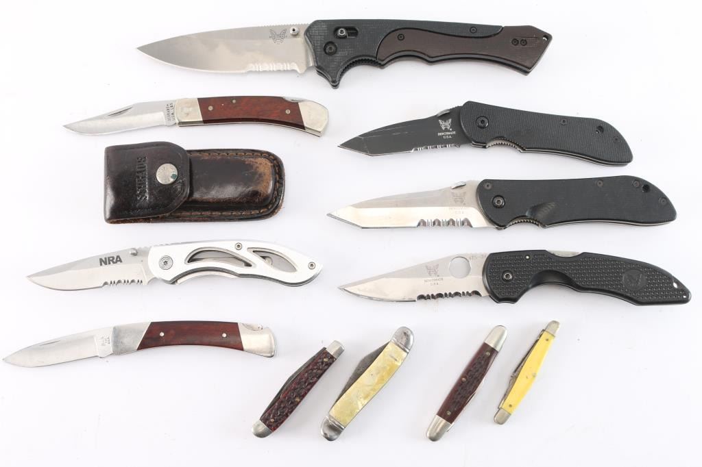 Bali-Song butterfly logo / BENCHMADE / U.S.A. ATS-34. 2) Benchmade Stryker pocketknife, designed by iconic knifemaker, Allen Elishewitz. 4 1/4' length-closed, 3" blade with thumb stud, black synthetic handles. The tanto-style blade has a BT finish and features a 1.25" serrated edge. 3) Benchmade 910 Stryker, 4 1/2"length-closed, 3 5/8" ATS-34 steal blade with thumb stud, Tanto Combo. 4) S30V Neil Blackwood design for Benchmade. 6' length-closed, 4 1/4' partially serrated stainless steel blade, two toned grip, sliding lock release, belt clip. 5) Buck 503 Prince Lockback Knife, 2 3/4" blade. 6) Vintage Case XX Tiny Pocket Knife w/2 Stainless Steel Blades, 3 1/8" length-closed. 7) Vintage Folding Imperial RI Pocket Knife Double Blade Pat # 2170537. 3 1/8" length-Closed, some damage to the celluloid scales. 8) Schrade LB5 lock-back, 3 3/4" length-closed, come with leather belt case. 9) 1960’s Camillus model 48 pen knife, maize scales, two blades, 2 1/2' length-closed. 10) W. Bingham Co. (Cleveland, Ohio) #4927 is a vintage pocketknife, made in Germany, two blades, 2 3/4' length-closed. 11) NRA marked lock blade knife, no maker.