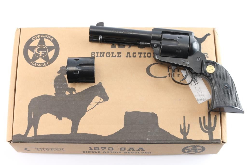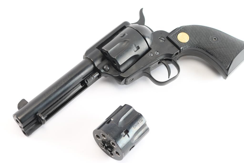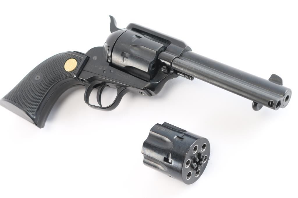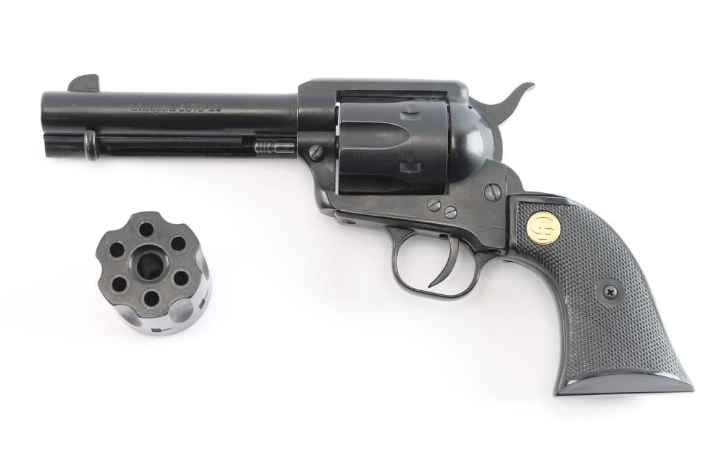Economic western style singe action revolver chambered in .22 Long Rifle, manufactured in Italy circa 2015. Imported by Chiappa Firearms of Dayton, O.H. with import mark on the underside of the barrel. Black painted finish, 4 3/4" barrel, fixed blade front sight, square notch rear sight, smooth trigger, knurled hammer spur, fluted six-shot cylinder,wrong ejector rod doesn't hold in place, alloy frame & grip frame and two-piece checkered black plastic grips with gold CF medallions. Revolver retains about 98% of its black painted finish showing some minor scratches. Action is in working order with very good lock-up, the bore is excellent/bright and the plastic grips are very good. Comes in factory box with manual, .22 Magnum cylinder. Condition is NRA Near Excellent. Modern Firearm.