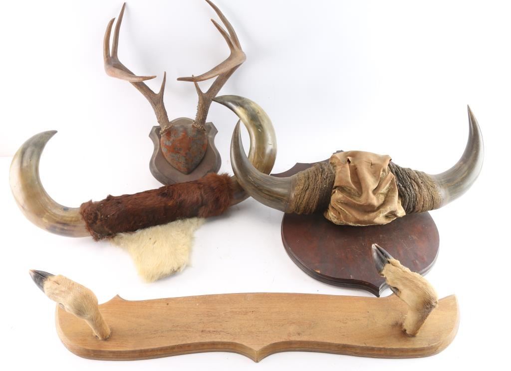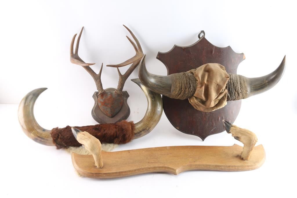 4 sets total. 1 - Bull, measures 23"L X 15"H X 8" wall to front; 1 - Bison, 22"L X 19"H X 9" wall to front; 1 - Deer, 12"L X 17"H X 12" wall to front; 1 - Deer hooves, All in fair condition.