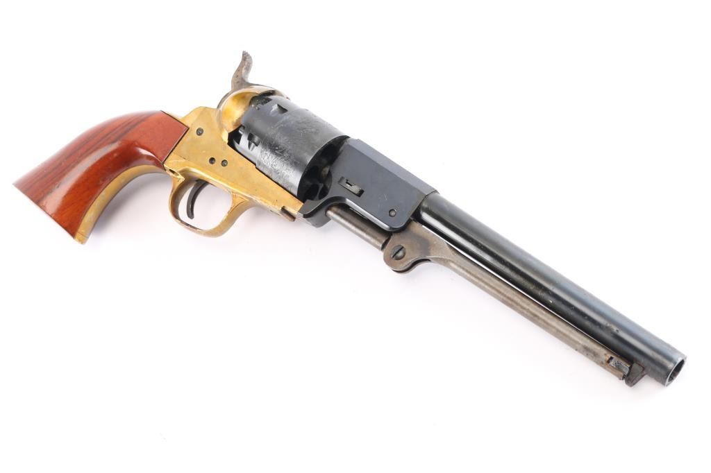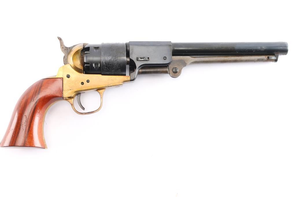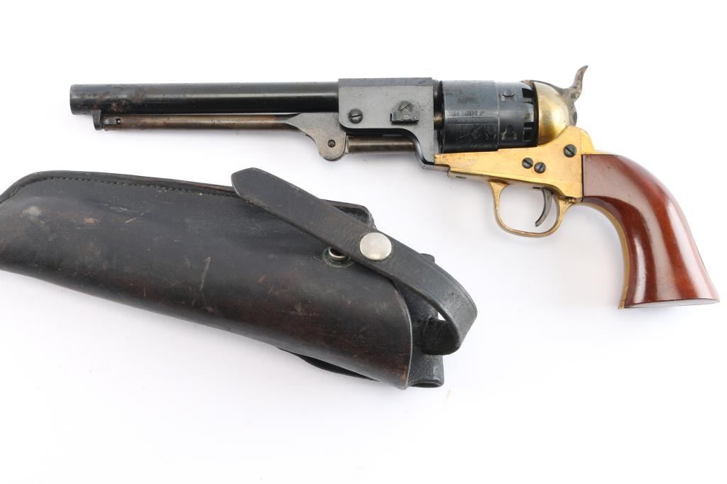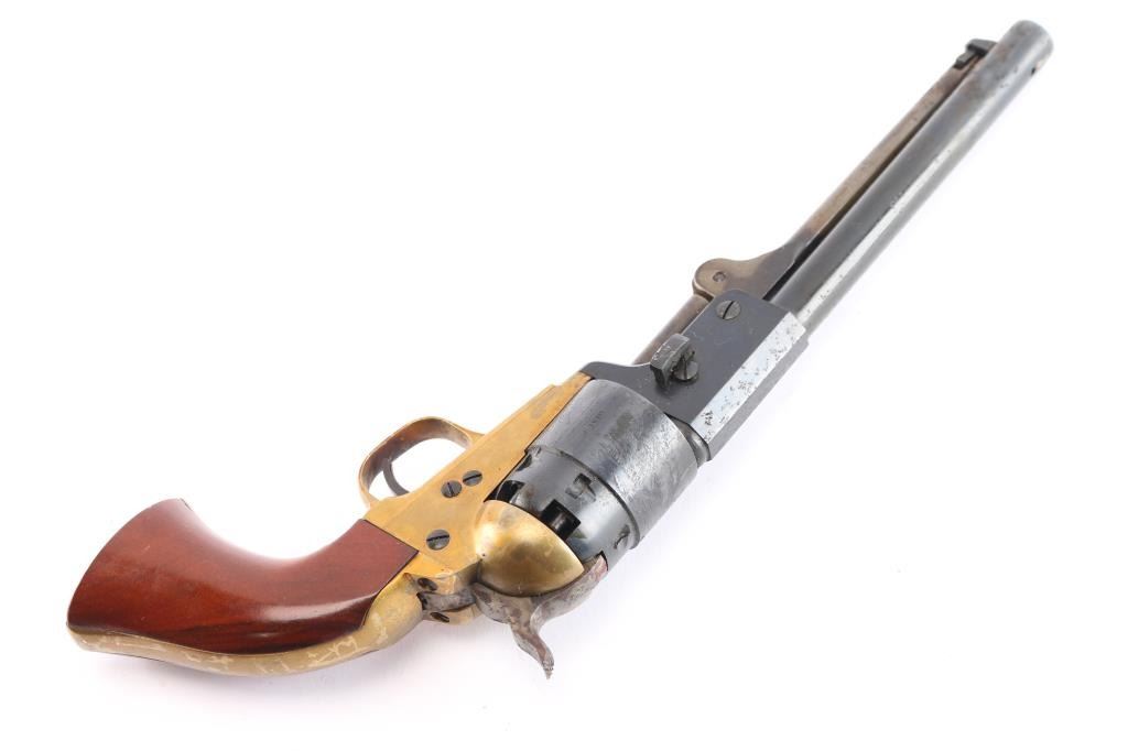 Modern Italian black powder reproduction of a Confederate Civil War revolver. 7.5" blued barrel and cylinder with naval scene. Case hardened hammer, trigger and ram. Brass frame. Missing front sight. Light rust on barrel and hammer. Grips have minor scratches. 75% finish. Comes with leather holster. Condition is NRA Good ***Antique Firearm***
