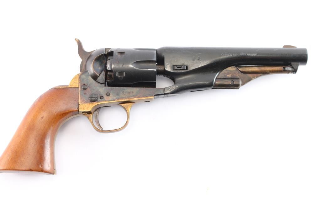 Italian made reproduction of a Colt 1862 Pocket Police single action percussion revolver chambered for .36 caliber ammunition. Blued 5.5" barrel and fluted cylinder with case colored frame, lever and hammer. Brass plated trigger guard and backstrap. Manufactured 1989. Finish is 80% with scattered light pitting, some surface rust around the nipples, wood grips are good/sound with minor scratches/dings, the bore is good/bright, good rifling, action is smooth.