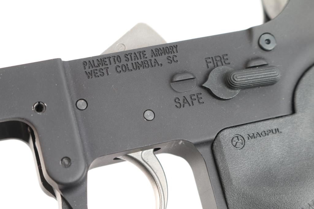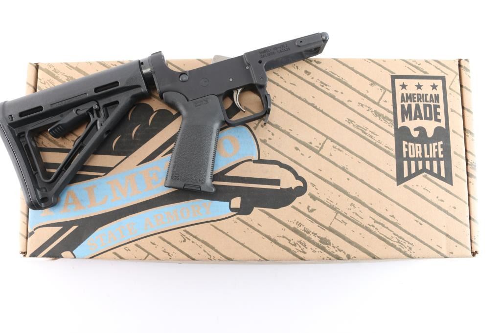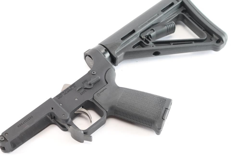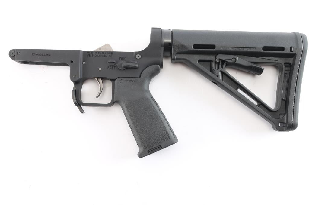 American made complete AR-15 style lower receiver designed to accept AK magazines, manufactured in West Columbia, SC. Lower receiver features a matte black anodized finish, oversized serrated paddle magazine release, black plastic Magpul MOE pistol grip with compartment, serrated left side mounted manual safety, PSA Enhanced Polished Trigger (EPT) group with a smooth curved trigger, standard recoil spring, 'H' buffer, integral trigger guard, six position buffer tube, and black plastic Magpul MOE shoulder stock with black rubber recoil pad. The original black anodized finish retained is approximately 99% with nothing remarkable. Metal displays no rust or deformation. All of the mechanical parts work smoothly. The plastic pistol grip and shoulder stock are also excellent. Complete lower receiver includes the original factory cardboard box with end label.