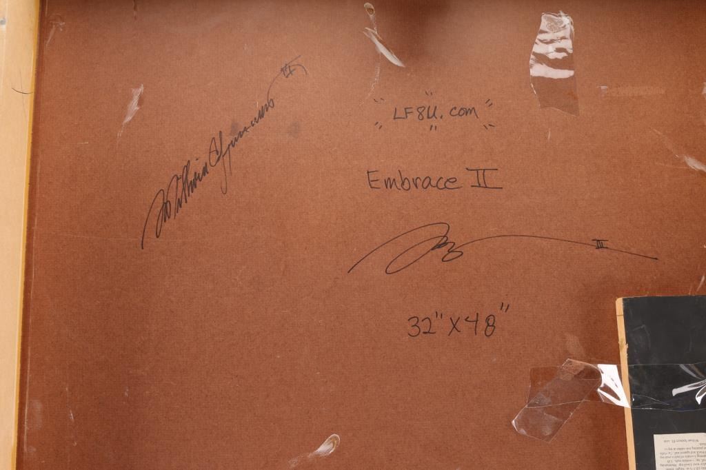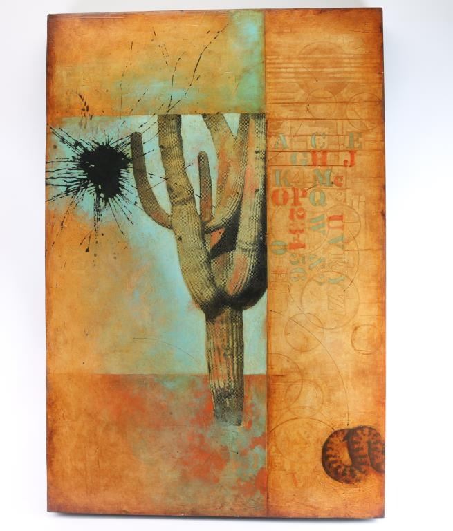 Titled "Embrace II". Measures 48" x 32" by almost 3 1/2" deep. Features saguaro cactus and partial rattlesnake at lower right corner. Signed by artist on back of board.