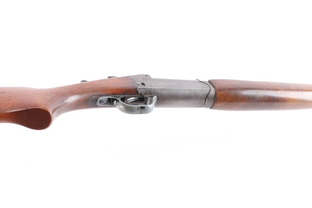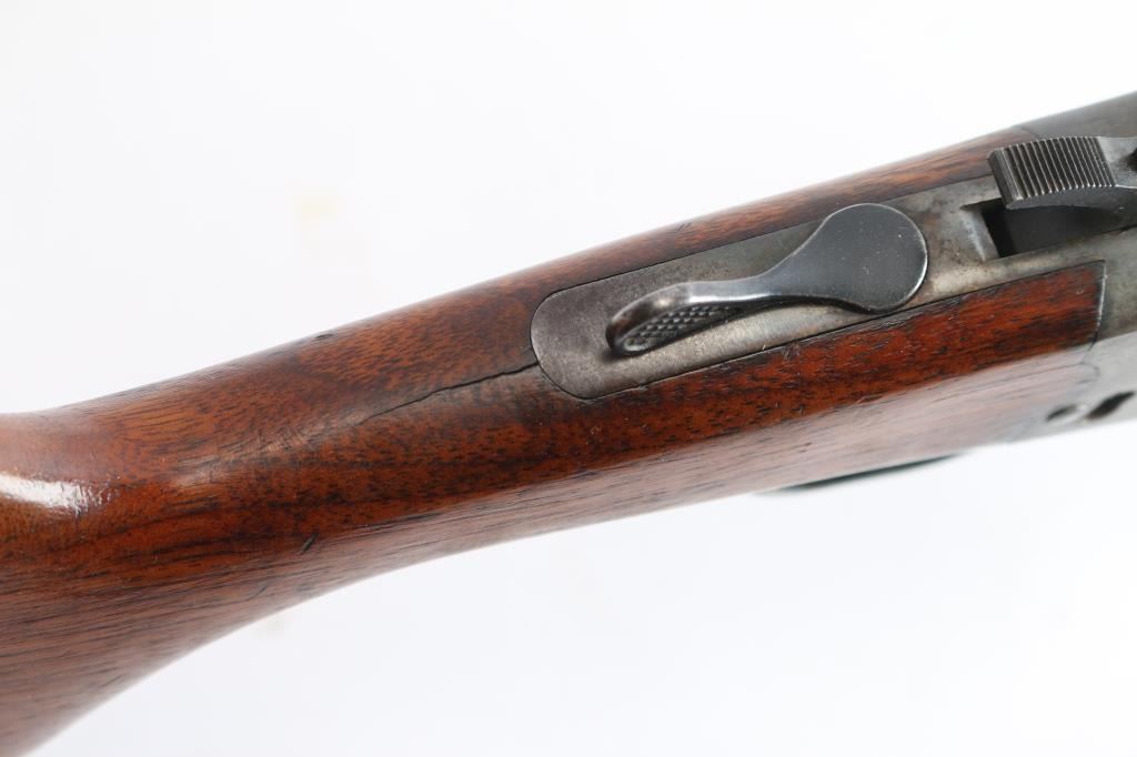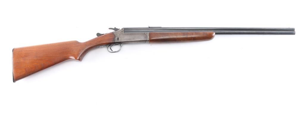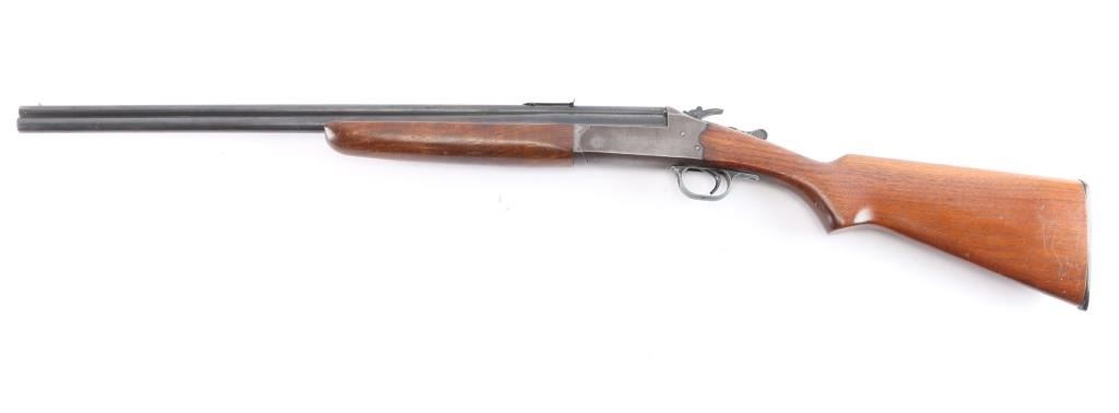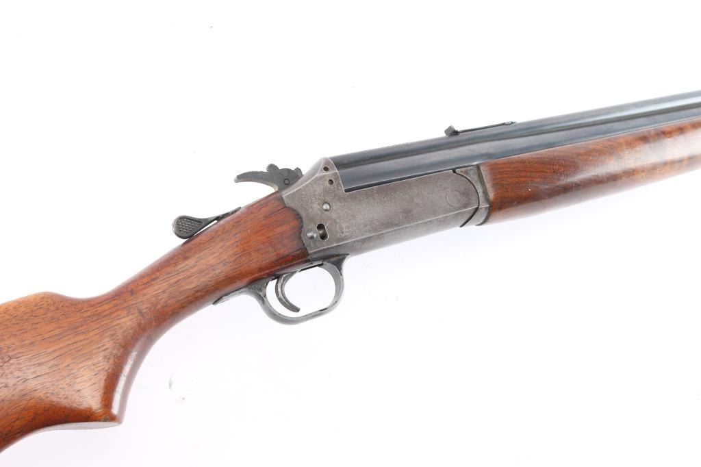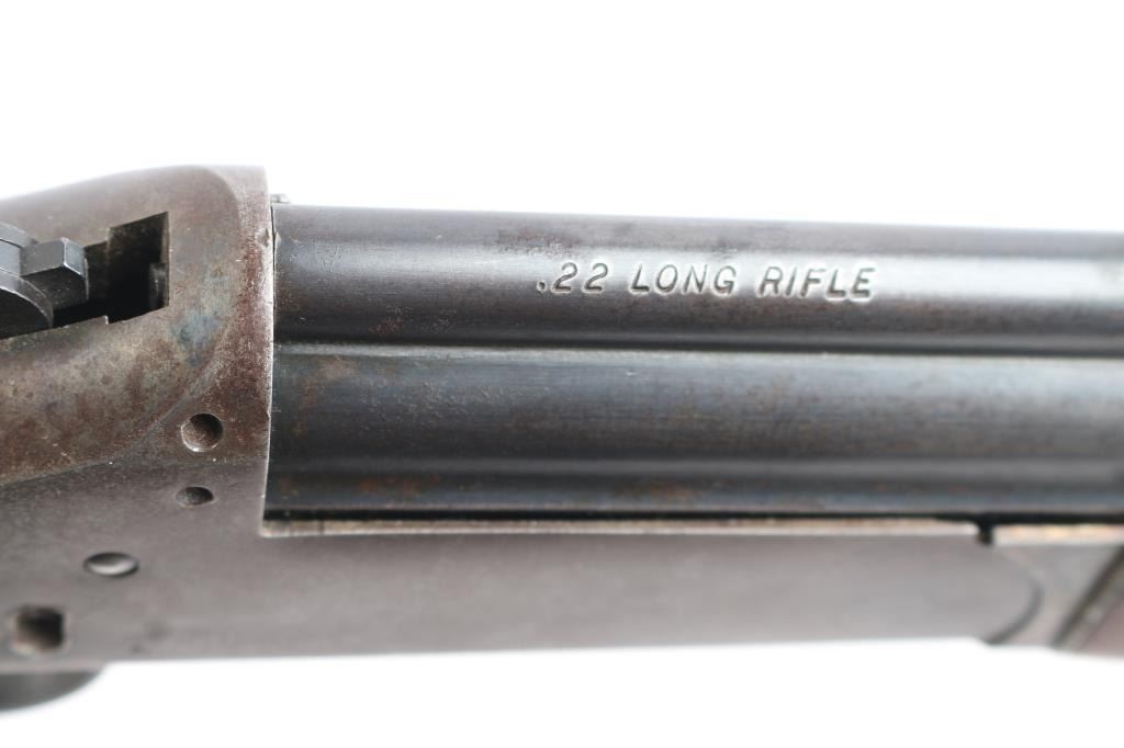 Vintage over-under Combination gun chambered in .22 LR over .410 gauge. Features blued finish, case color receiver. smooth walnut forend and shoulder stock, 24" barrels, steel sighting bead, rear sporting sight (Missing elevator), barrel selector on hammer, top lever opening, Winchester plastic buttplate is pround of the wood. Bores are very good, show dirt, need cleaning. Metal finish has faded to blue/grayish tones on barrel, just traces of casecolors showing on receiver, with edge losses and patina mixed throughout. Wood is good overall, varnished. Black finished pot metal trigger guard shows gray colors.