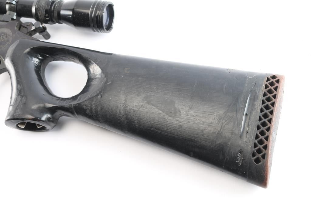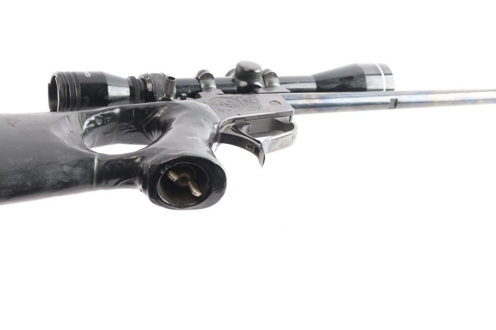 Manufactured circa 1972, this Thompson Center "Contender" has 21" blued break action barrel chambered in .223 Remington, and no iron sights. It features a serrated hammer spur, centerfire/rimfire selector on the hammer, curved serrated trigger, and an engraving of the Puma on both sides of the receiver. There is a smooth plastic thumbhole stock, ventilated recoil pad, and no forend. Metal finish is about 94% with minor scratches and a few spots of light surface rust. The stock is serviceable, and looks to have customization and hand-work done along with minor blemishes. Bore appears dirty but the rifling looks strong. Tight lock-up, and the action seems good. This rifle includes a Leupold mount, rings, and a Tasco 3-9x40 scope.
