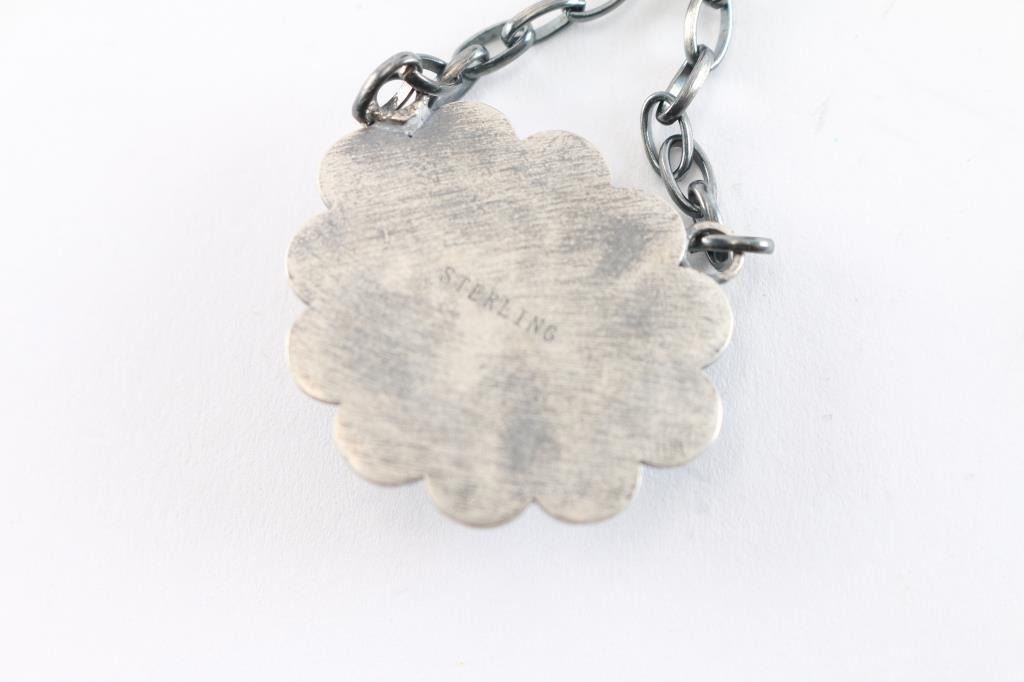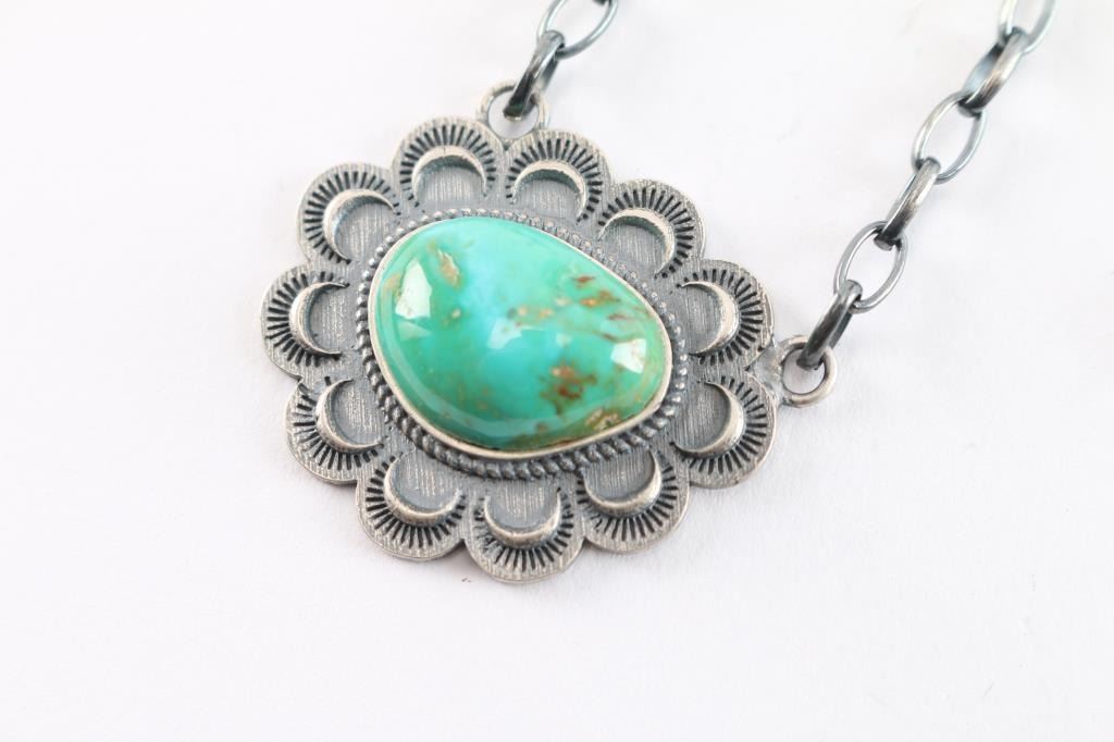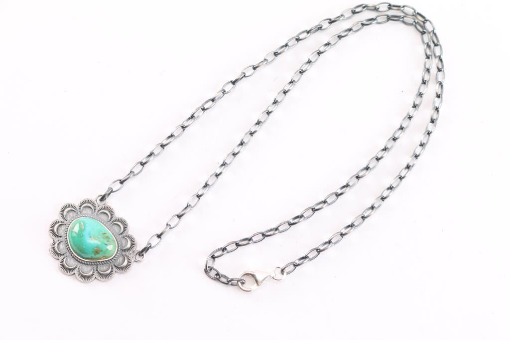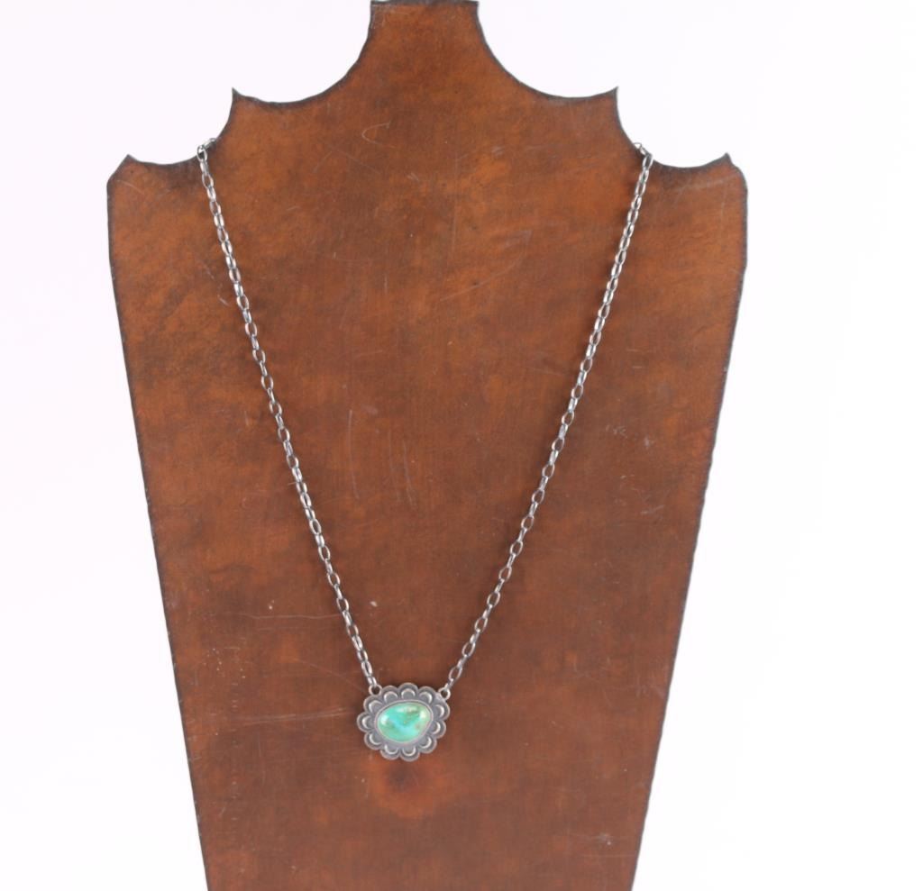 Features a single green turquoise stone on fixed loop chain. All satin sterling silver. Measures 12" from pendant to clasp.