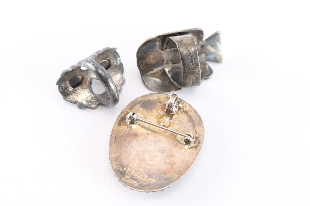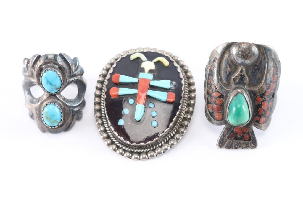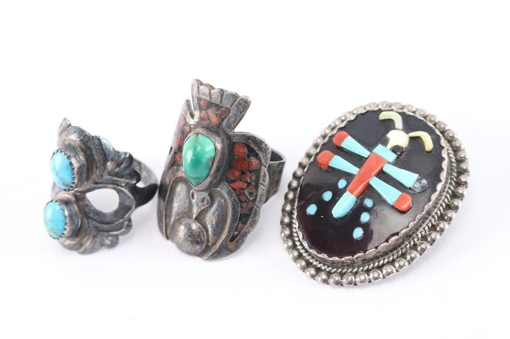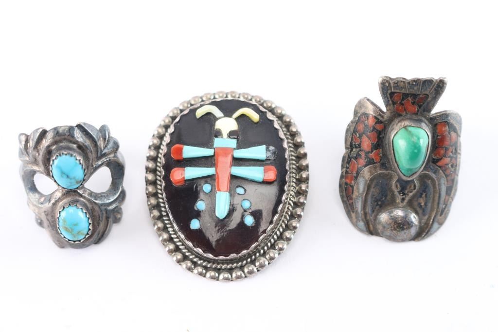 Includes: a Zuni inlaid dragonfly pin/pendant, maker marked Bev Etsale. Missing small coral stone. Weighs 13 grams with stone. Also included is a two-stone sandcast ring , all sterling, size 7. (10 grams) And an inlaid thunderbird design with turquoise stone, slightly misshapen, size 7. (12 grams)