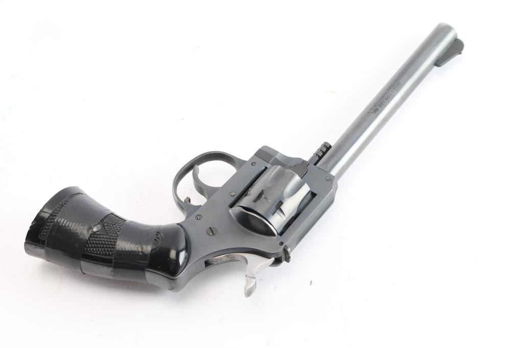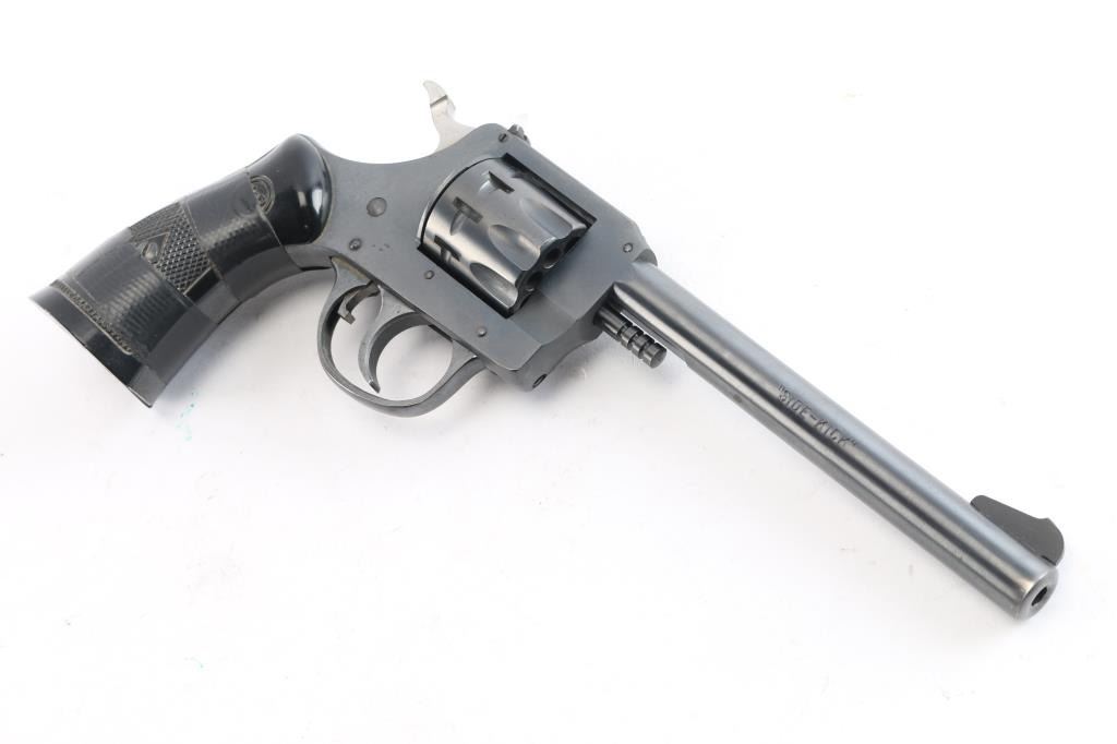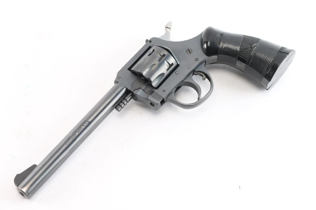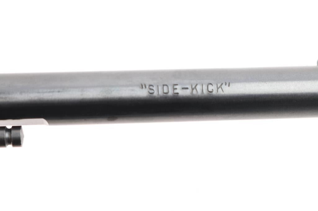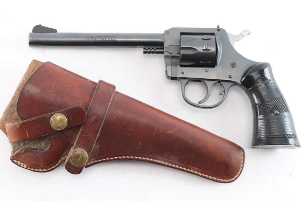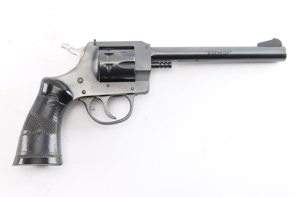 'Side-Kick' American made double action solid frame revolver chambered in .22 Short/Long/LR, manufactured circa 1965. Features a blued finish, 6" barrel, large blade front sight, drift adjustable rear sight, smooth trigger with beveled edges, serrated wide hammer spur, fluted nine-shot cylinder, and two-piece diamond checkered black synthetic grips with H&R decor. Revolver has about 97% blue finish with muzzle/holster wear . Action is sound, the lock-up is good, the bore is excellent/bright and the left plastic grip panel is cracked, repaired with two strips of electrical tape. Comes with brown leather Hunter snap Holster.