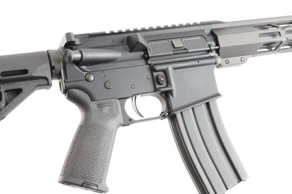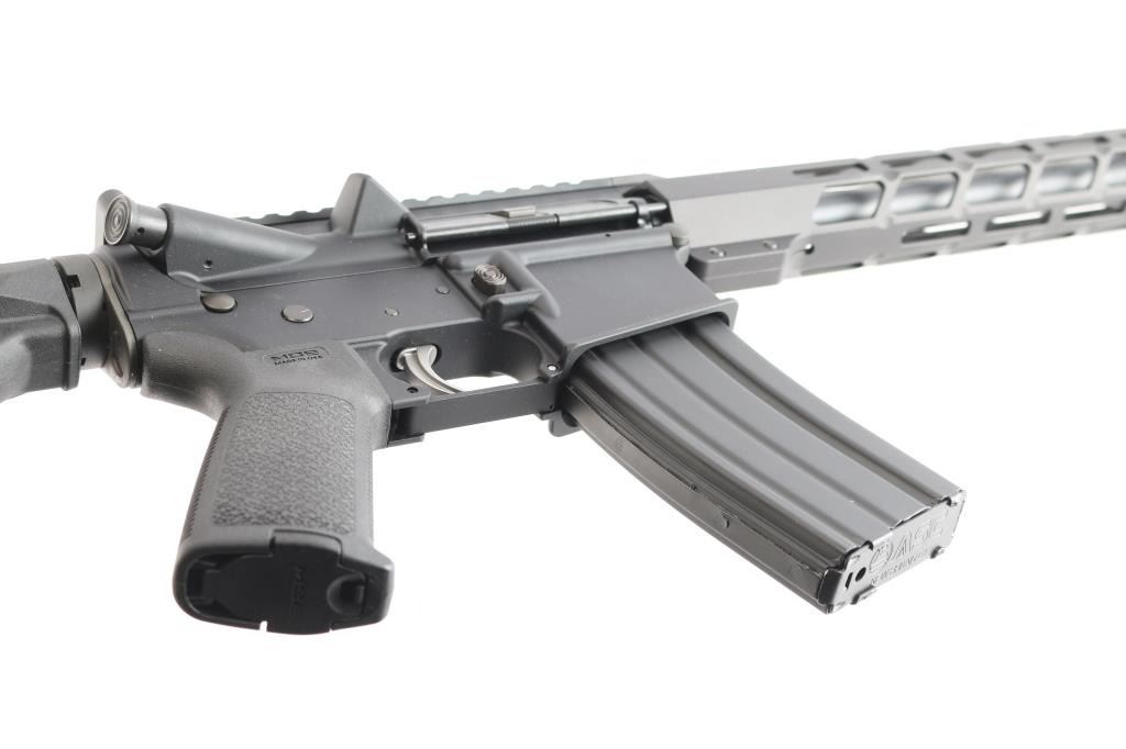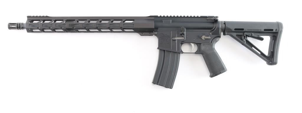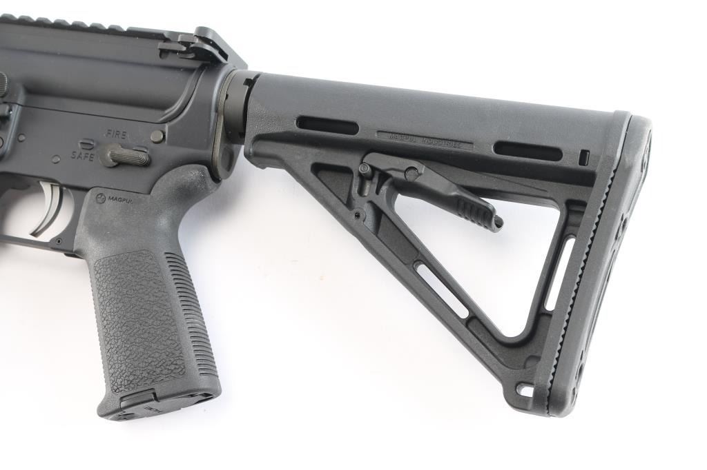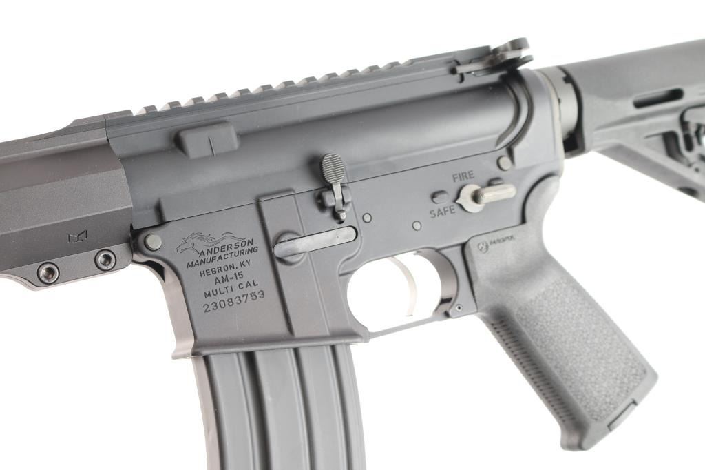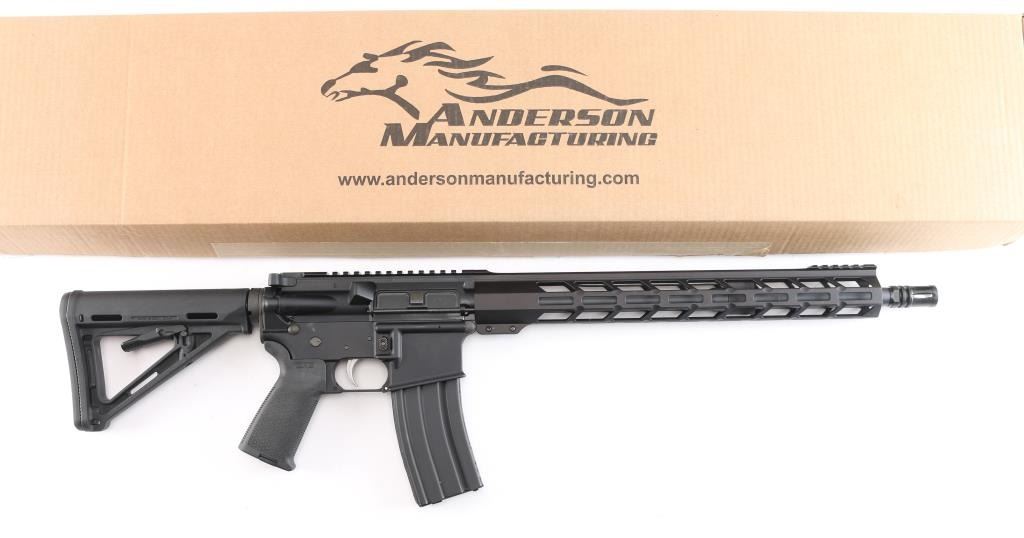 American made semi-automatic centerfire direct impingement AR15 style rifle chambered for 5.56x45 NATO. Manufactured in Hebron, KY. Rifle features a matte black anodized finish, a 16" barrel with a 1/7 twist rate, A2 bird cage flash hider, 15" free-float M-Lok rail with a short picatinny strip on the top towards the front, annular cut forward assist, shell deflector, annular cut push-button mag release, serrated bolt release, flared magazine well, stainless Anderson smooth curved trigger with a lightened hammer (quicker lock-up time), mil-spec charging handle, flattop receiver, ejection port cover, Magpul MOE pistol grip, six-position mil-spec buffer tube, mil-spec buffer and spring, Magpul MOE telescoping buttstock, no iron sights installed, and left side receiver mounted manual safety. Rifle retains approximately 99% of its original anodized finish with nothing remarkable. Metal displays no rust or deformation. Bore is bright with strong rifling, and the Magpul furniture is also excellent. The action is smooth and crisp. Carbine includes original factory cardboard box, owner's manual, stickers, and lock.