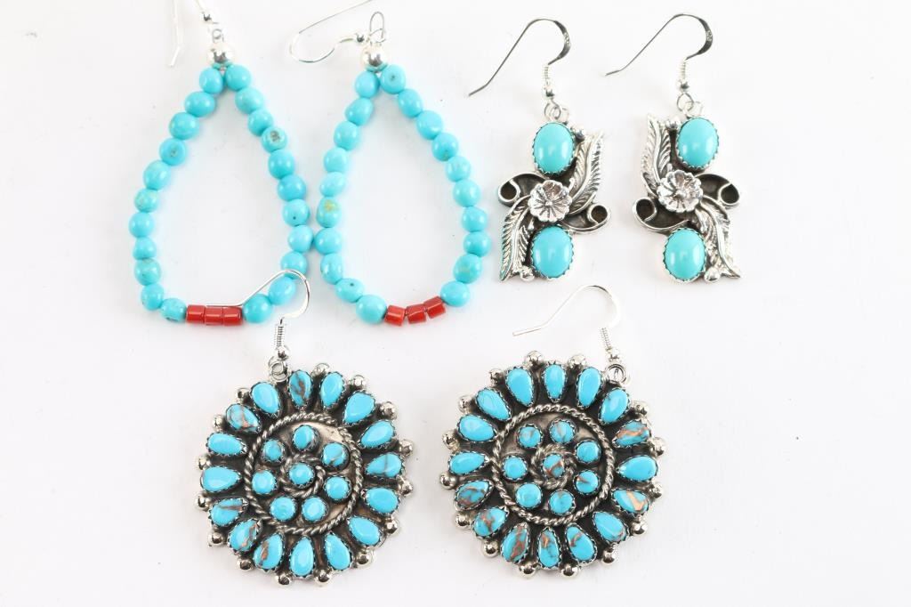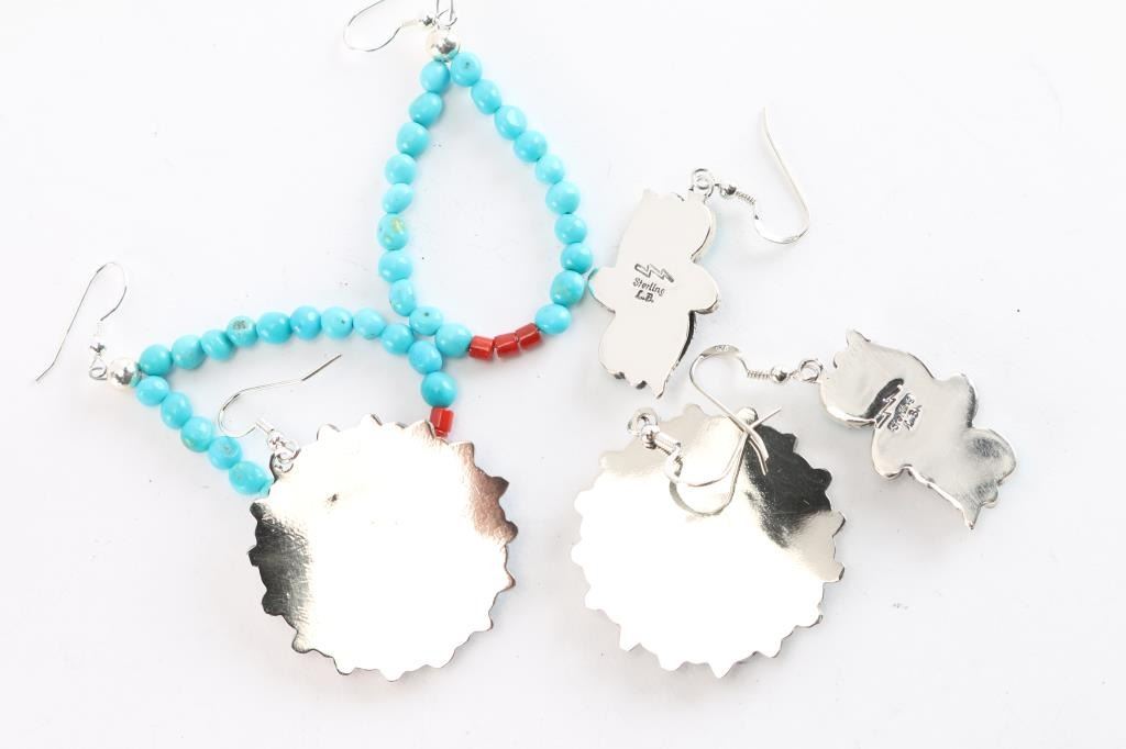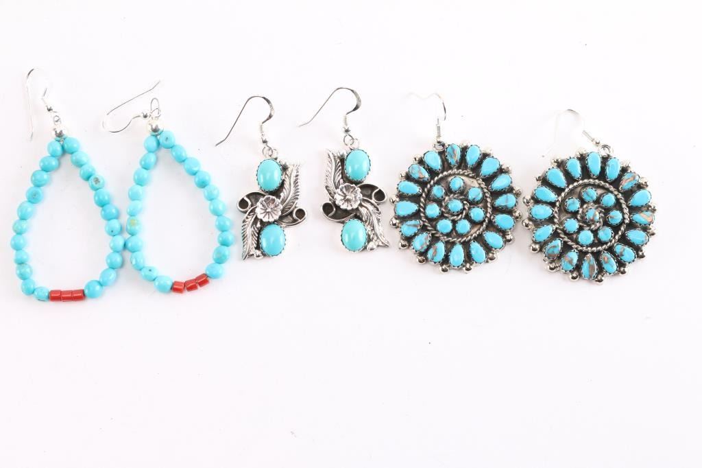 Including a pair of turquoise cluster earrings set in sterling silver; a pair of Navajo turquoise earrings with feather motif set in sterling silver; and a pair of turquoise and coral dangle earrings.