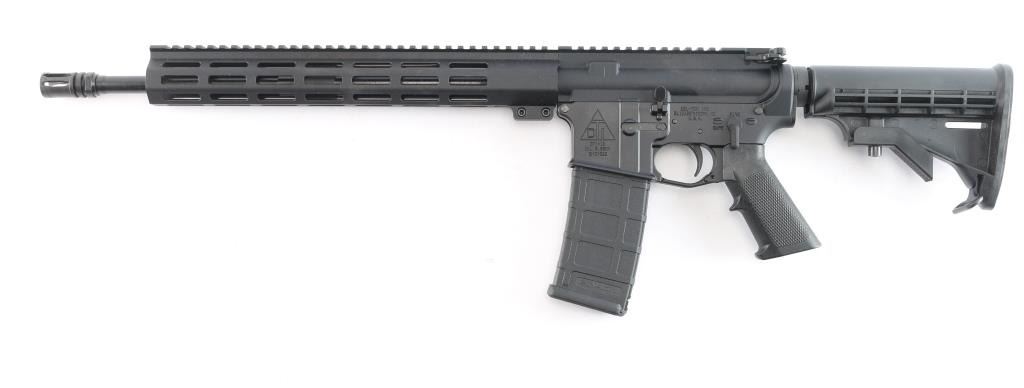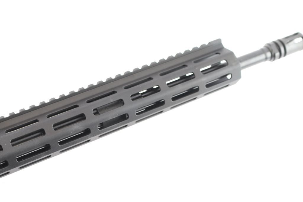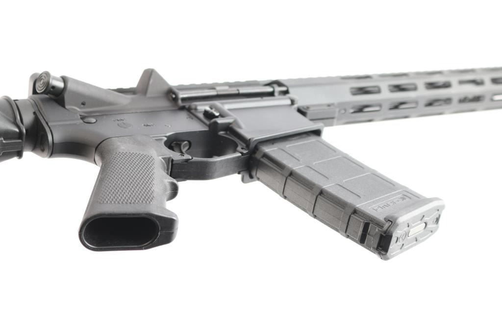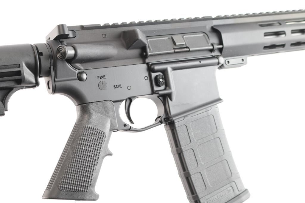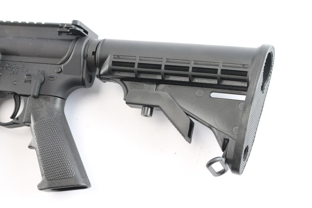 American made semi-automatic centerfire direct impingement AR15 style rifle chambered for 5.56x45 NATO. Manufactured in Elizabethtown, NC. Rifle features a matte black anodized finish, a 16" pencil barrel with a 1/9 twist rate, A2 bird cage flash hider, 13-1/2" free-float M-Lok rail with a continuous picatinny strip on the top, annular cut forward assist, shell deflector, annular cut push-button mag release, serrated bolt release, flared magazine well, mil-spec smooth curved trigger, mil-spec charging handle, flattop receiver, ejection port cover, A2 pistol grip, six-position mil-spec buffer tube, mil-spec buffer and spring, M4 style telescoping buttstock, no iron sights installed, and left side receiver mounted manual safety. Rifle retains approximately 99% of its original anodized finish with nothing remarkable. Metal displays no rust or deformation. Bore is bright with strong rifling, and the plastic furniture is also excellent. The action is smooth and crisp. Carbine includes original factory cardboard box, owner's manual, and lock.