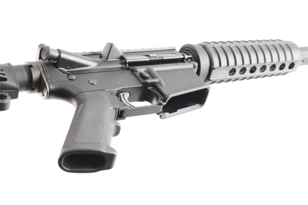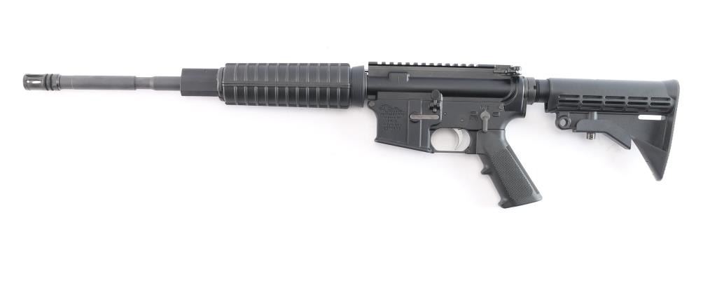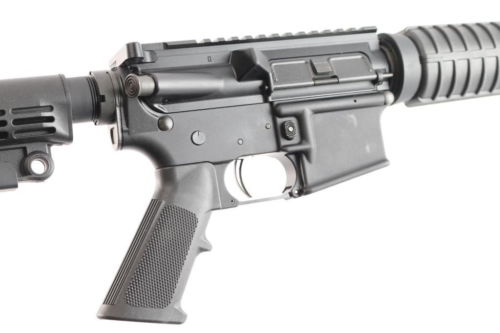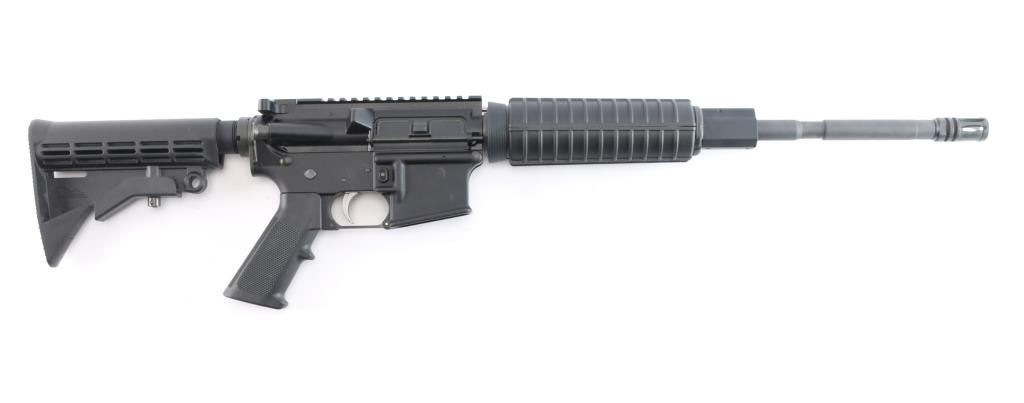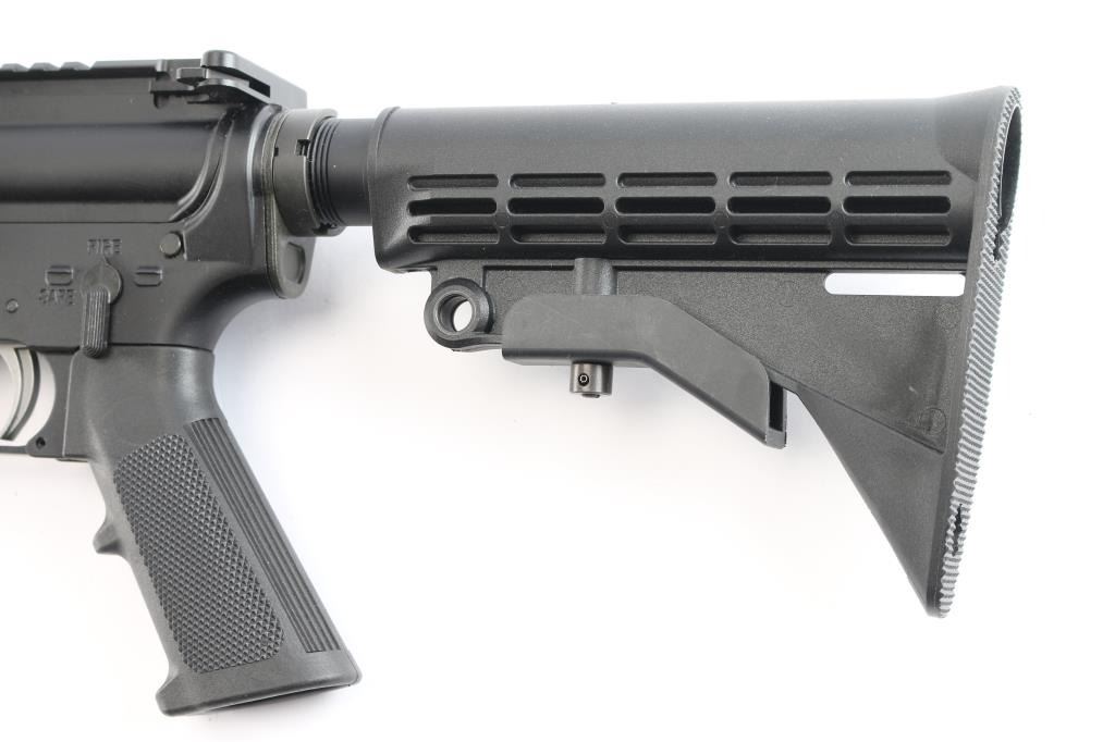 American made AR-15 type semi-automatic gas impingement rifle with a 5.56x45mm NATO chamber, and manufactured in Hebron, KY. Rifle features a matte black anodized finish, plastic ribbed black polymer carbine-length handguard, carbine-length gas system, six-position receiver extension, M4 style stock with sling slots, 16" M4 contour barrel with a 1:8 twist, A2 Birdcage flash hider, annular cut push-button magazine release, beveled magazine well, ejection port dust cover, low profile gas block, brass deflector, serrated receiver mounted manual safety, annular cut forward assist, A2 style checkered pistol grip, ambidextrous serrated paddle bolt release on left side, mil-spec nickel Teflon coated single-stage trigger, M16 style bolt carrier, standard buffer and spring, and mil-spec charging handle. Rifle retains approximately 98% of its original black anodized finish with superficial blemishes. Metal displays no rust, or deformation. The action is smooth and crisp, and the bore is bright with strong rifling. The black polymer furniture is also in excellent condition.