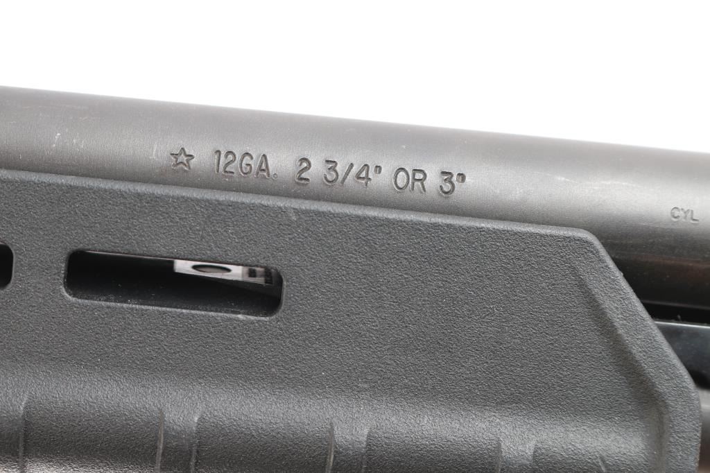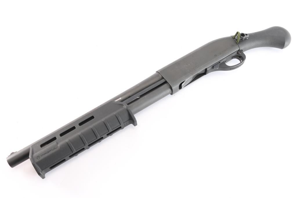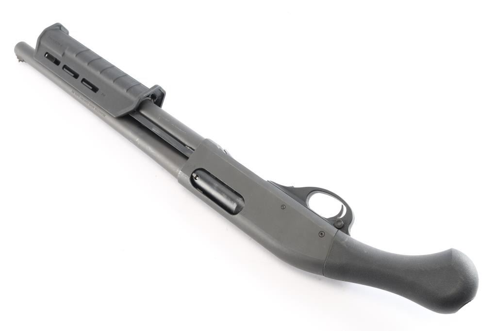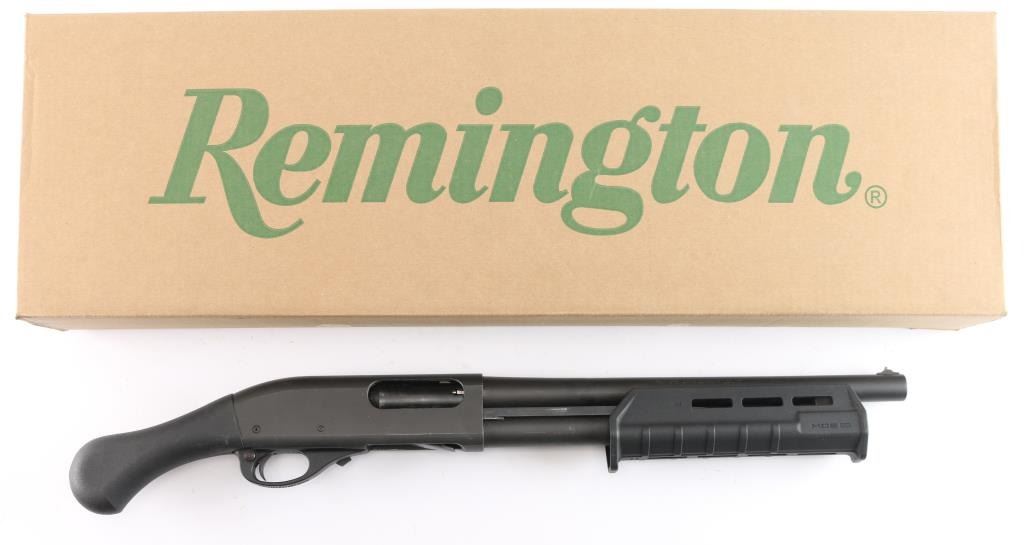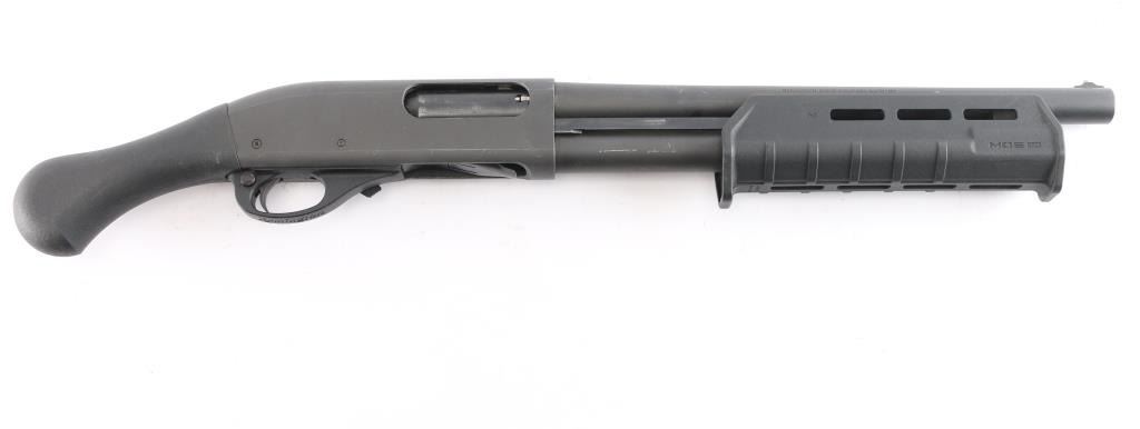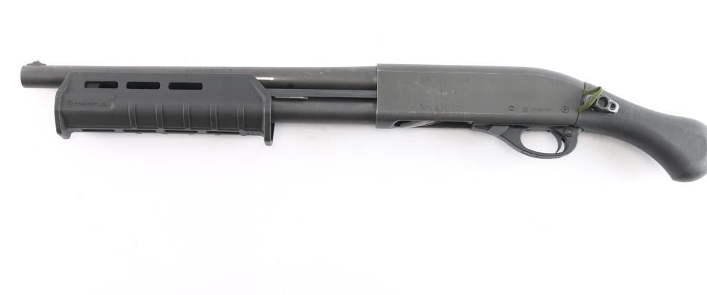 "Tac-14," an American made compact pump shotgun designed for home defense chambered for 3" 12 Gauge shells, manufactured in Ilion, NY. This is a special version of the legendary Model 870, made for tactical purposes. This is a non-NFA firearm and designated as 'Any-Other-Weapon.' Shotgun features a matte black oxide finish, a 14" barrel, bore measures 'CYL' with a drop-in gauge,' raised steel bead front sight, Raptor smooth pistol grip, Magpul MOE slide handle with M-Lok slots, plastic trigger guard, annular cut cross-bolt safety, smooth curved trigger with beveled edges, knurled magazine cap, quick detach mount affixed to the pistol grip (with screws and glue), and a 4+1 magazine capacity. The original matte black oxide finish retained is approximately 90% with scattered scratches. Metal displays no deformation, but does exhibit rust on the front sight, and what appears to be rust on the left side of the receiver. The black synthetic furniture is very good with light scattered scratches, and an unprofessionally attached QD mount on the pistol grip. The action is smooth and crisp, and the bore is bright and shiny. Shotgun includes the original factory cardboard box with manual, and lock.
