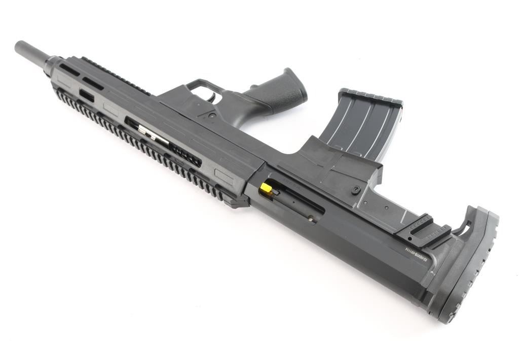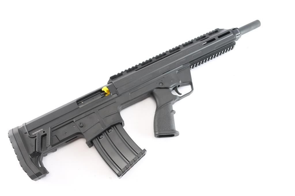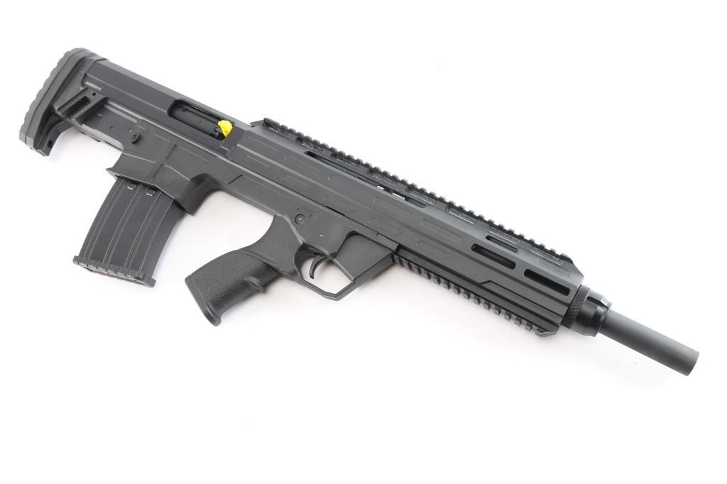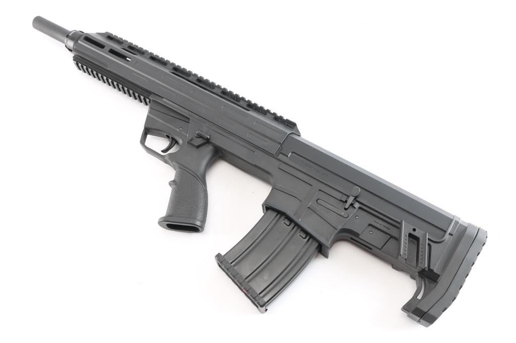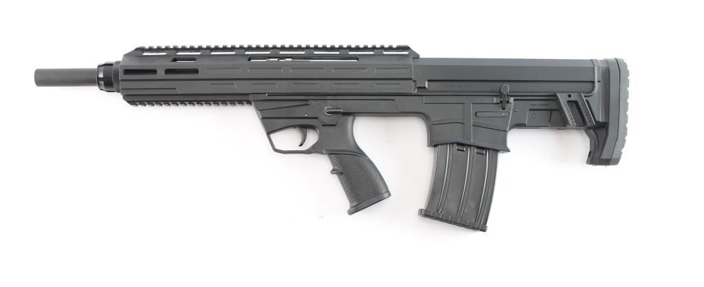 Turkish made compact bullpup style semi-automatic tactical shotgun chambered for 3" 12 Gauge shells. Shotgun features a matte black finish, a 18-1/2" barrel, approximately 28-1/2" overall length, accepts choke tubes Benelli/Mobil, bore measures 'IC' with a drop-in gauge (choke installed), 15-3/4" length-of-pull, smooth curved trigger, checkered bolt release, MKA/T-1919 detachable magazines, back-up iron sights included in the box, stippled finger grooved pistol grip, railed forend with picatinny on the top and bottom and M-Lok on both sides, chevron textured solid rubber recoil pad, flared magazine well, textured push-button magazine release, right side mounted manual safety, and full length picatinny rail on top of the shotgun. The original matte black finish retained is approximately 99% with nothing remarkable. Metal displays no rust or deformation. Shotgun has not been assembled completely (charging handle in box), so the action has not been tested thoroughly. This shotgun is also 'Like-New' from a dealer, and has not been fired. Bore is bright, and the polymer furniture aspects of this shotgun are excellent. Shotgun includes original cardboard factory box, instruction manual, tools, sling, gas ring, bolt handle (in box), iron sights (in box), and lock.