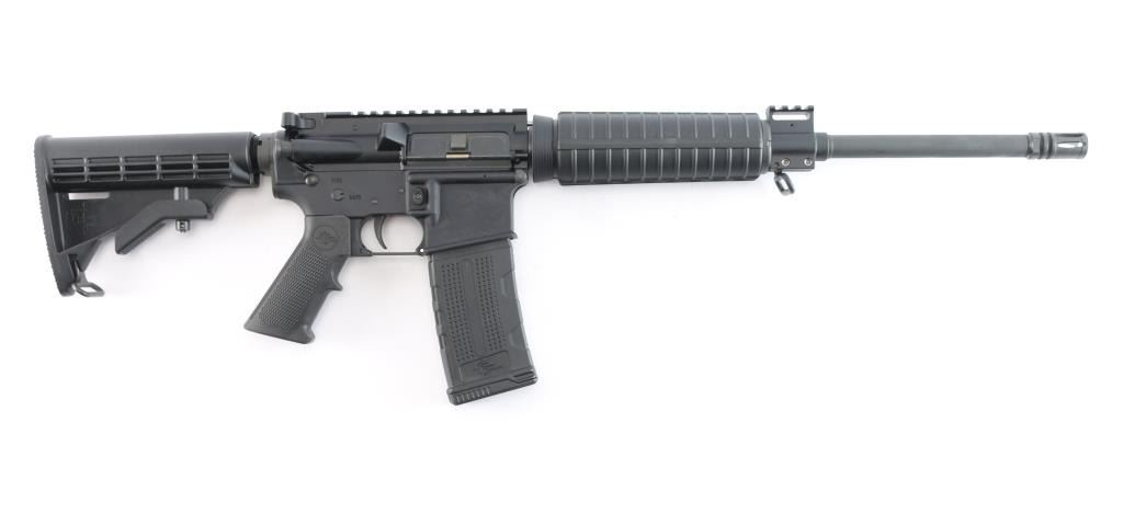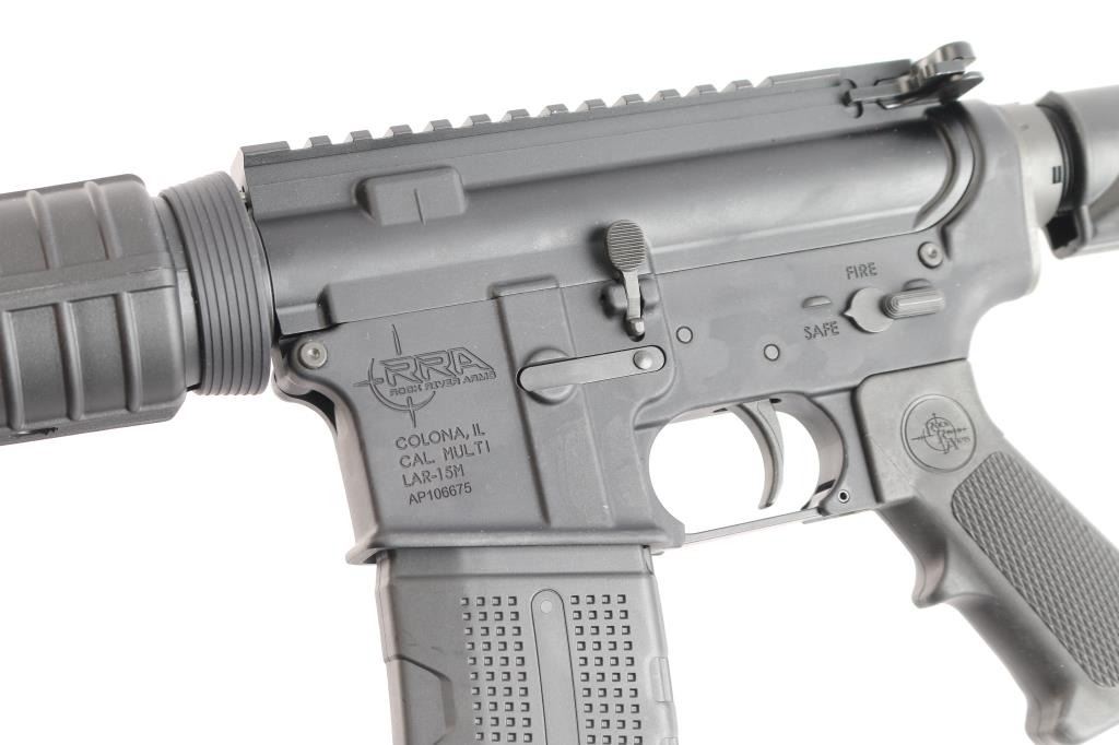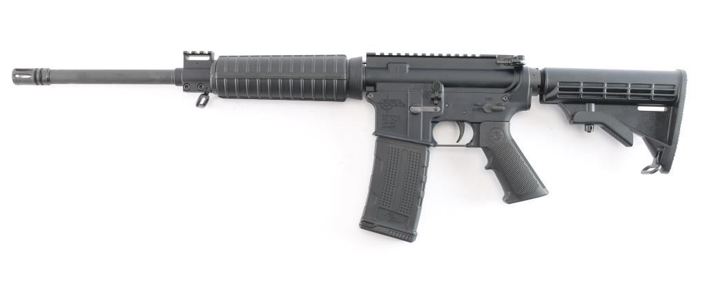 American made LAR-15M, a semi-automatic gas impingement centerfire modern sporting rifle chambered for 5.56x45mm NATO, manufactured in Colona, IL. Rifle features a matte black anodized finish, 16" chrome-moly barrel with 1:8" twist rate, 30-round stanag/AR-15 magazines, forged aluminum T-marked A4 flat-top upper receiver, forged lower receiver, dust cover, ribbed black plastic carbine-length hand guards with heat shield, carbine-length gas system with a receiver height picatinney gas block, A2 bird cage flash suppressor, left receiver mounted serrated manual safety, annular cut push-button magazine release, RRA two-stage smooth curved trigger, mil-spec charging handle, shell deflector, M16 bolt carrier, annular cut bolt assist, serrated bolt release, A2 rubberized checkered pistol grip, six-position buffer tube, mil-spec buffer and buffer spring, flared magazine well, and M4 style carbine buttstock. The original Matte black anodized finish retained is approximately 99% with only superficial scuffs (finish remains). Metal displays no rust or deformation. The action is smooth and crisp, and the rubberized plastic pistol grip and buttstock are also excellent. Bore is bright with strong rifling. Rifle includes original foam lined factory black hard case with end label, and owner's manual.