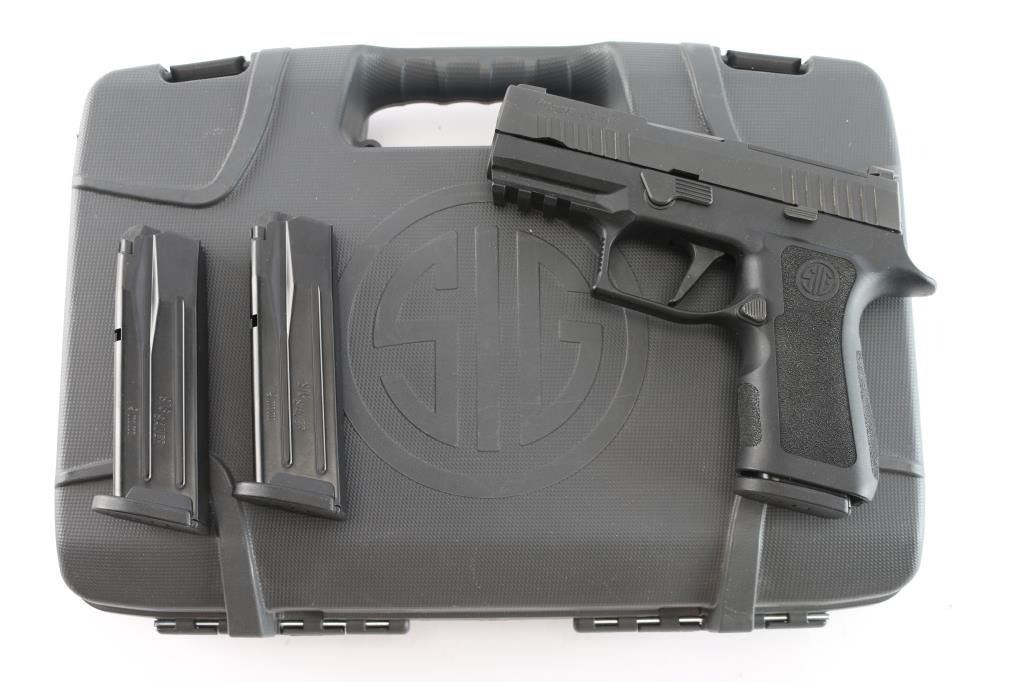 American made semi-automatic striker-fired 'X-Series' compact pistol chambered for 9x19mm Luger, manufactured circa 2022 in Newington, NH. Pistol features a matte black Nitron finish, 3.6" barrel, front and rear slide serrations, dovetailed XRay3 day and night sights, metal guide rod assembly with dual recoil springs, serrated push-button magazine release, under-cut trigger guard, extended beavertail, smooth straight-faced trigger, fifteen-round magazines, flared magazine well, accessory rail on dust cover, and stippled black polymer grip module with finger groove and Sig insignias. Pistol retains approximately 99% of its original matte black Nitron finish with superficial scratches. Metal displays no rust or deformation. The action is smooth and crisp. The bore is bright with strong rifling. The polymer grip module is also excellent with a light blemish on the trigger guard and the accessory rail. Pistol includes the original factory foam lined hard case with matching end label, three OEM magazines total, sticker, owner's manual, and lock.