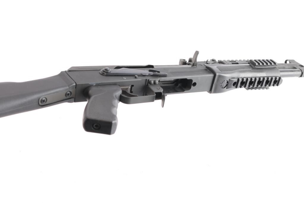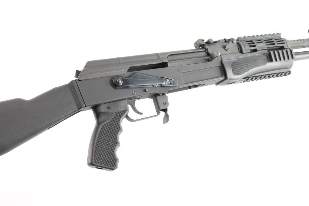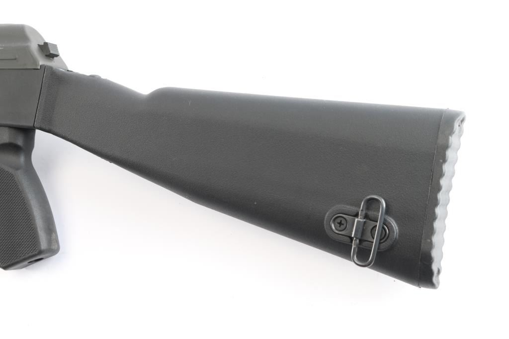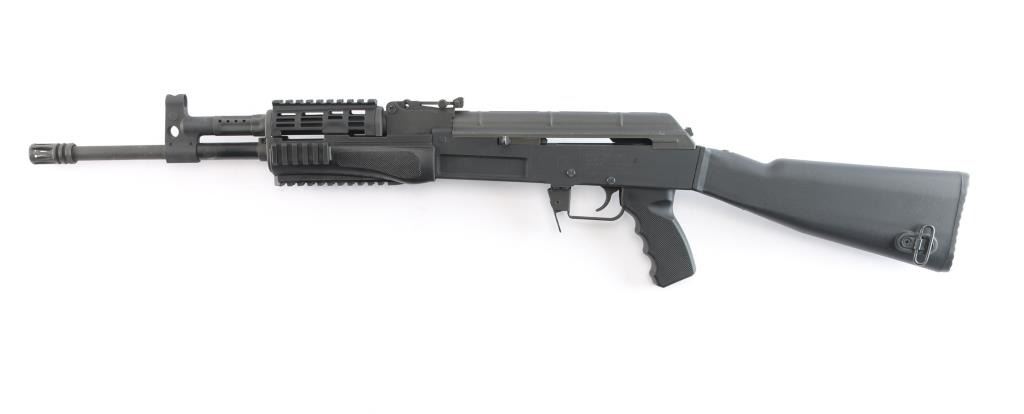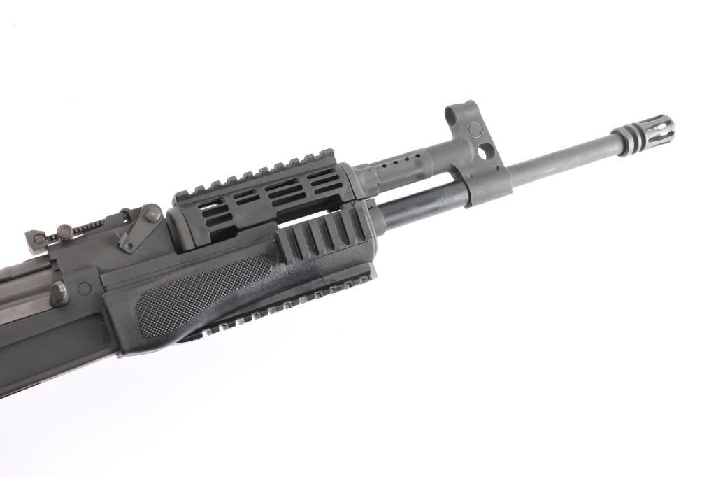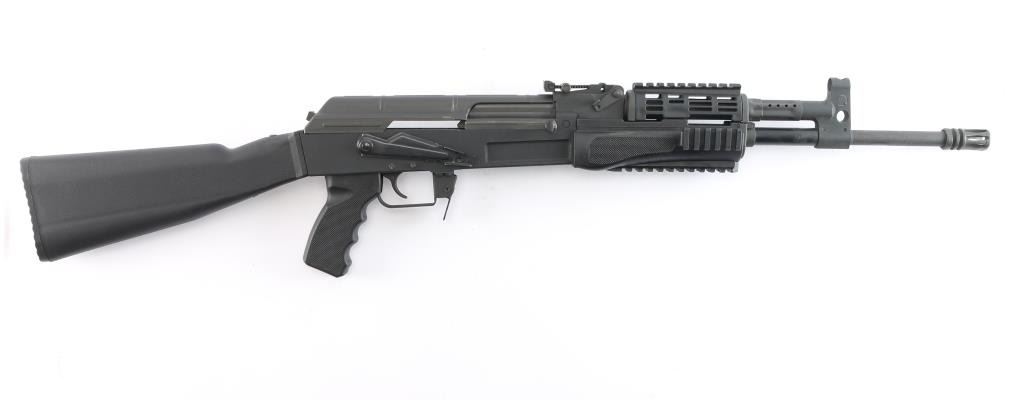 American made AK-styled semi-automatic long-stroke gas system driven centerfire rifle chambered for 7.62x39mm, and manufactured in Georgia, VT. This model C39 is the first variant with a milled receiver, and dual charging handles. Rifle features black parkerized finish, 16" barrel, threaded muzzle with M16A1 style flash hider, smooth curved single-stage Tapco G2 trigger group, windage and elevation adjustable post front sight, elevation adjustable tangent rear sight graduated to 800 meters, combination gas block and front sight, ventilated gas tube, ventilated bolt carrier, wide paddle magazine release, and receiver mounted lever style manual safety. The black polymer furniture consists of a smooth buttstock with a sling swivel on left side, checkered finger-grooved pistol grip, ribbed plastic butt-plate, checkered and ventilated forend with picatinny rail sections on the top, bottom, and sides. Rifle retains approximately 94% of its original parkerized finish with scattered light scratches, and some losses on the barrel between the gas block and the handguard retainer. Metal displays no rust, or deformation. The action is smooth and crisp, and the bore is bright with strong rifling. The polymer furniture is also in excellent condition with superficial handling blemishes.