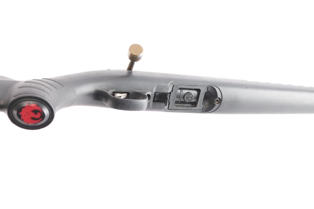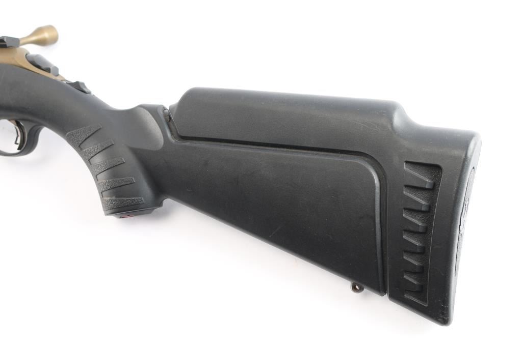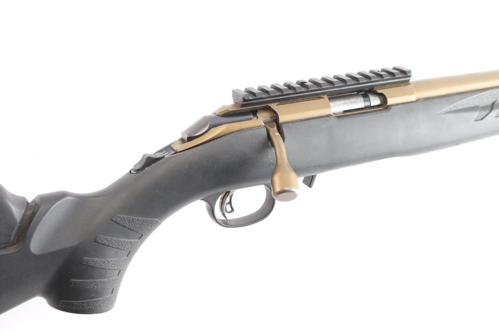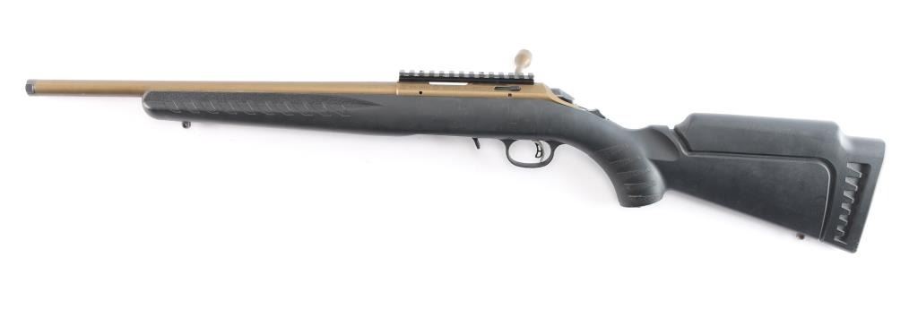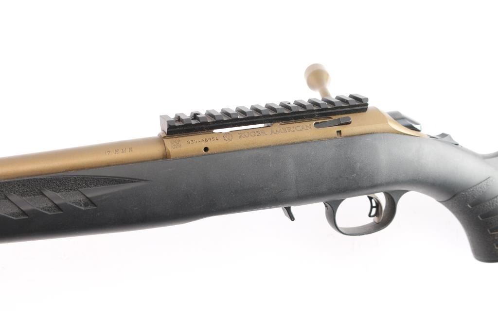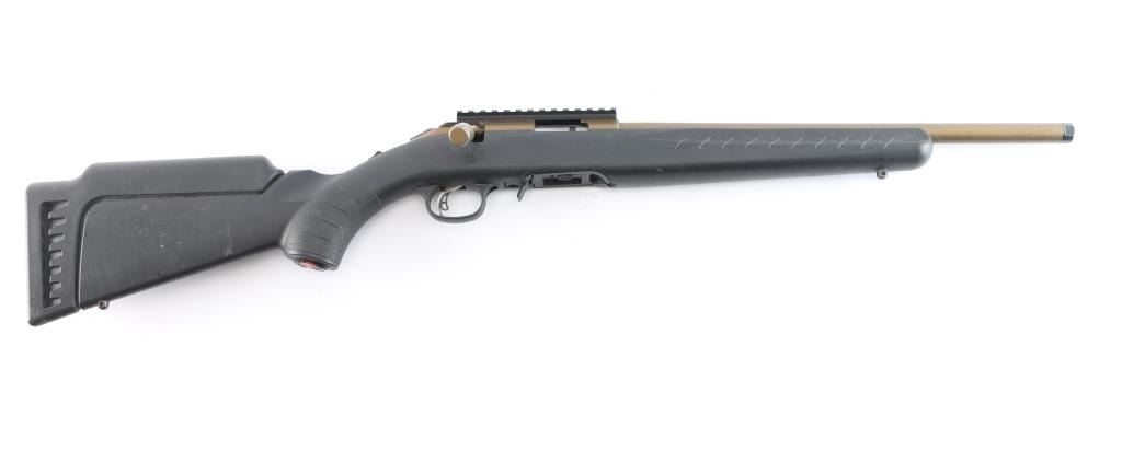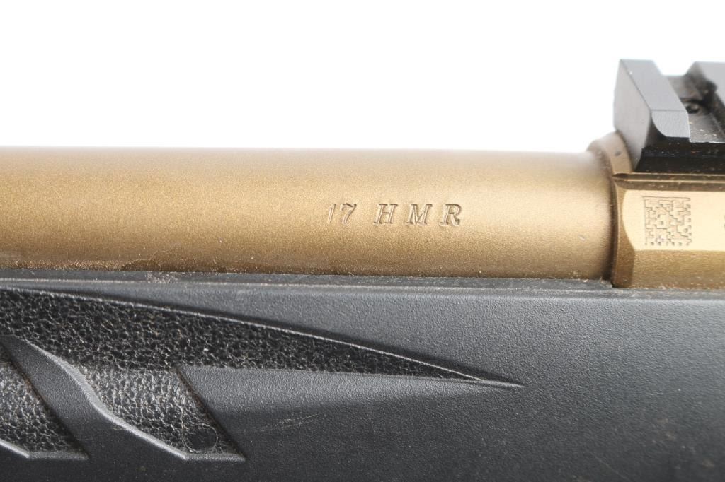 American made bolt-action rimfire rifle chambered in .17 HMR, and manufactured circa 2021 in Mayodan, NC. Rifle features a burnt bronze Cerakote finish, cold-hammer-forged 18" tapered threaded barrel, thread protector with wrench flats, no provisions for iron sights, detachable rotary BX-15 box magazines, extended magazine release, smooth Marksman Adjustable trigger with integral blade safety, turned down bolt handle with sixty-degree throw, receiver mounted bolt release, serrated sliding tang safety, and picatinney rail mounted on the top of the receiver. The black synthetic furniture consists of a semi-pistol grip shoulder stock with stippling at the wrist, sling studs on the forend and shoulder stock, 'Power Bedding' system, free-floated barrel, Red Ruger logo on grip cap, high comb, interchangeable length-of-pull, finger-grooved and stippled forend, and hard black plastic butt-plate with Ruger logo. Rifle retains approximately 88% of its original bronze Cerakote finish with scattered scratches, losses on the bolt handle, and handling blemishes. Metal displays rust on the sling swivel studs, but no deformation. The action is smooth and crisp, and the bore is bright with strong rifling. The polymer furniture is in good condition with dings, scattered scratches and handling blemishes. Rifle includes one BX-15 magazine.