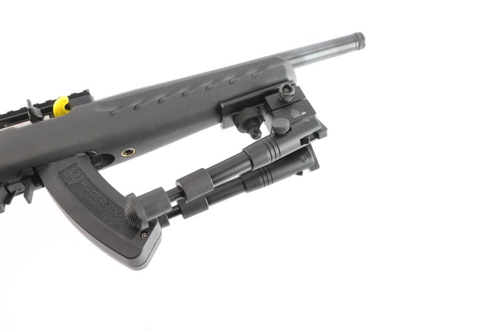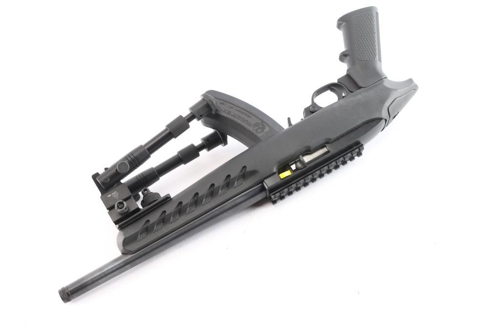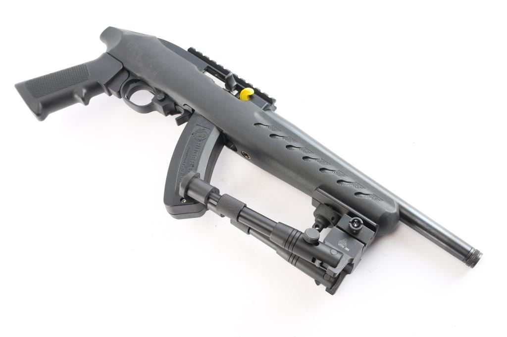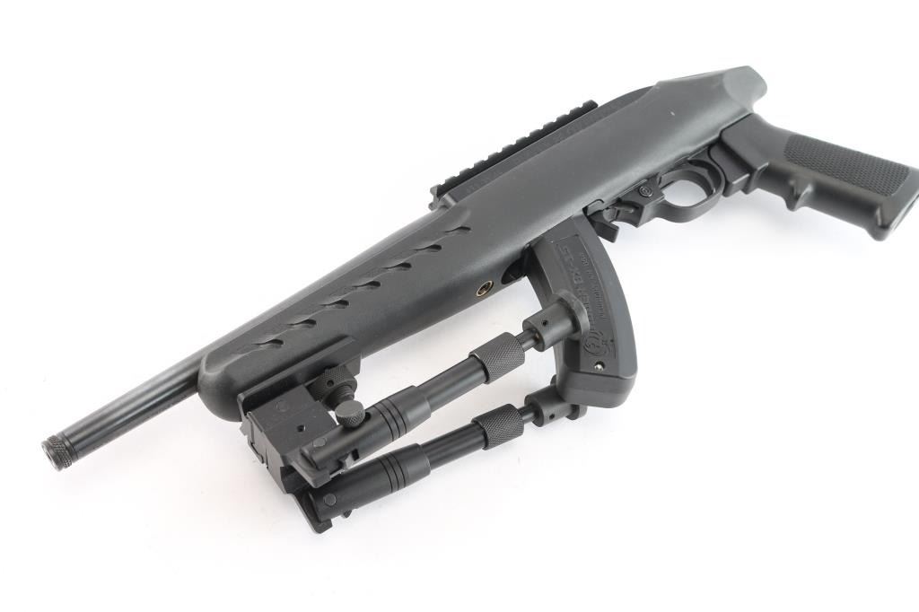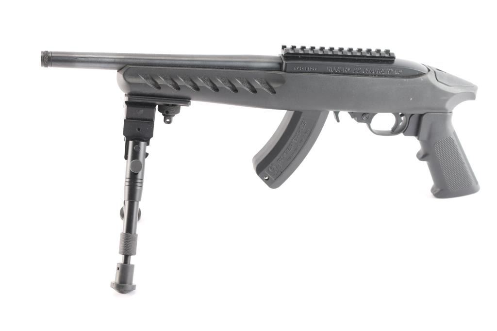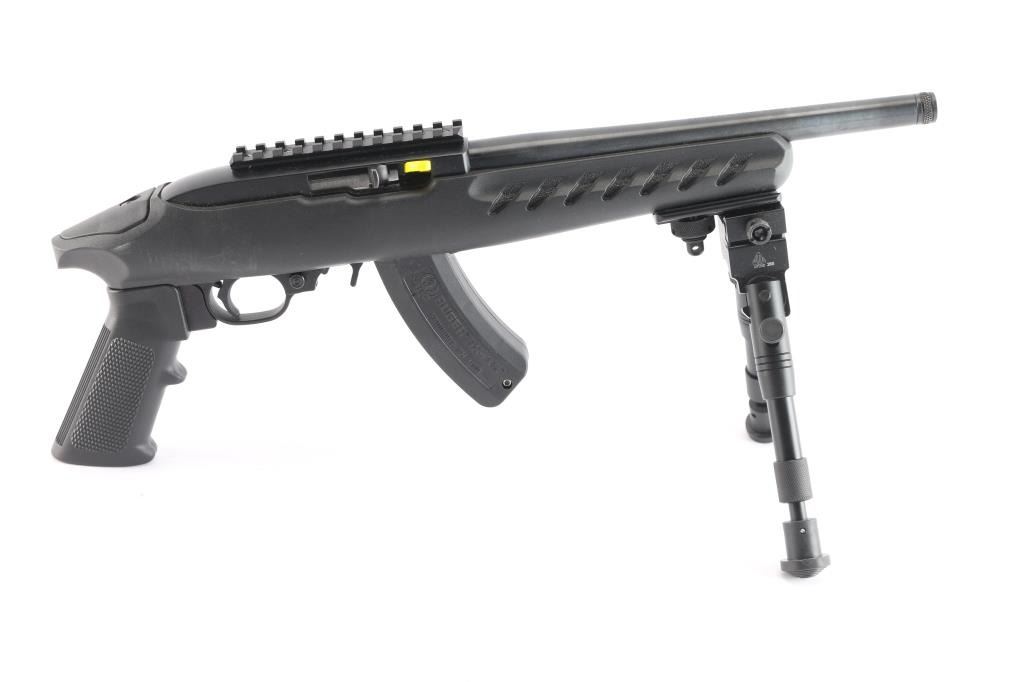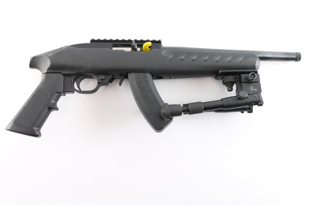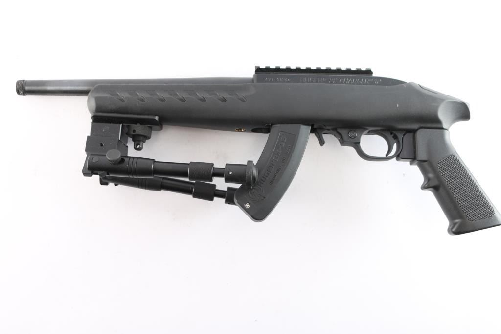 Semiautomatic pistol features 10" barrel with threaded muzzle & thread protector, scope rail on receiver top, accepts detachable magazines, manual safety, black polymer stock with pistol grip, bipod with folding legs. Overall condition is like new with few signs of handling. Includes (4) factory 15-rd magazines, factory box with matching label, manual, soft side carry case.
