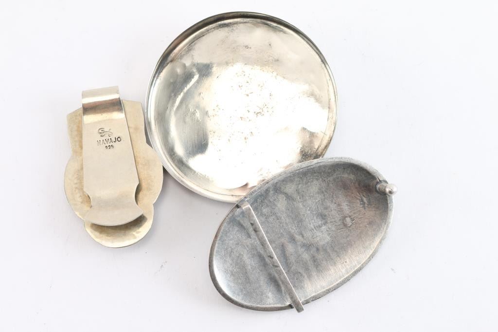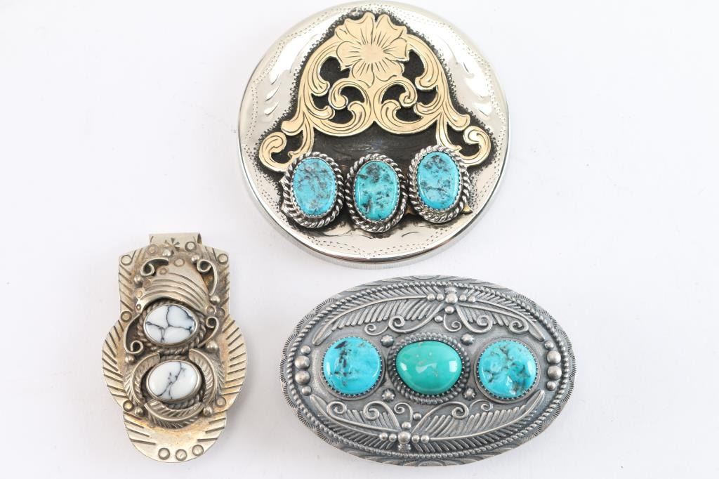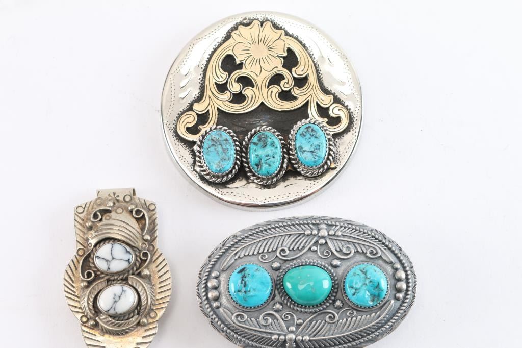 A) Pewter belt buckle with 3 turquoise stones; B) a Navajo sterling silver money clip featuring 2 white buffalo stones; and C) sterling silver lid with 3 turquoise stones for chewing tobacco or zyns cans.