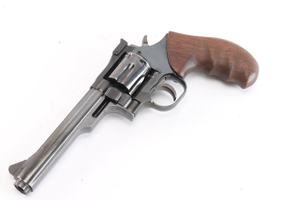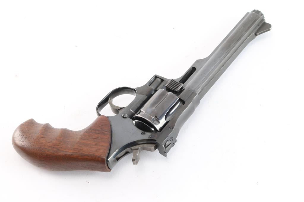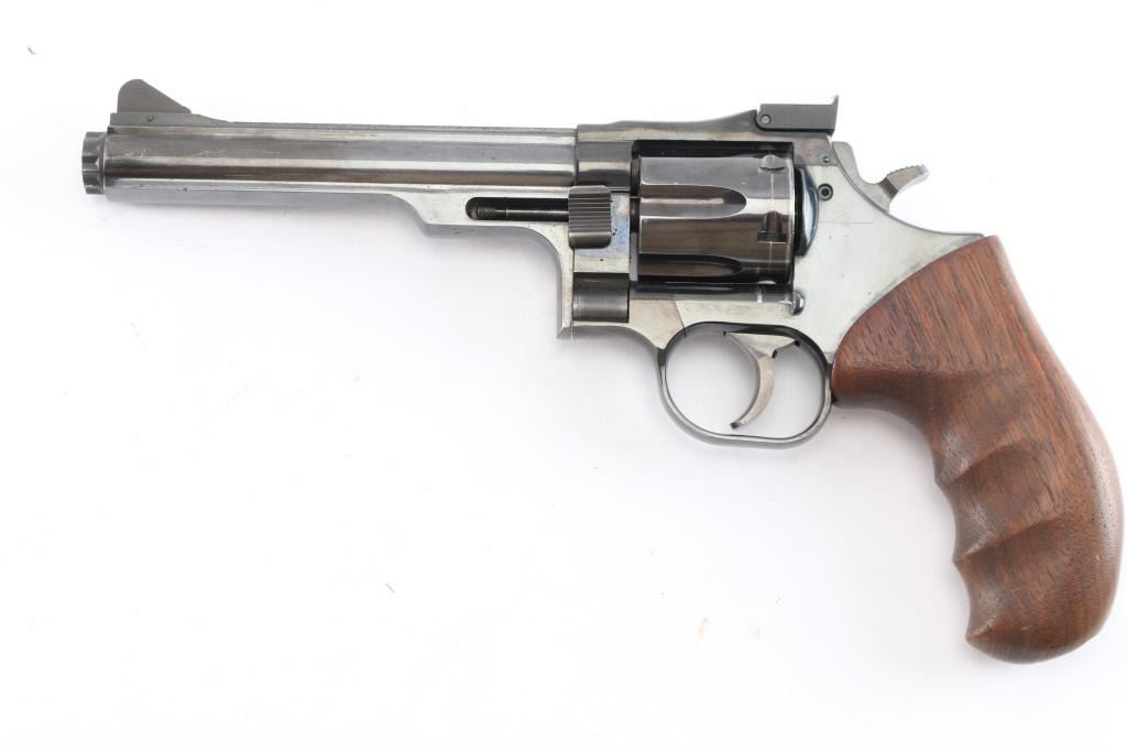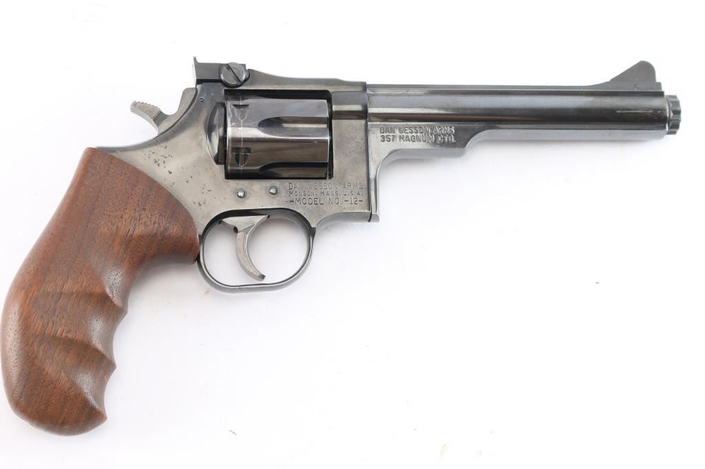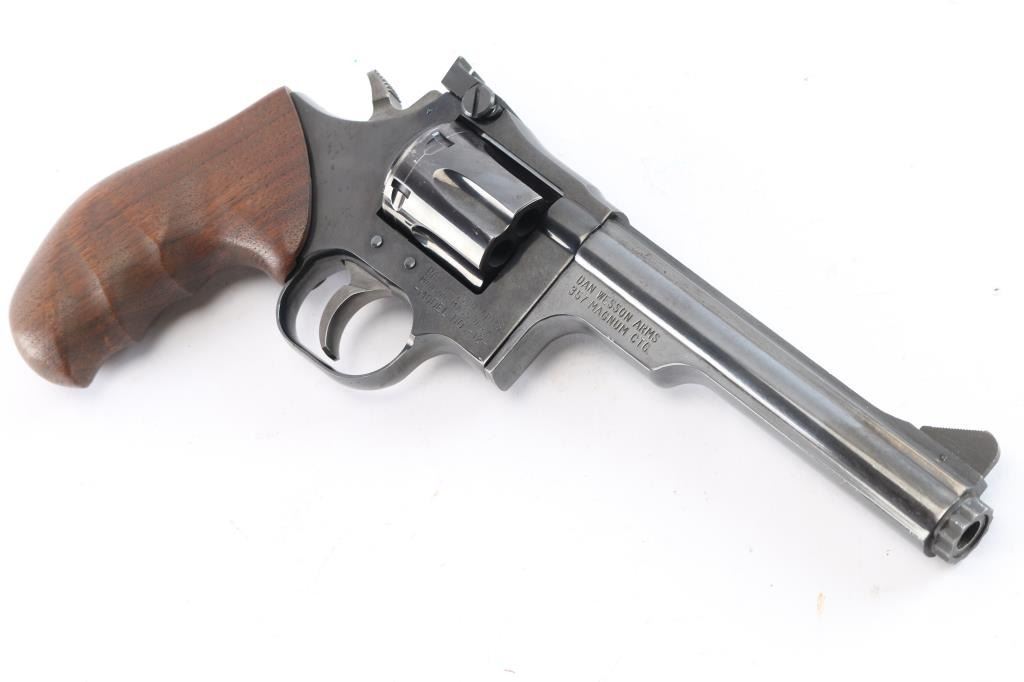 American made DA/SA six-round centerfire revolver chambered for .357 Magnum, manufactured between 1970 and 1971 in Monson, MA. This is an early Dan Wesson revolver that still marks the model on the right side of the frame. Revolver features a gloss blued finish, a 6-1/8" shrouded interchangeable barrel, serrated fixed blade front sight, micrometer adjustable notched rear sight, shrouded ejector rod with a knurled head, in-the-white wide smooth curved trigger, fluted six-round cylinder, serrated cylinder release located in front of the cylinder, 'porkchop' barrel shroud (ended in 1975), transfer bar safety, in-the-white external hammer with serrated spur, and single-piece Sacramento style smooth hardwood finger grooved grip (rounded at the heel for law enforcement carry). The original blued finish retained is approximately 94% with scattered light scratches, edge wear, losses at the rear of the cylinder, losses on the frame under the cylinder, and a drag line on the cylinder. Metal displays no deformation, but does show some small scattered spots of rust on the right side of the frame. The action is smooth and crisp. The hardwood grips are very good with light handling blemishes, and there is accidental chamfering around the screw hole. The bore is bright with strong rifling, and the cylinder chambers are also excellent.