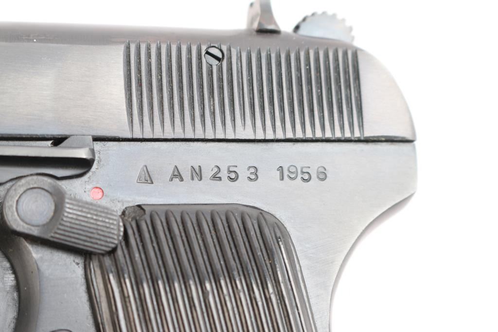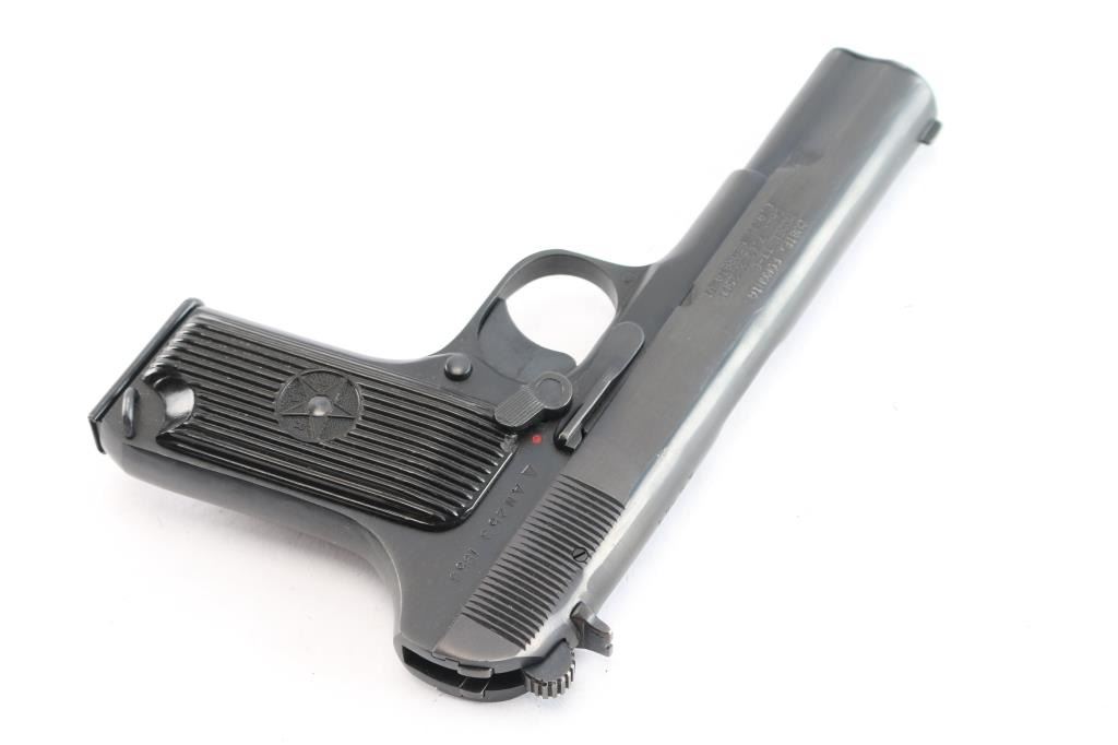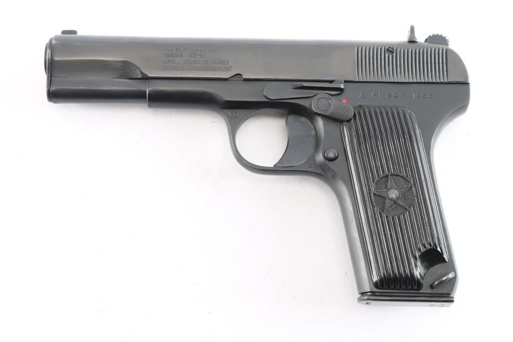 Romanian military semiautomatic pistol, dated 1956, copy of the Russian/Soviet TT-33 Tokarev. Features blued finish, ribbed black polymer "star" emblem grips, 4.4" barrel, fixed front blade & dovetailed rear notch sights, external serrated round hammer, single action trigger, pushbutton magazine release, lanyard loop at left bottom of frame. Modified with a manual safety on the left side of frame for importation. Bore is excellent/bright condition. Retains 97% of finish with two small dents and rub marks on right side of slide. Importer marking on left side of slide, Grips are excellent. Includes one magazine.