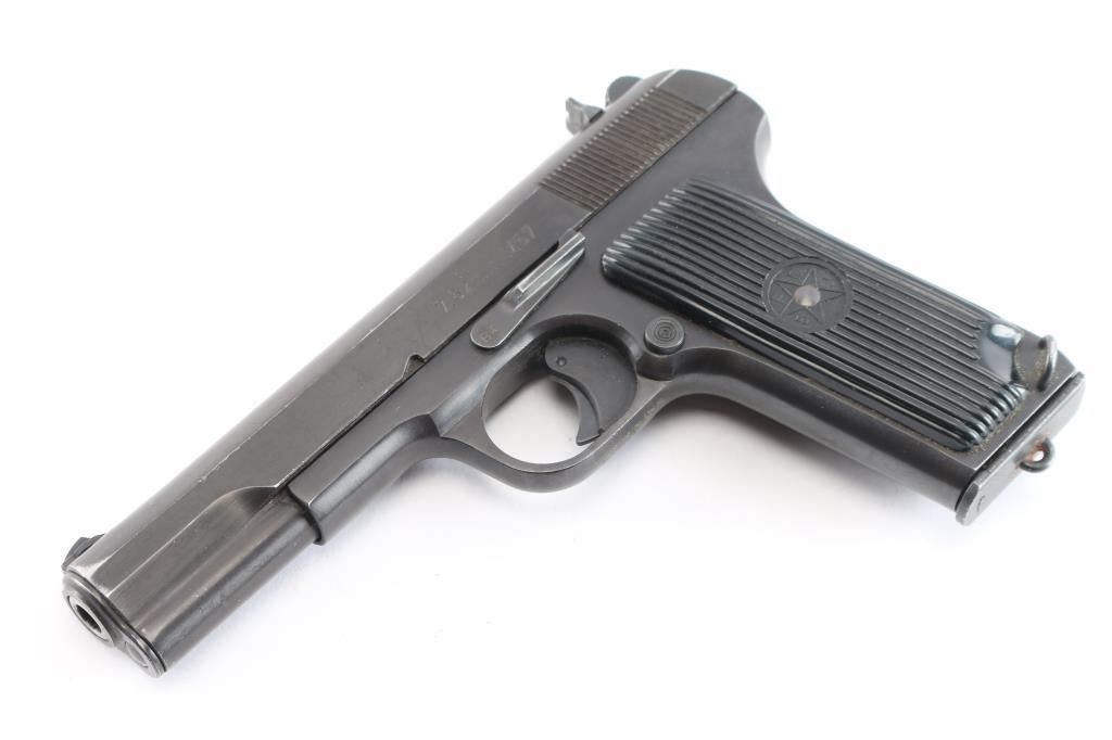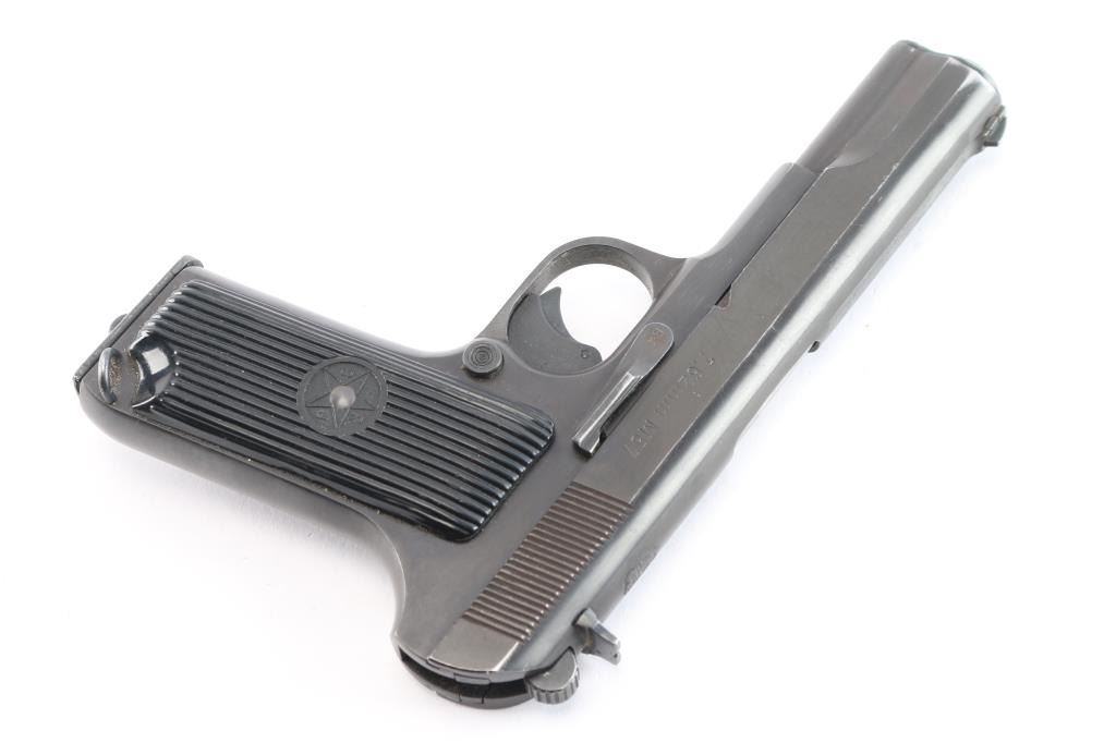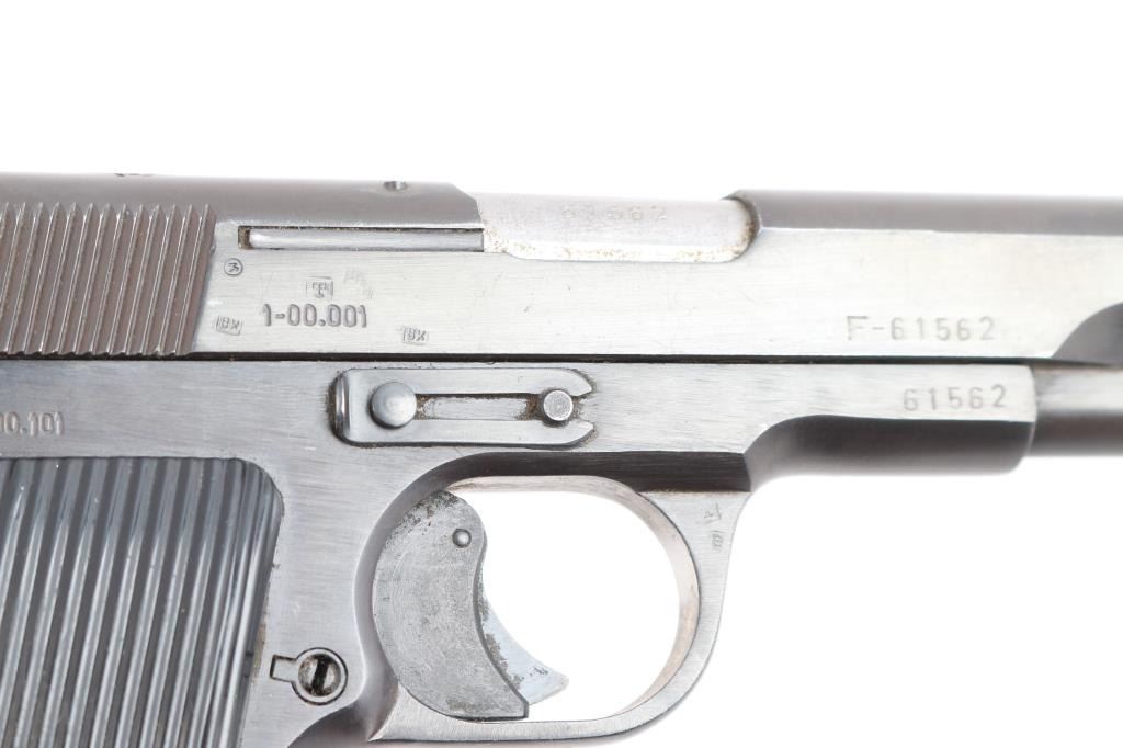 Serbian made single action semi-automatic Tokarev type military pistol chambered for 7.62x25mm ammunition, manufactured circa 1968. Imported by Armamentos Inc. out of Lake Worth, FL. Pistol has a slightly longer frame, and takes a longer magazines than the standard TT-33's. Pistol features a blued finish, an approximately 4.5" barrel, dovetailed serrated fixed blade front sight, dovetailed 'U' notched fixed rear sight, detachable magazines, annular cut push-button magazine release, magazine disconnect, two-piece grooved plastic grips with "SFRJ" star on both sides, external hammer with serrated spur, full-length metal guide rod, lanyard loop on the left side of the grip heel, single action curved trigger with integral safety, and smooth grip straps. The Yugoslavian crest is marked on top of the slide. Serial number match on frame, slide, and barrel. The original blued finish retained is approximately 94% with edge wear on the slide, and scattered light scratches and dings. Metal displays no rust or deformation. Bore is bright with strong rifling. Black plastic grips are in excellent condition with very light scattered blemishes. The action is smooth, but the trigger is a little rough to operate. Pistol includes one magazine total with a lanyard loop base.