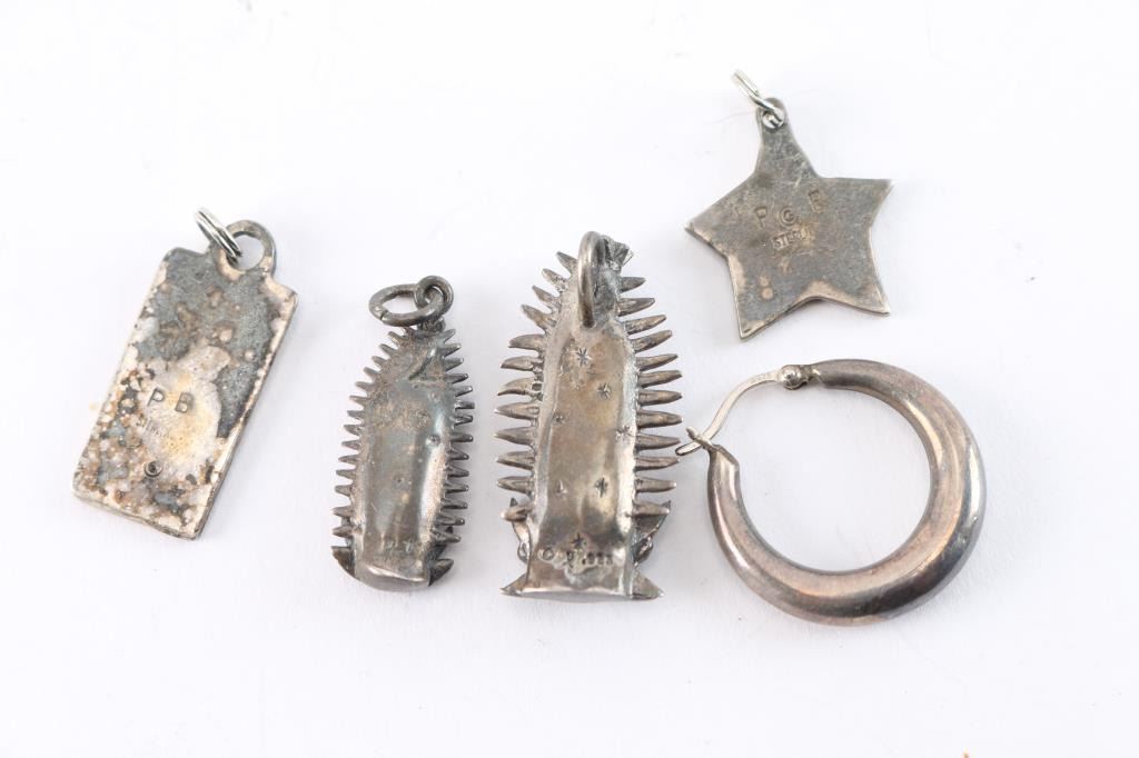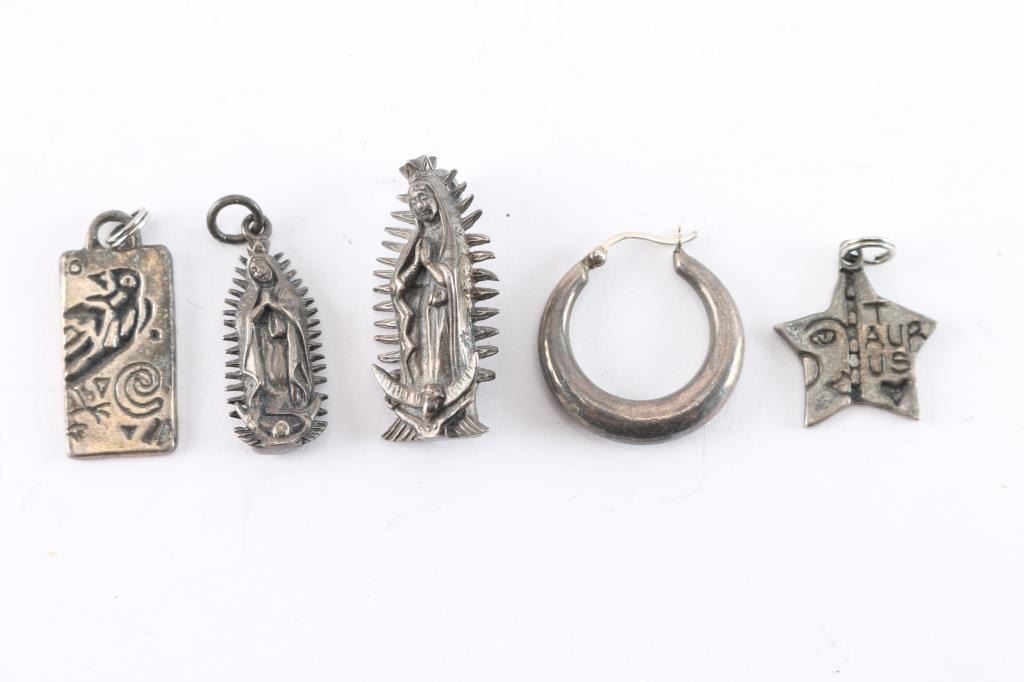Two Virgin Mary pendants, sterling silver; a raven stamped pendant; a star shaped Taurus silver pendant and a single sterling hoop. 26 grams.