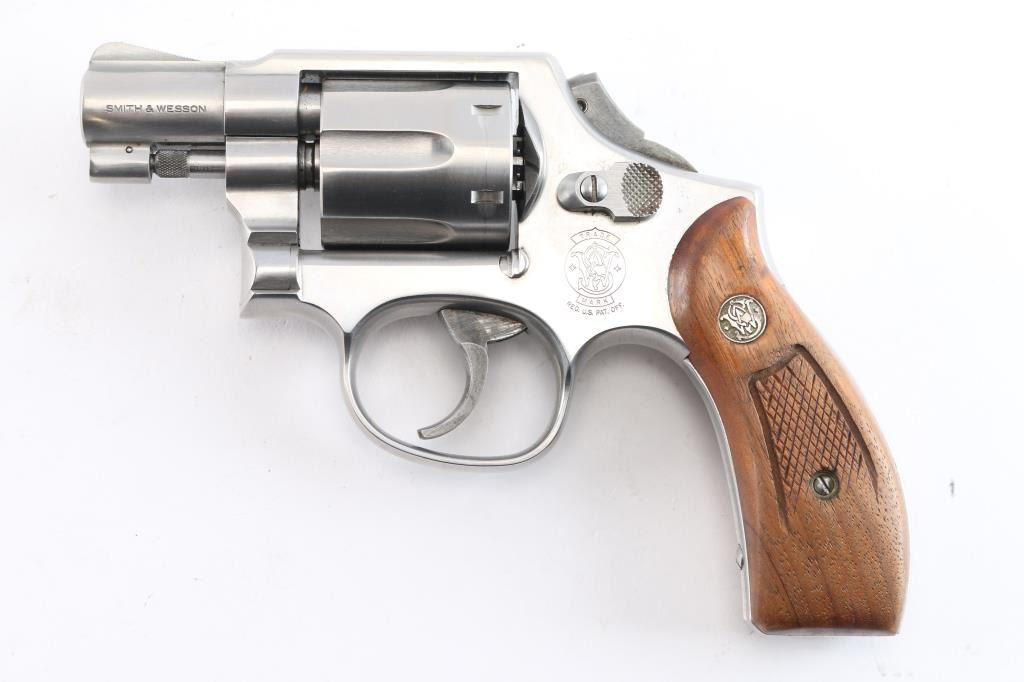 'The .38 Military and Police Stainless,' an American made double-action only (DAO) revolver chambered for .38 Special. The Model 64-4 was released in 1988 and the modifications include a new yoke retention system, radius stud package, hammer nose bushing, and a floating hand on this 2" tapered barrel version. Revolver features a polished stainless steel finish, serrated ramped front sight, notched frame rear sight, six-round fluted cylinder, un-shrouded ejector rod with knurled ejector rod head, checkered cylinder release, round butt 'K' service frame with three screws, color-case bobbed hammer, firing pin on hammer nose, transfer bar safety, color-case smooth curved combat trigger, serrated grip straps, and checkered walnut grips with gold toned Smith & Wesson medallions. The original stainless finish retained is approximately 98% with superficial scratches, a drag line on the cylinder, and a brush mark behind the right side of the recoil shield. Metal displays no rust, but there is slight deformation in the grip screw slot. Action is smooth and crisp with a tight lock-up. Bore is bright with strong rifling, and cylinder chambers are excellent. Walnut grips are fair but serviceable, it appears that the bottom of the grip panels were sanded to change the profile. Approximately half of the grip panel's checkering remains.