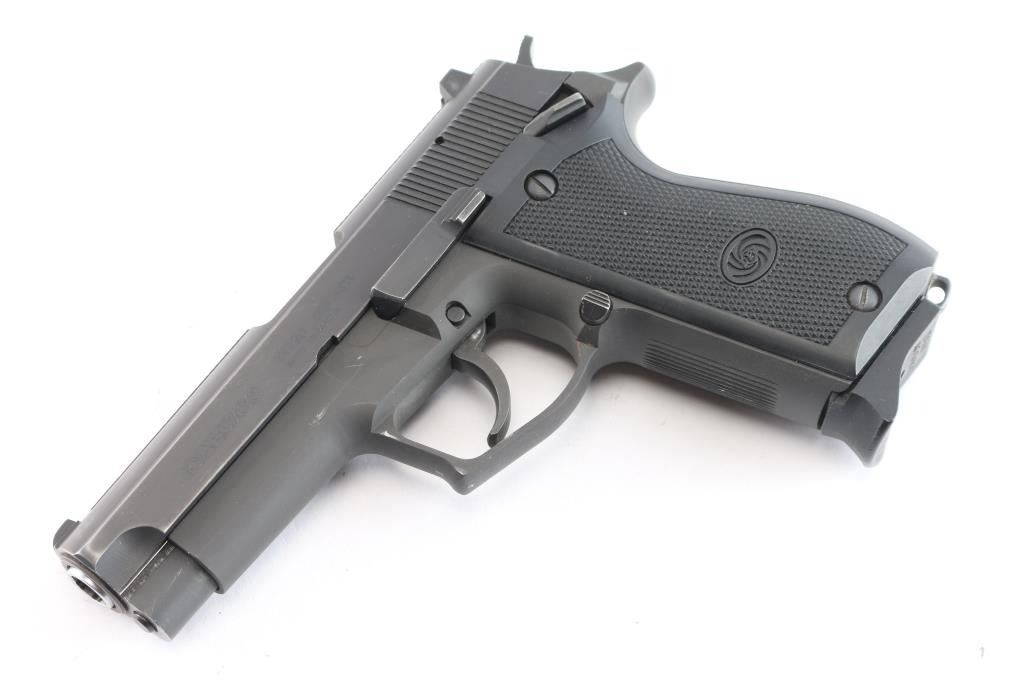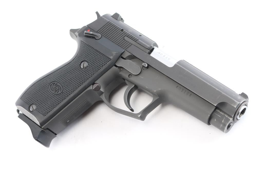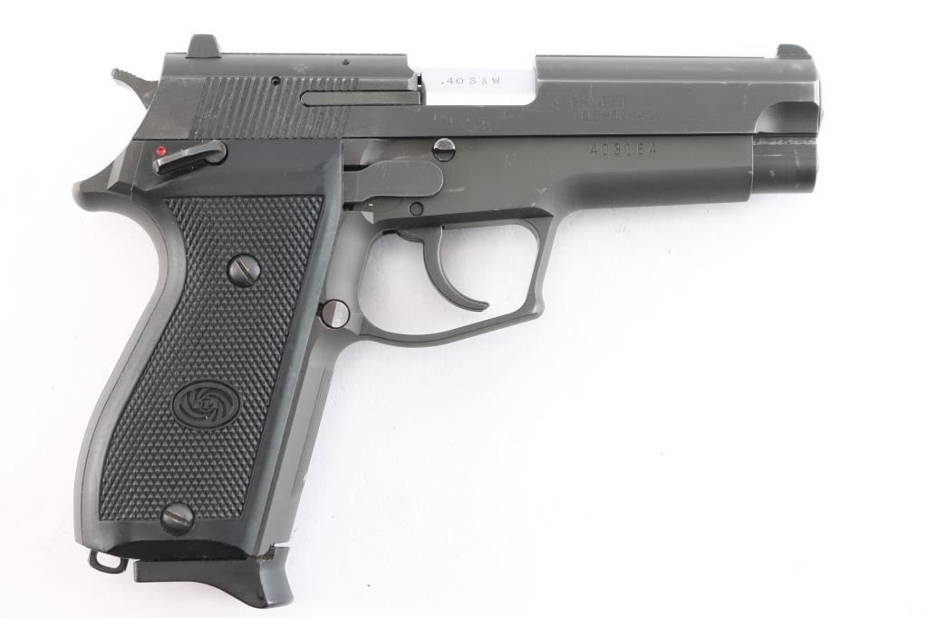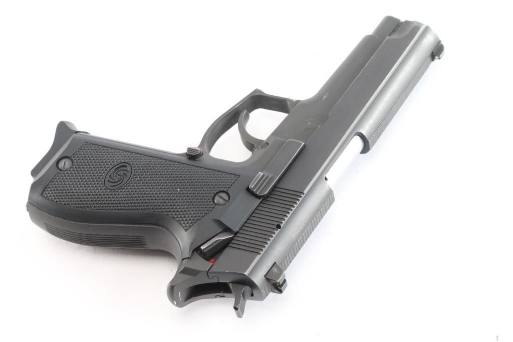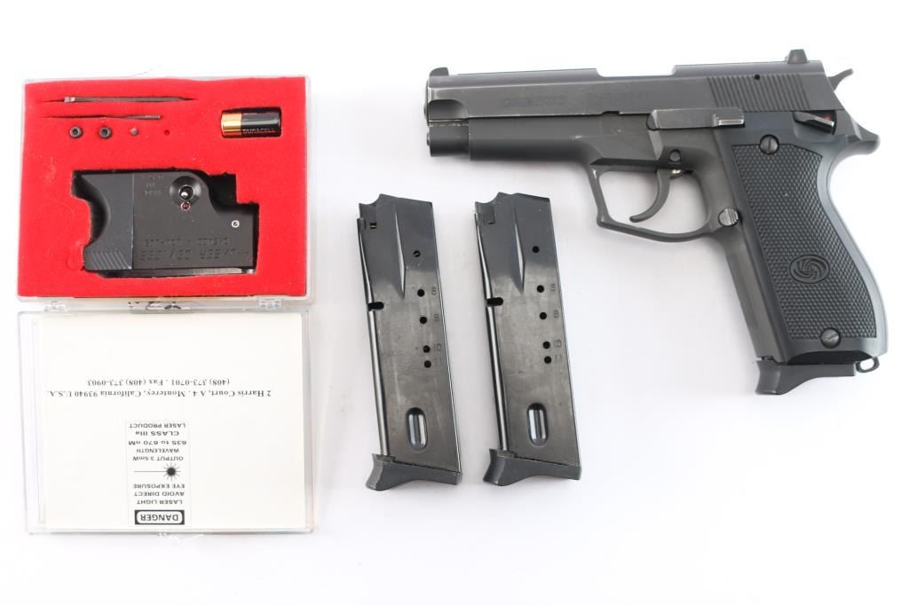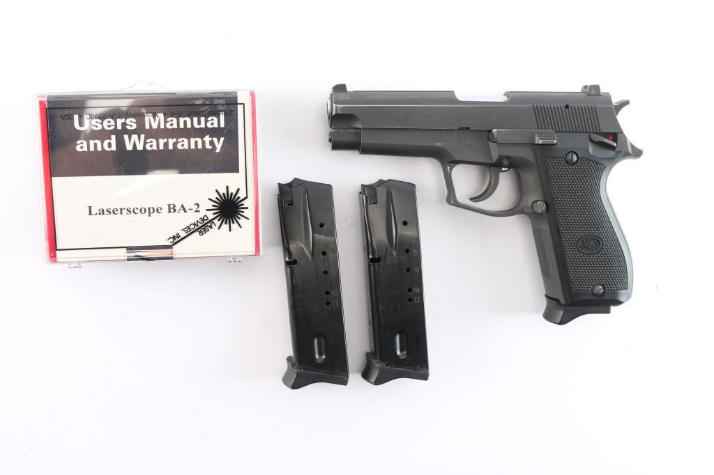 Korean made DA/SA delayed blowback semi-automatic centerfire pistol chambered for .40 Smith & Wesson, and imported by B-West out of Tucson, AZ. This firearm was introduced in the early 1990's, and continued through the late 1990s. Manufacturing was done primarily in South Korea. Most pistols were produced between 1993 and 1998 before the models discontinuation. Pistol features a 4.17" barrel, fixed blade front sight with white dot, dovetailed square notched rear sight with white dots, tri-action smooth curved trigger, aluminum frame, external hammer with a serrated spur, serrated grip straps, ambidextrous frame mounted manual safety, serrated slide stop, lanyard loop on heel of grip, serrated push-button magazine release, and full-length metal guide rod. The original matte black finish retained is approximately 94% with edge wear, and scattered scratches and nicks. Metal displays no rust or deformation. The action is smooth and crisp, and the black plastic grips are in excellent condition. Bore is bright with strong rifling. Pistol includes three eleven-round magazines total, and a Daewoo LOM-109 laser.