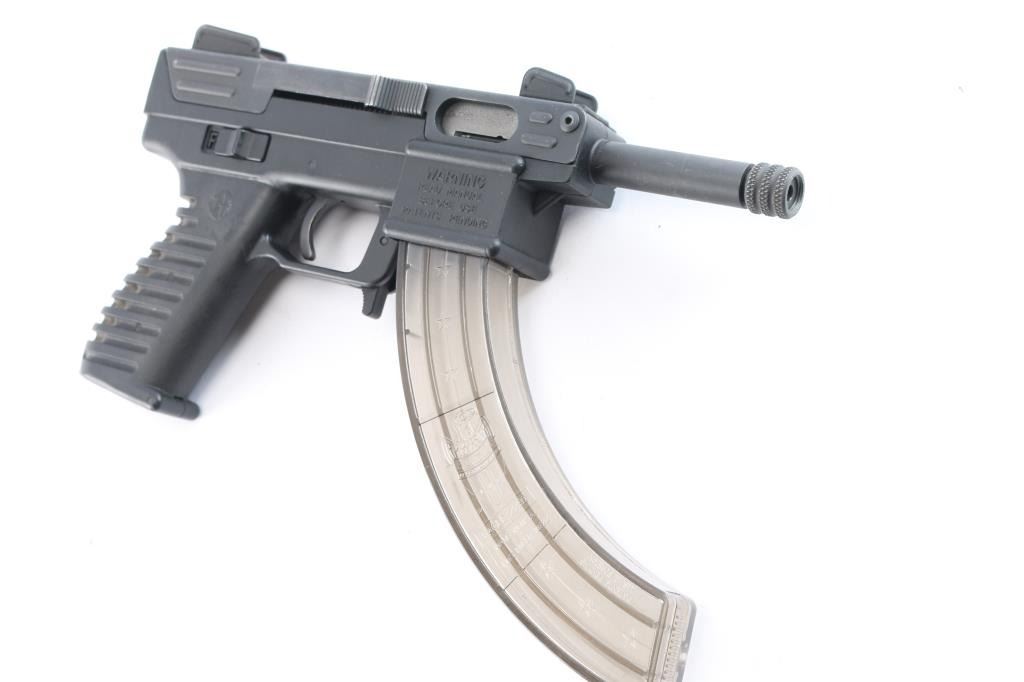 Semi-automatic. Blowback-operated pistol that takes 10/22 magazines. Ambidextrous safety, and charging handles. Single piece frame is molded ABS plastic. Stamped steel receiver cover with open iron sights. Missing the front sight post. Storage compartment in grip. 4" barrel. Matte black finish. Bore appears excellent/bright. Threaded muzzle. Metal finish has some minor scratches/rubs. Action is crisp/tight. Comes with a clear plastic Eagle2230 30-rd double stack magazine.