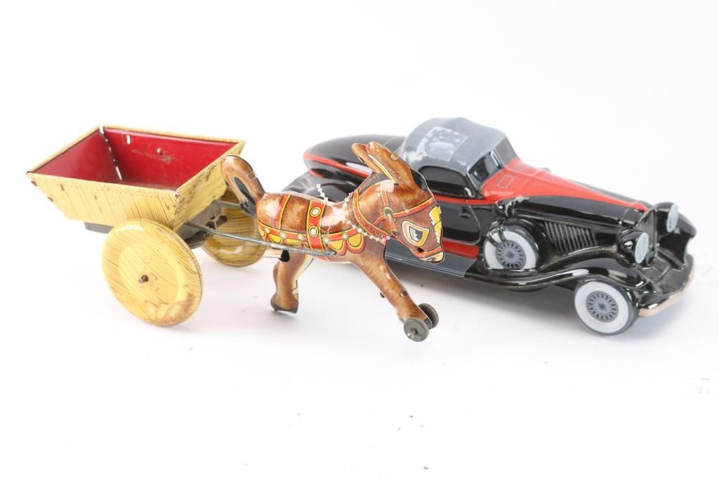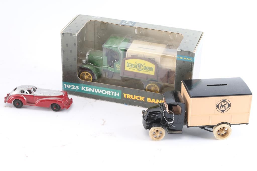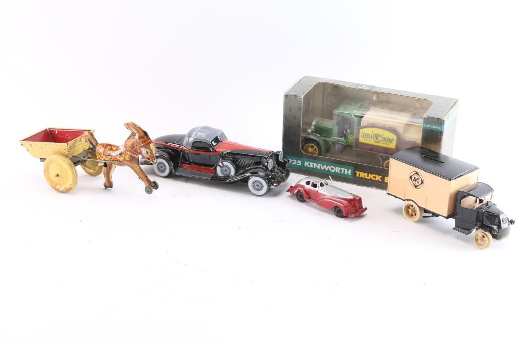 Including 1925 Kenworth truck bank in original packaging; Avon 1932 Auborn porcelain car; A.C. delivery truck made by Mack Manoli, a red toy car; and a vintage Marx donkey and cart wind up toy.