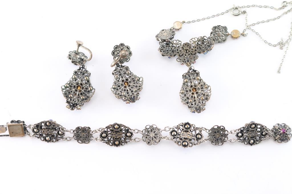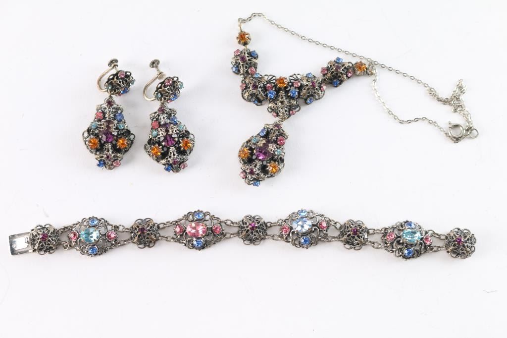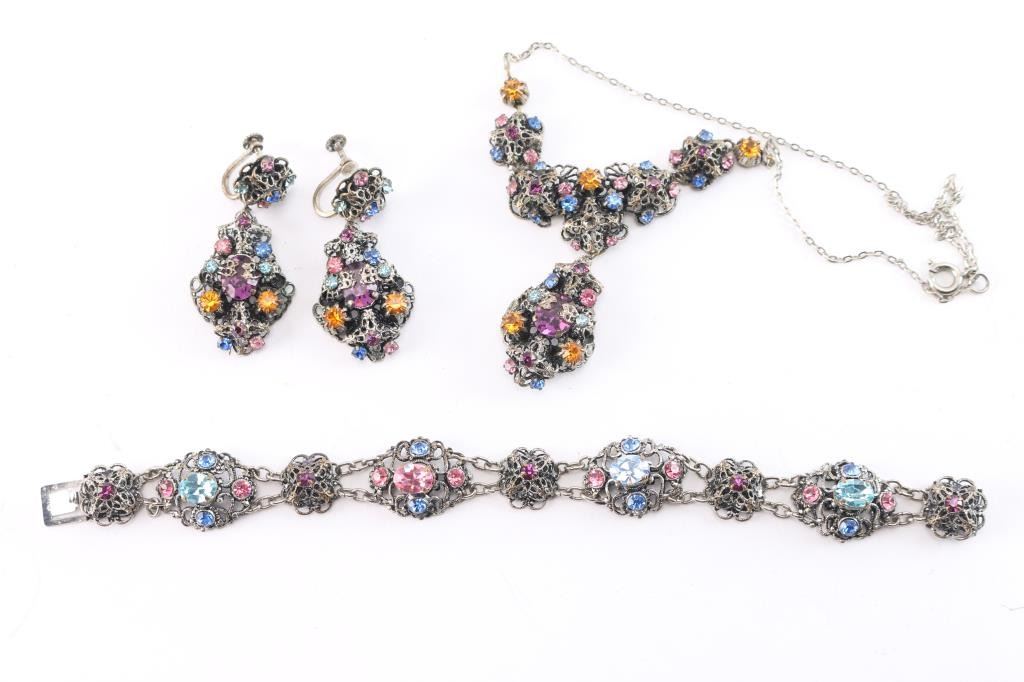 Includes necklace, earrings and bracelet. Ornately made with sparkling purple, orange, blue and aqua rhinestones. Unmarked.