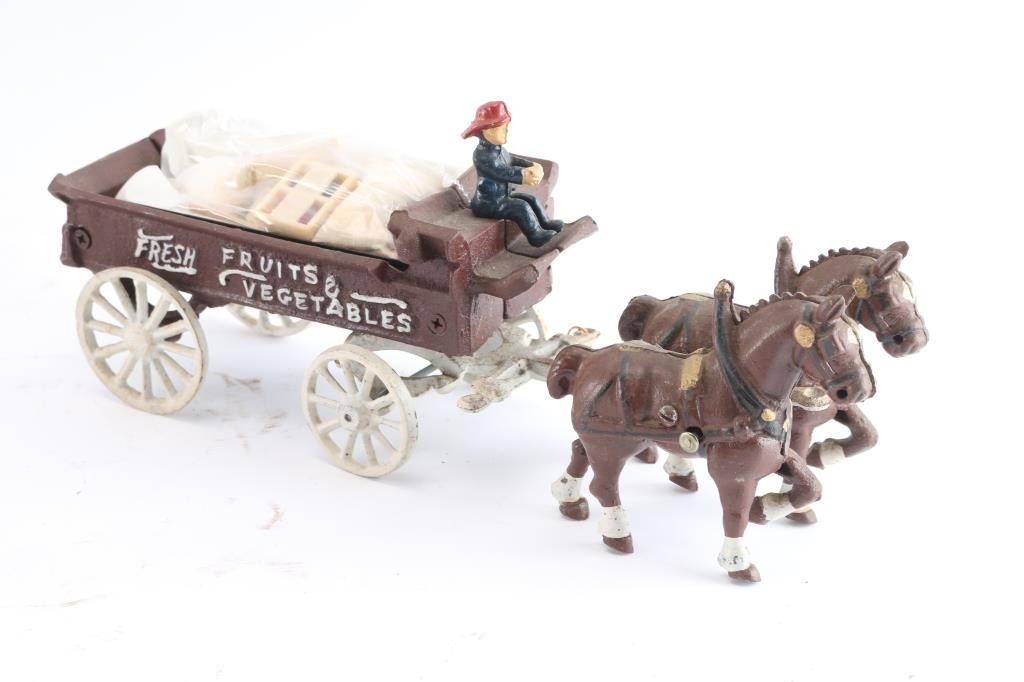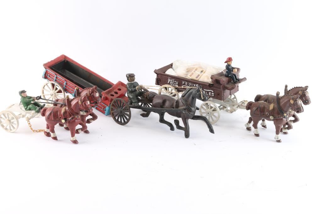 Including: a double horse fire wagon; fresh fruit and vegetable cart with a double horse carriage; a single horse racing wagon. Unknown ages.