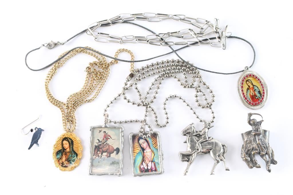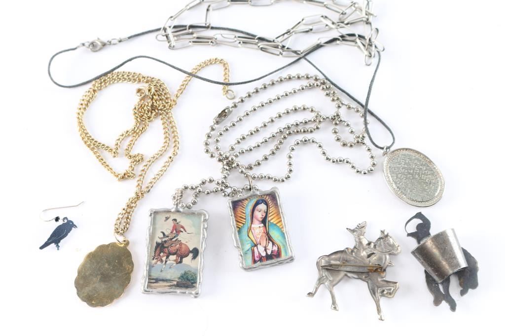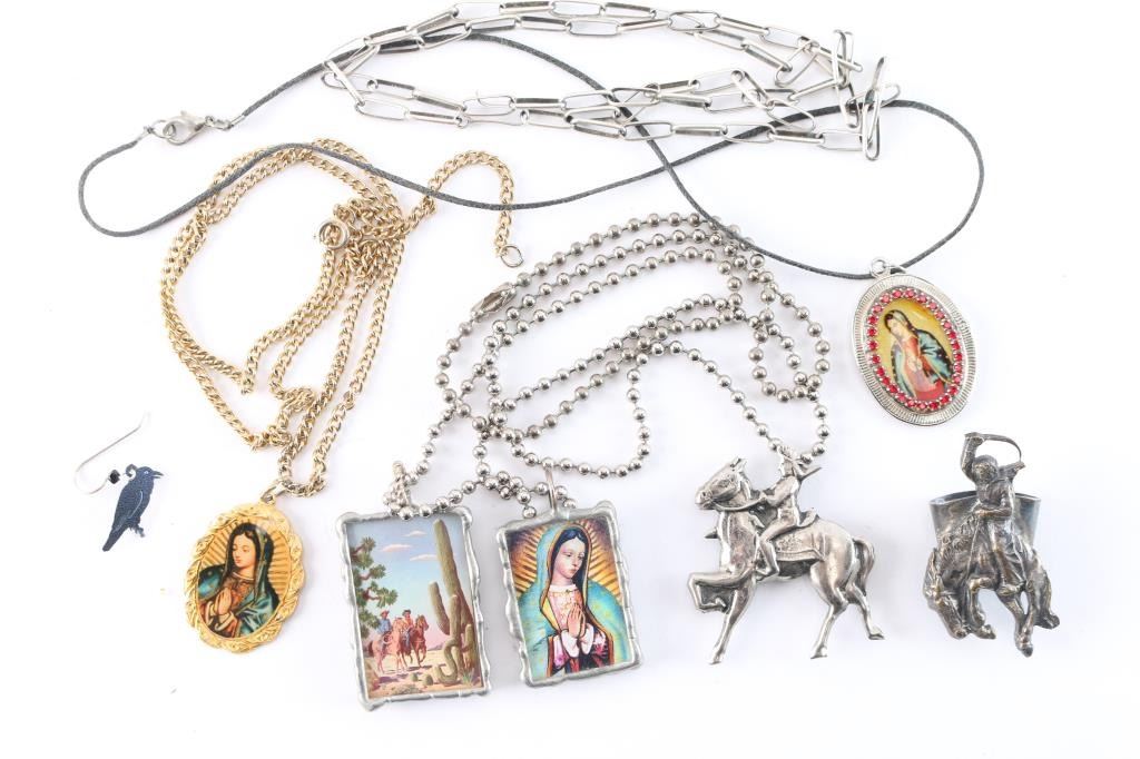 Includes two shadow box pendants, one with Virgin Mary, one with western scene on chains; an Indian on horseback pin; Virgin Mary pendant on leather necklace; a Virgin Mary on chain; a sterling bronco rider handkerchief keeper; paperclip sterling chain.