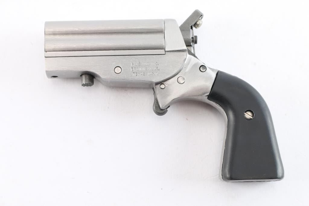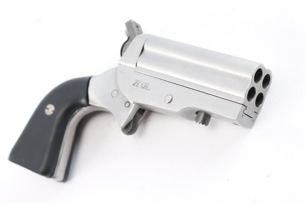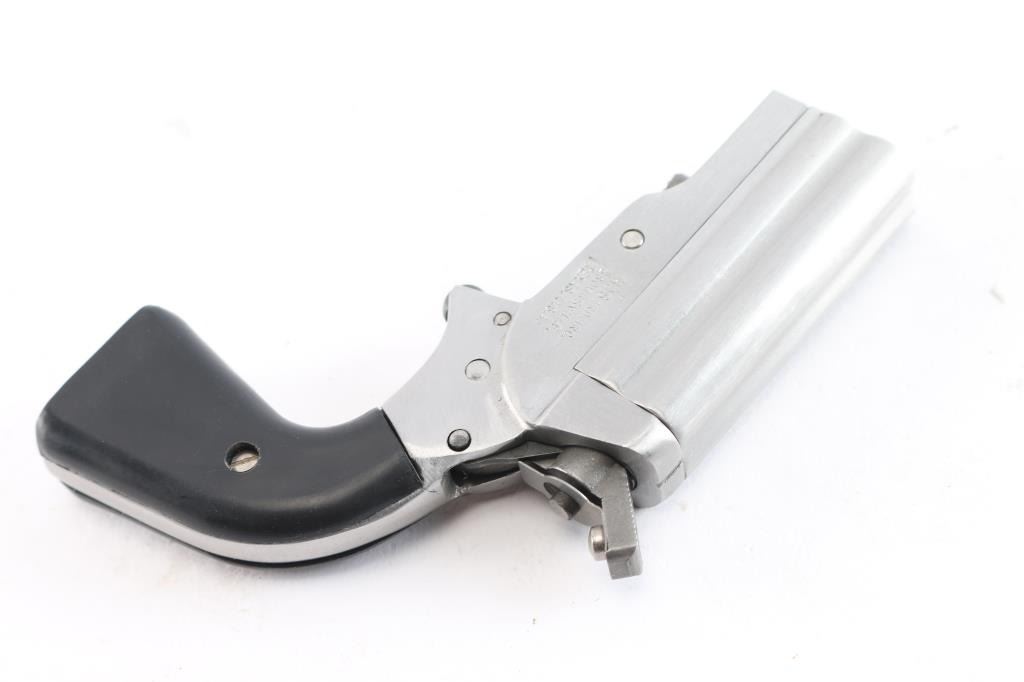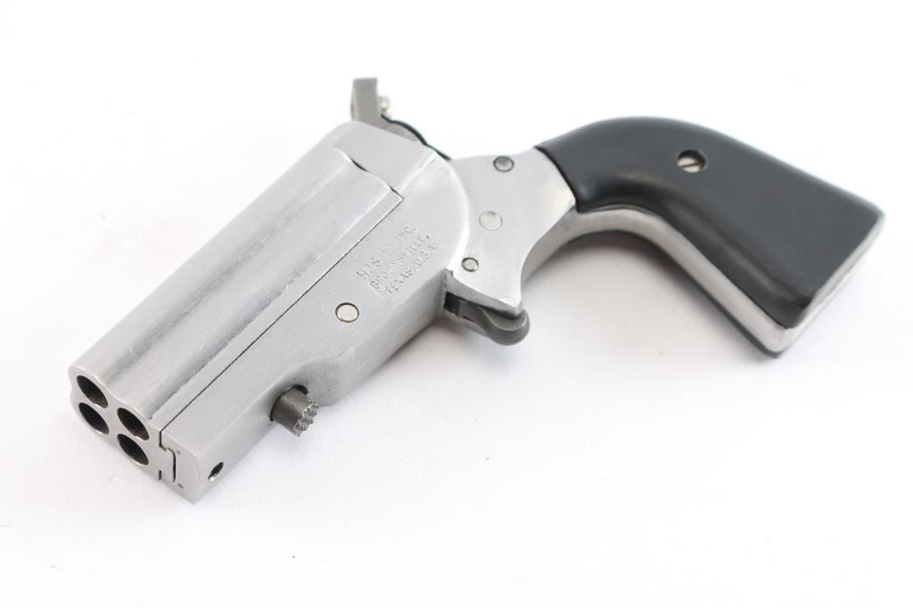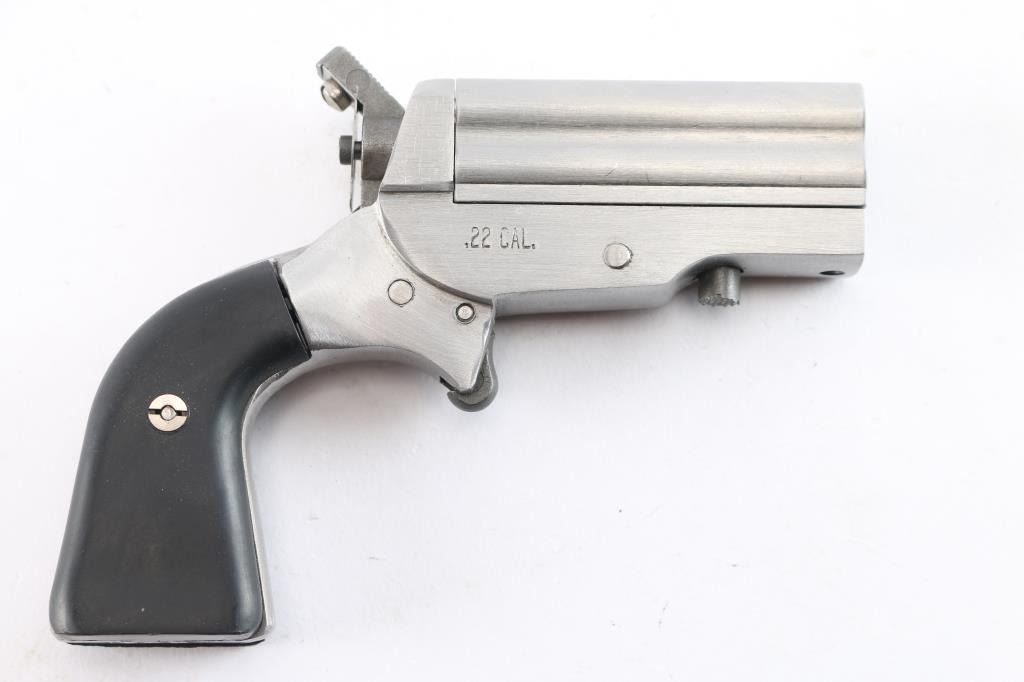 American made four-round single-action rimfire Derringer style pistol chambered for .22 Long Rifle. Manufactured in the 1990's in Brownville, TX. Pistol features a brushed stainless finish, four 2" barrels, grooved frame sight, rotating firing pin system, checkered barrel release, smooth spur trigger, external hammer with serrated spur, square butt frame, smooth grip straps, and two-piece smooth black polymer grip panels. The original brushed stainless finish retained is approximately 99% with nothing remarkable. Metal displays no rust or deformation. Bores are bright with strong rifling, but they are a little dirty. The black polymer grip panels are in excellent condition, and the action is smooth and crisp. The rotating firing pin is broken and in need of replacement.