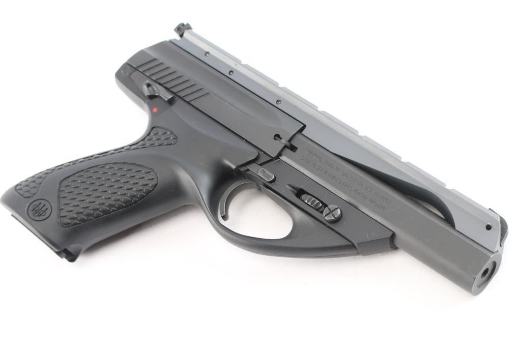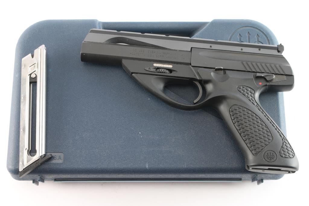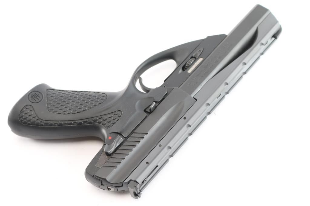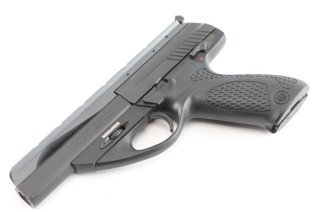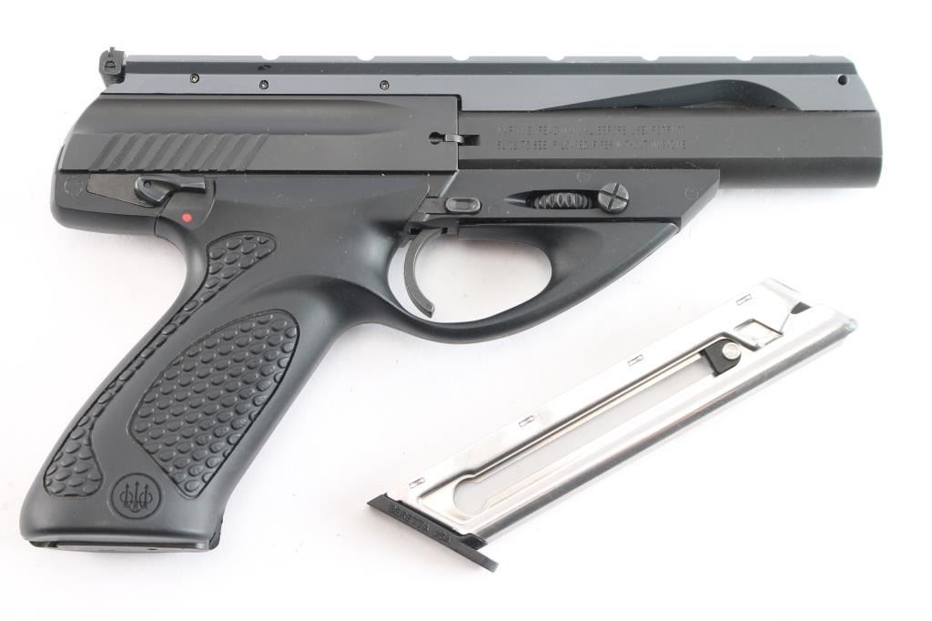 Italian semi-automatic blowback rimfire pistol chambered for .22 Long Rifle, and manufactured by Beretta USA, Accokeek MD. These pistols have been produced in the United States since 2002. Pistol features a matte black finish and a polymer frame, a 4-1/2" interchangeable barrel with recessed target crown, integral scope rib, fixed blade front sight, micrometer adjustable square notched rear sight with white outline, frame mounted ambidextrous manual safety, cocking indicator, right side index finger push-button magazine release, and black polymer pebbled grip with smooth straps and Beretta logos. The slide and frame have a matte black finish, while the optics rail displays a grey finish. The original matte black finish retained is approximately 99% with superficial blemishes. The scope rail has a very small amount of edge wear, but is otherwise in excellent condition. Metal displays no rust or deformation. The black polymer frame is in excellent condition, and the action is smooth and crisp. Bore is bright with strong rifling. Pistol includes the original foam lined factory hard case, two magazines total, warranty booklet, factory tool, and lock.