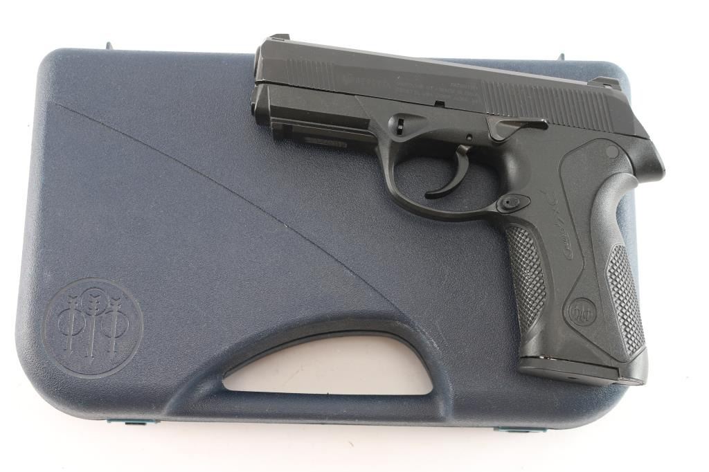 Italian made double-action only semi-auto centerfire pistol chambered for .40 Smith & Wesson, manufactured circa 2008. Pistol features a matte black Bruniton finished slide, a 4" chrome lined blued rotating barrel, dovetailed blade front sight with white dot, dovetailed square notched rear sight with white dot, front and rear slide serrations, smooth curved trigger, full-length polymer guide rod assembly, bobbed hammer, fourteen-round factory magazines, checkered push-button magazine release, serrated slide stop, accessory rail on dust cover, interchangeable backstraps, and black polymer frame with texturing on the grip straps. The original black Bruniton finish retained is approximately 96% with light scattered scratches, edge wear, and most of the blemishes around the muzzle. Metal displays no rust or deformation. The action is smooth and crisp, and the polymer frame is very good to excellent with edge wear around the magazine well. The bore is bright with strong rifling. Pistol includes original foam lined factory hard case, two fourteen-round magazines total, cable lock, two extra backstraps, and owner's manual.